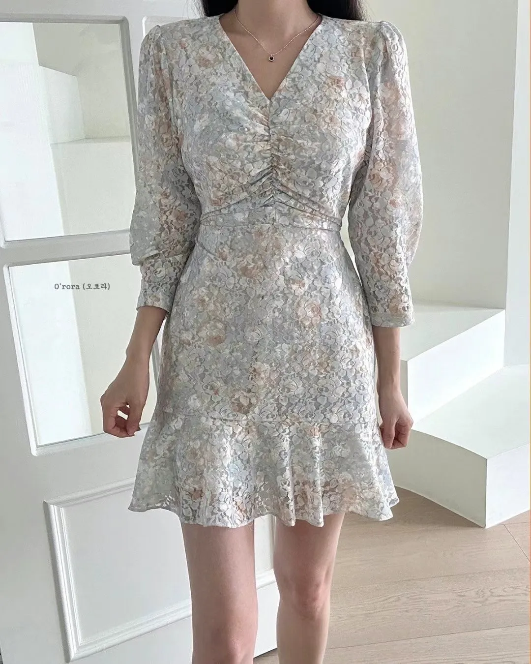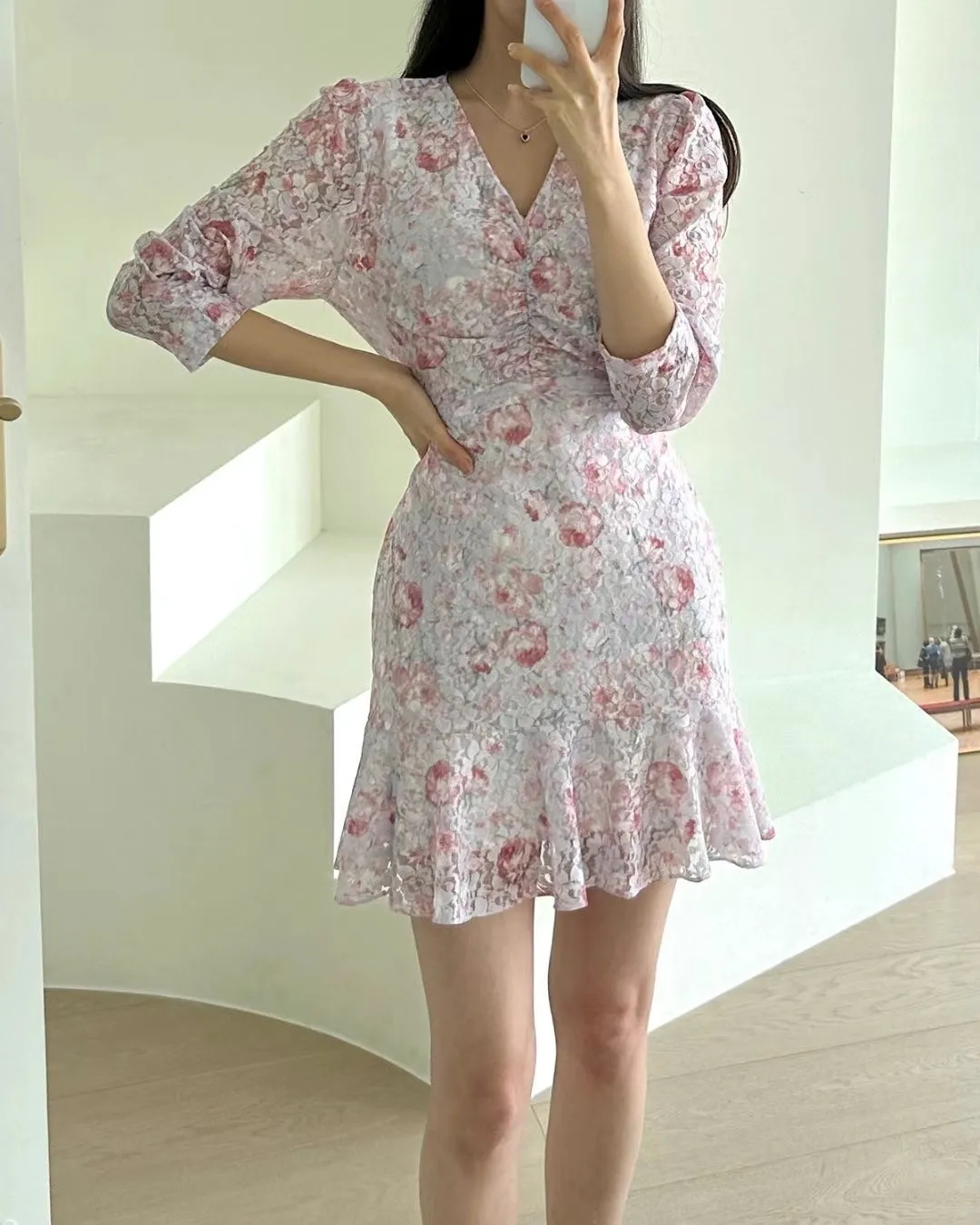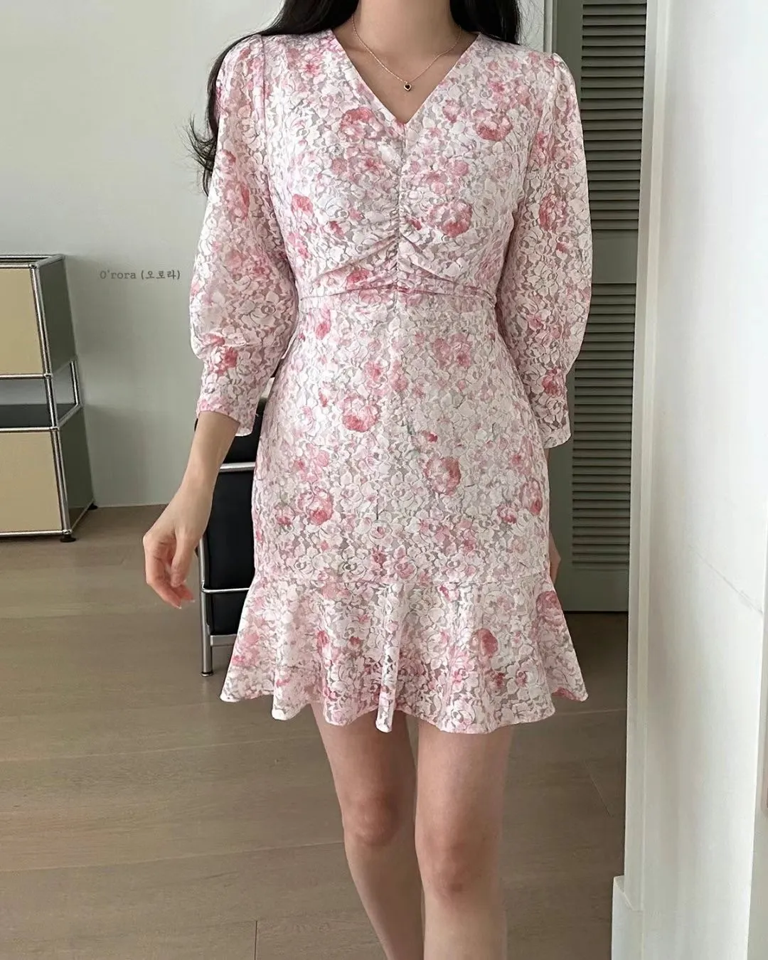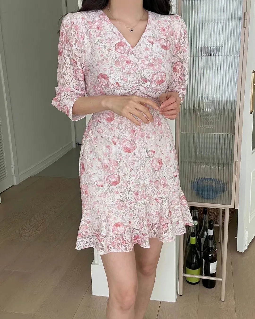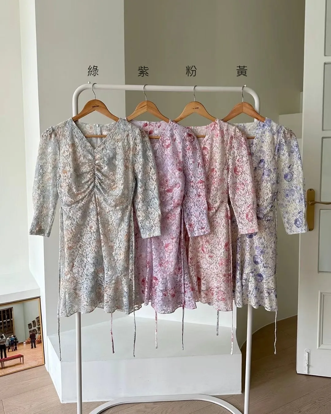 TA651玫瑰花V領胸抓皺七分袖洋裝 粉 綠 紫 黃 官網價$1220 線上價$1190