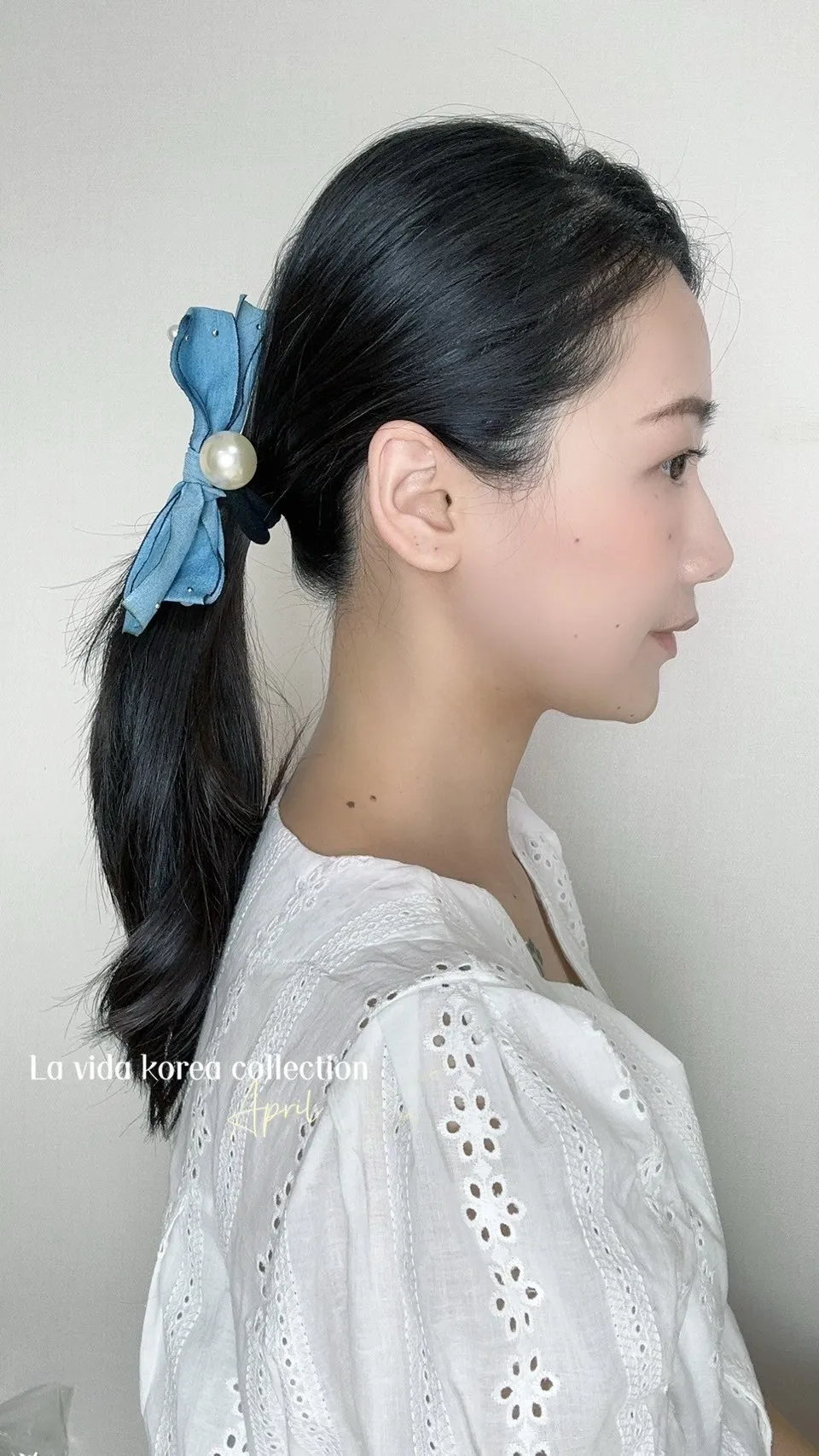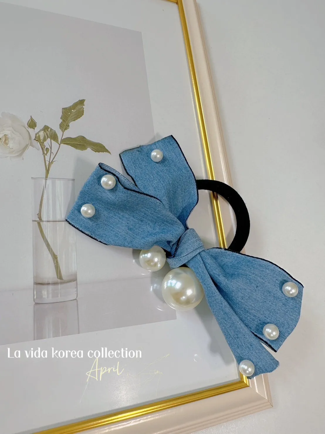 TA681丹寧淺藍色多珍珠髮圈