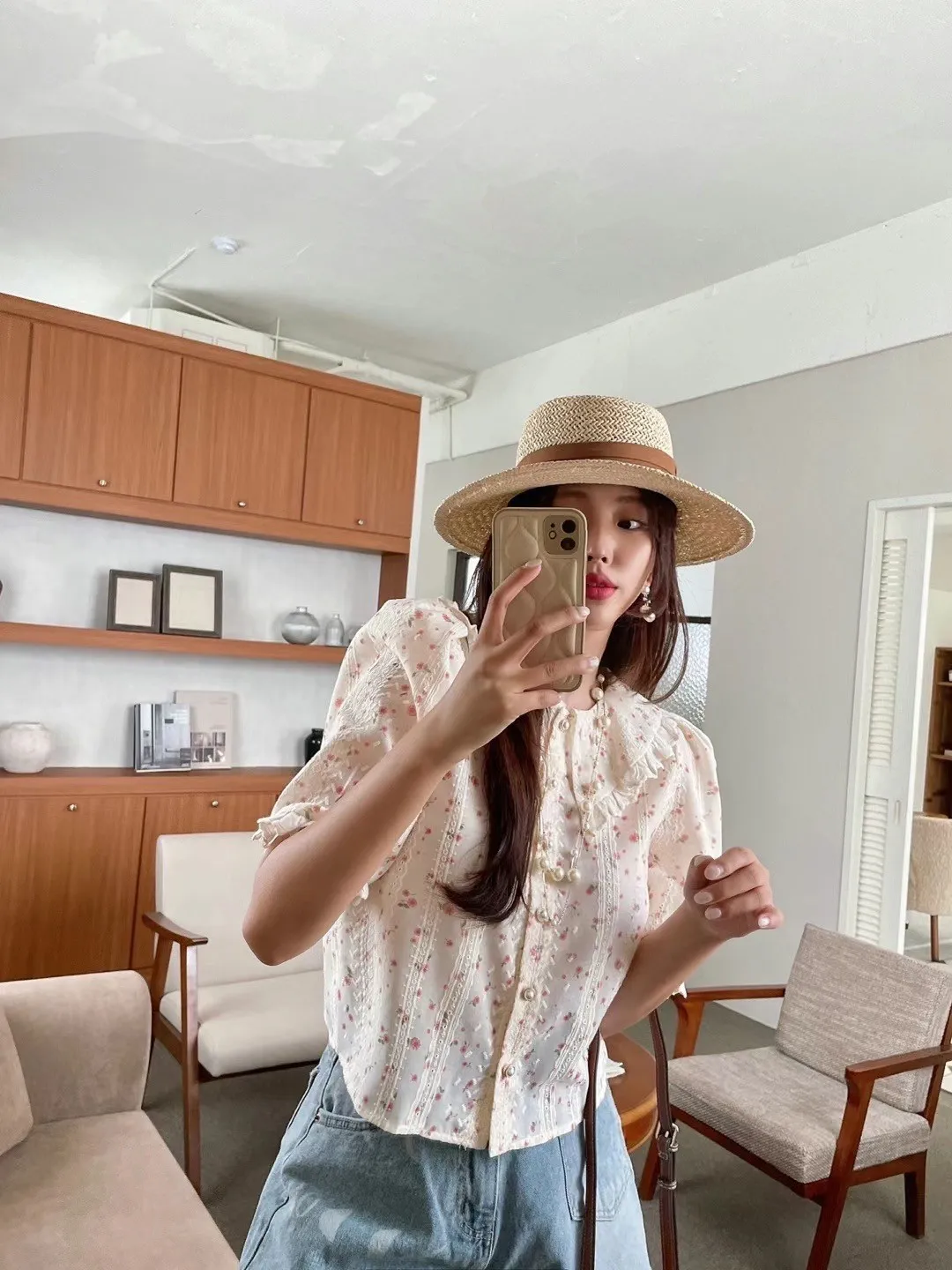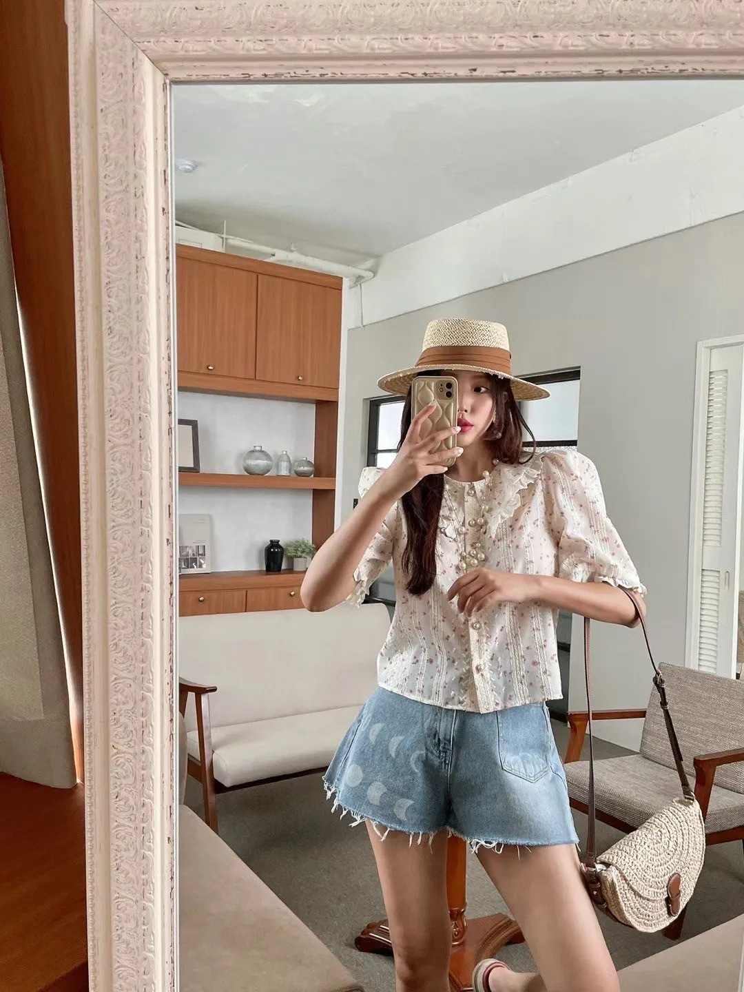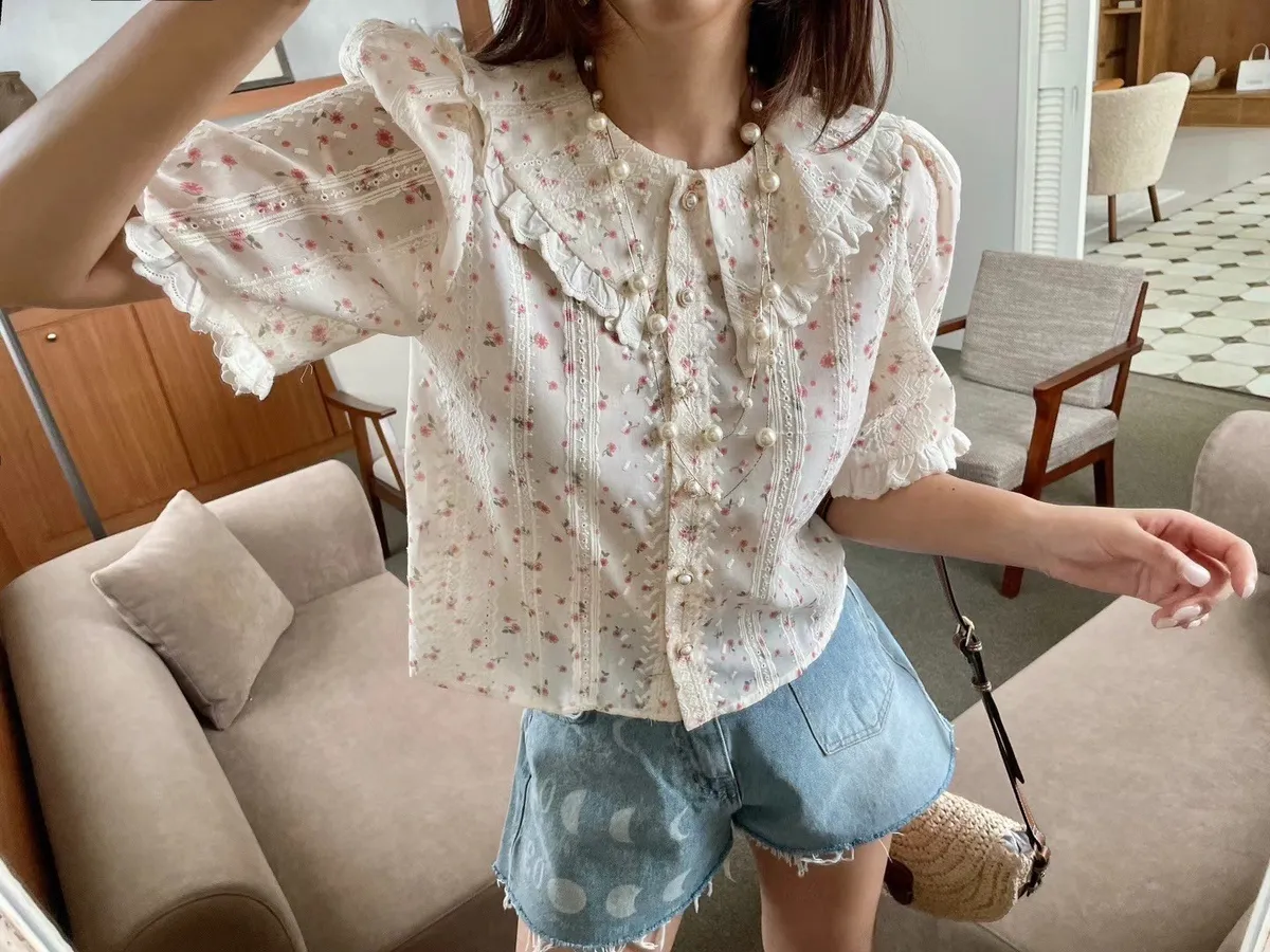 TA710精緻小花美領透光上衣 藍 紅 官網價$1220 線上價$1190