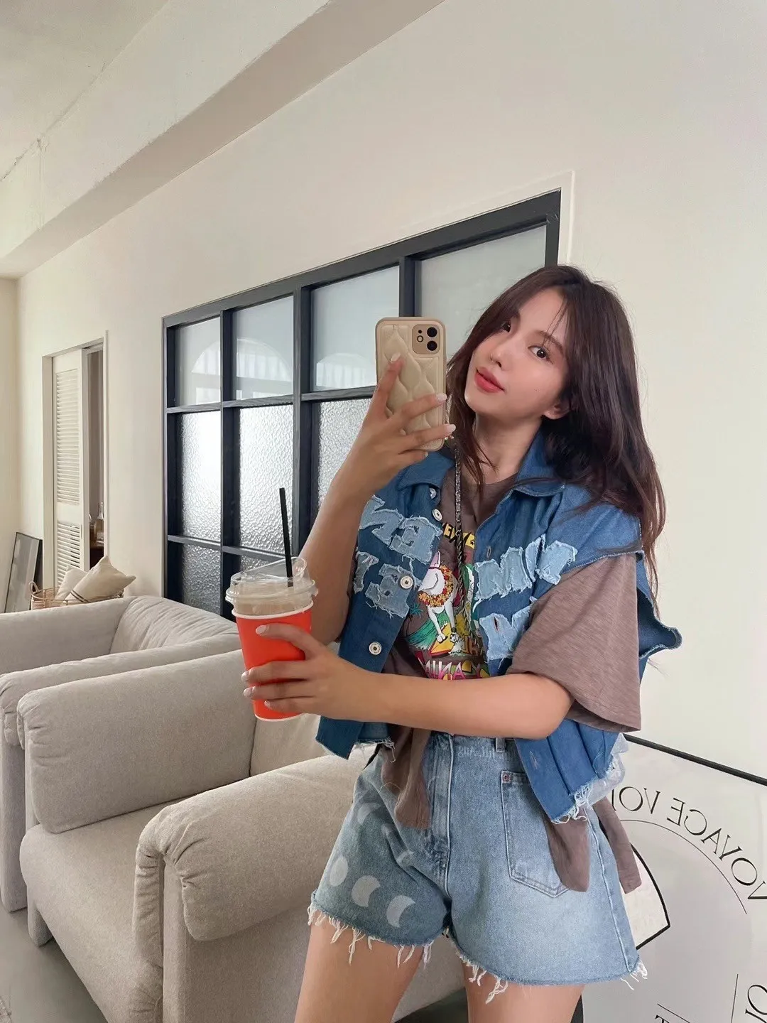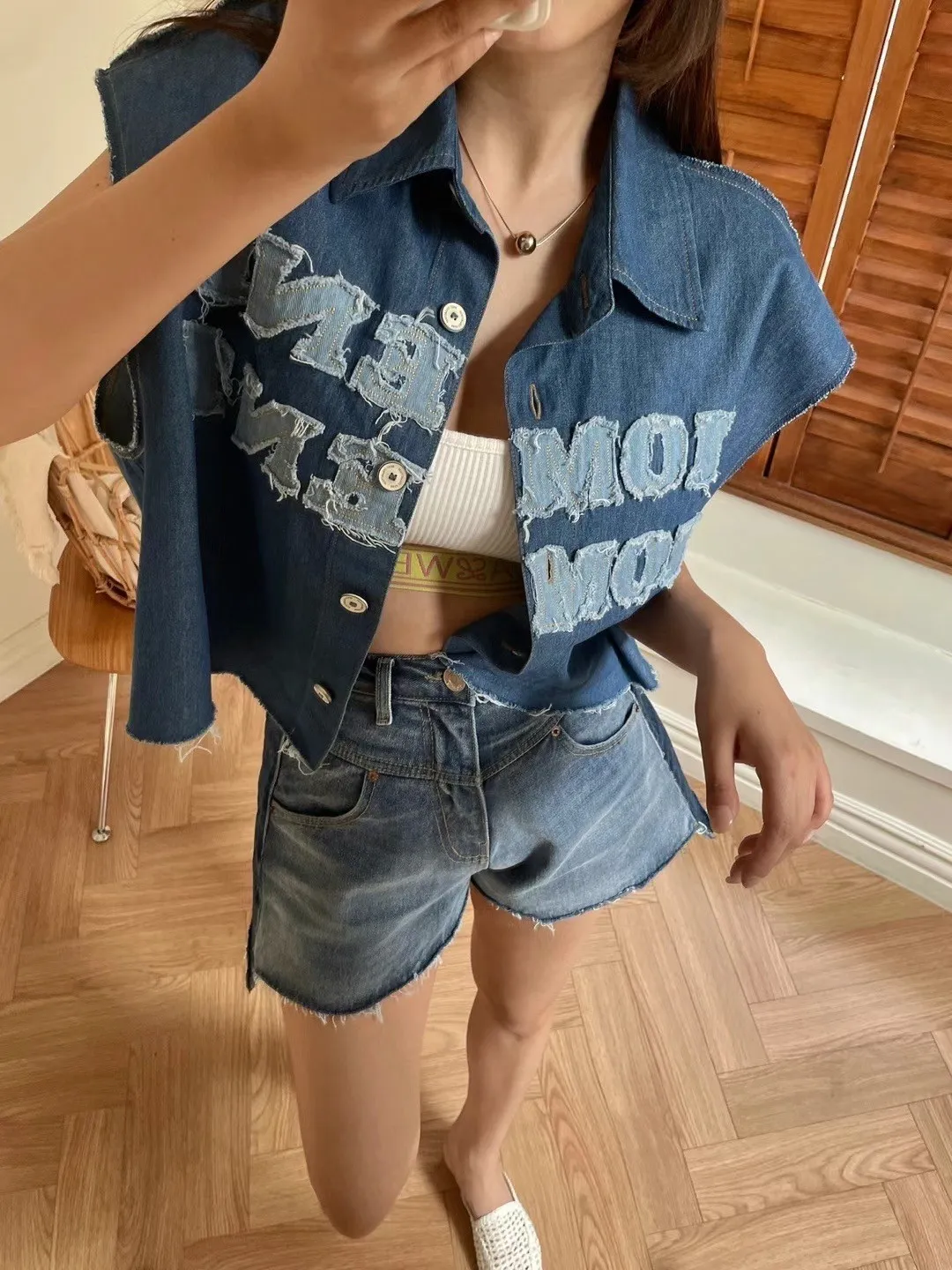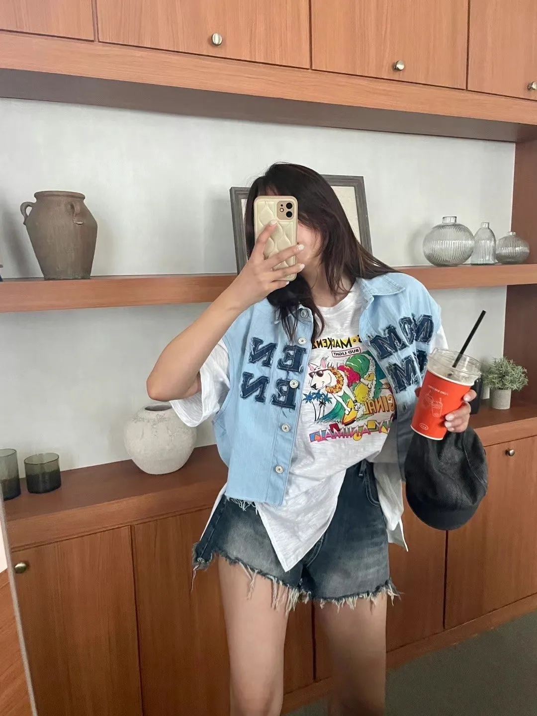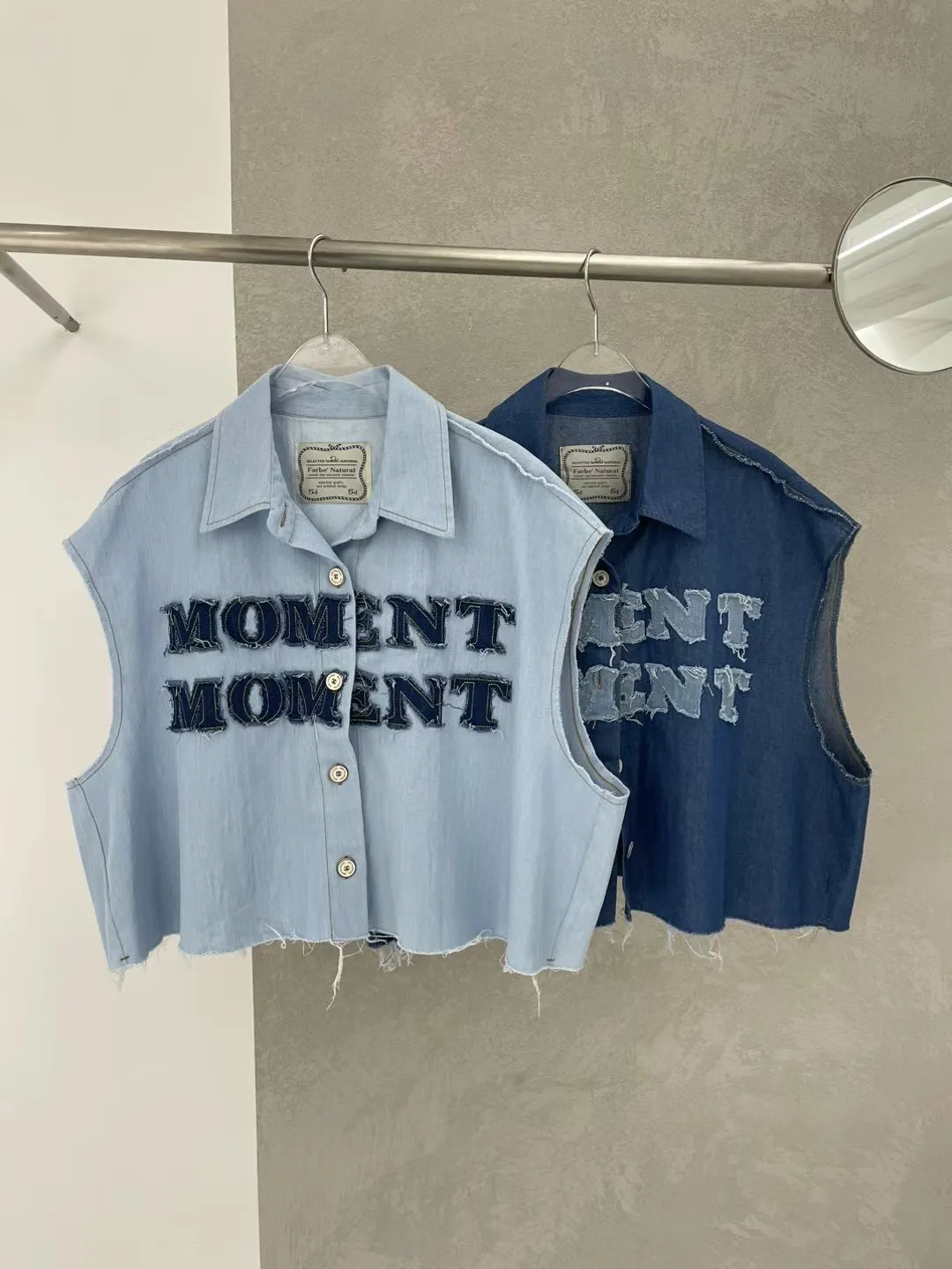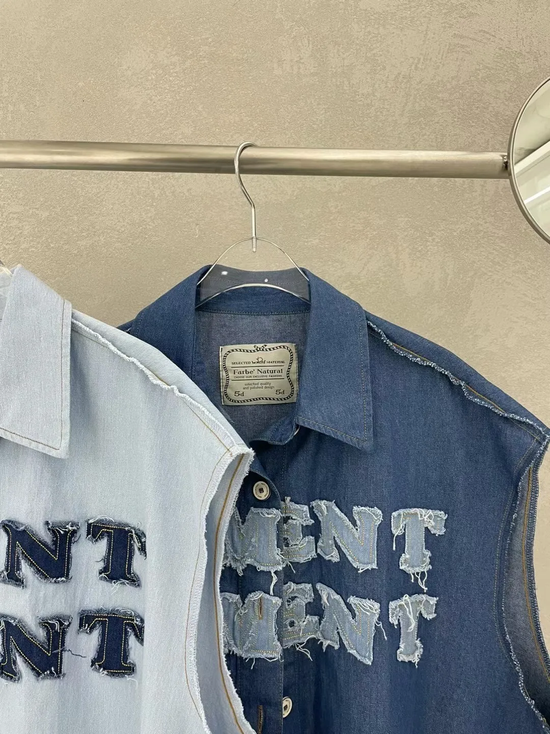 TA714街頭潮流不收邊英文牛仔背心 淺藍 深藍 官網價$1190 線上價$1160