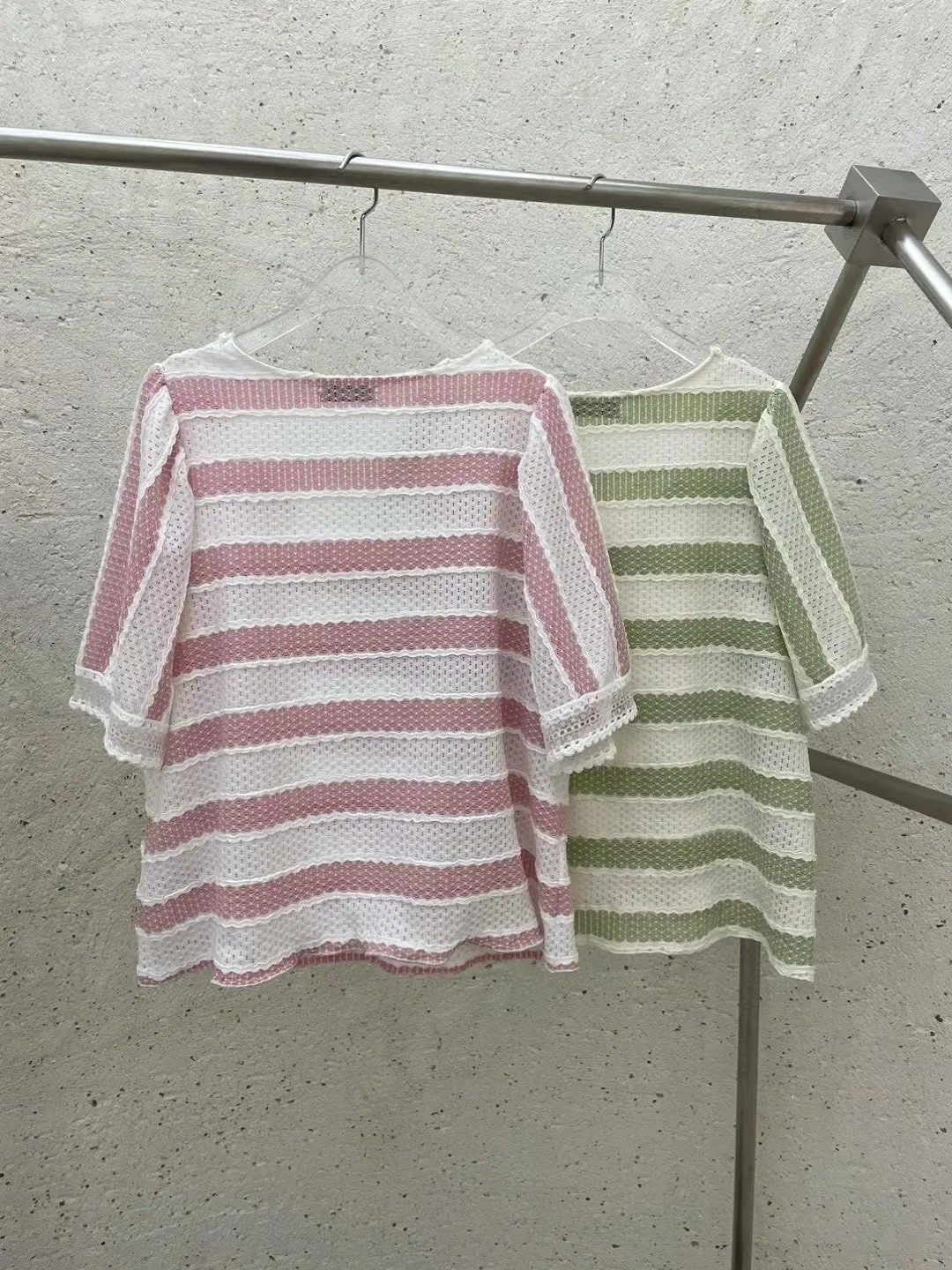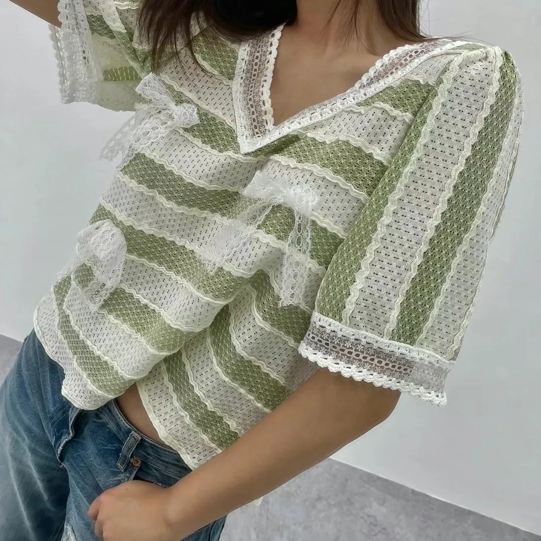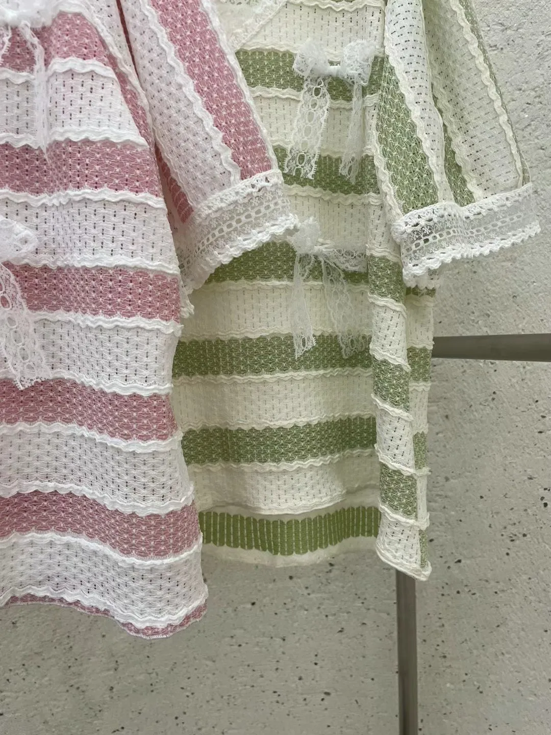 TA715蕾絲細緻簍空蝴蝶結條紋美衣 綠 粉 官網價$1100 線上價$1070