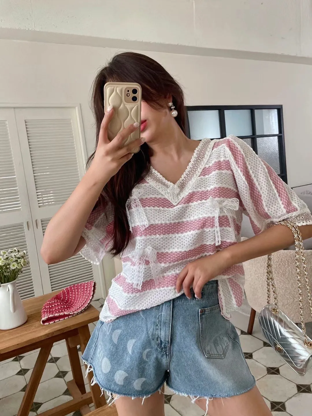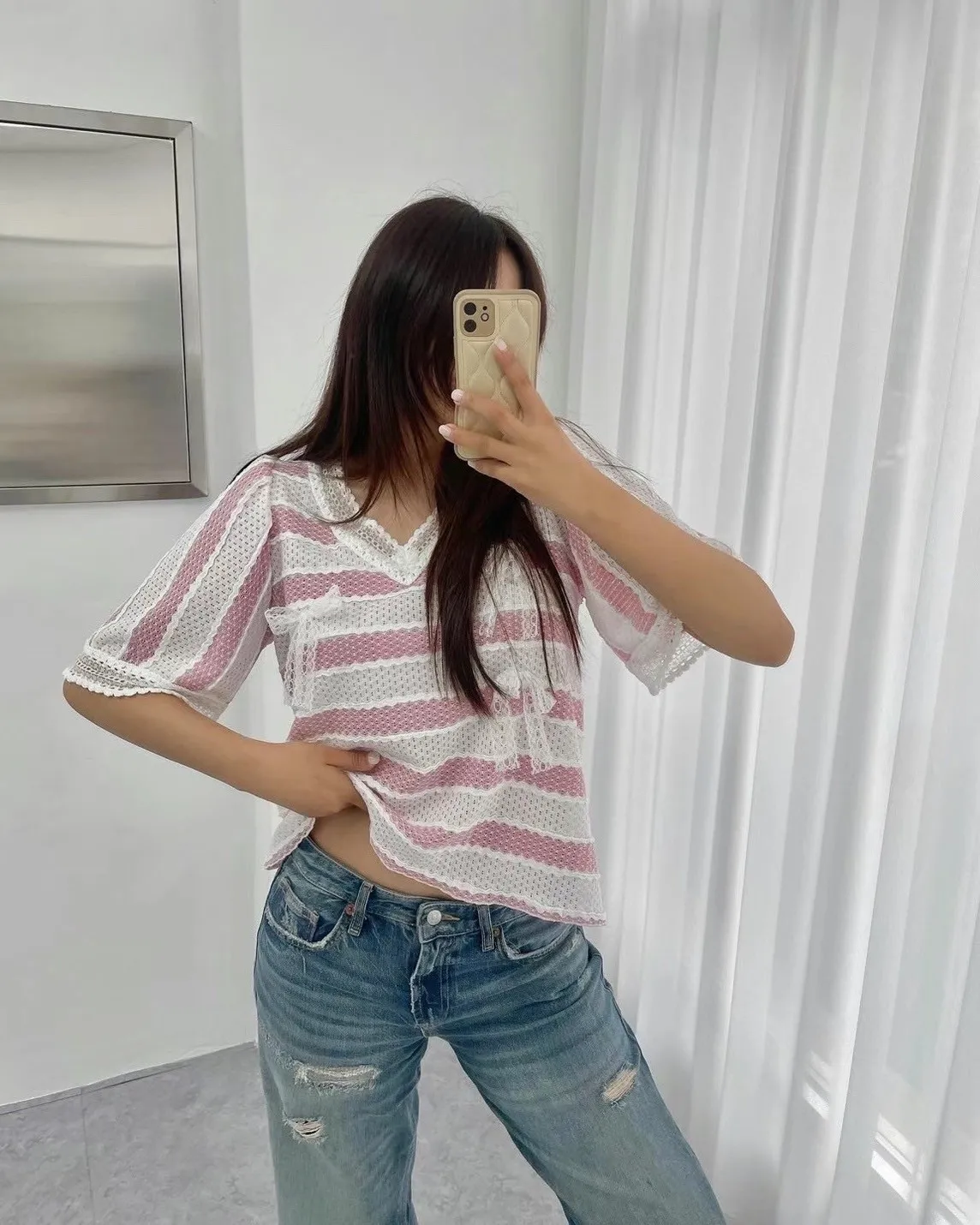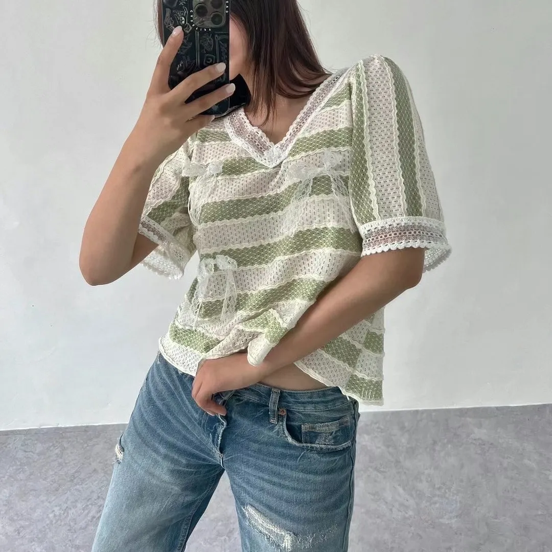TA715蕾絲細緻簍空蝴蝶結條紋美衣 綠 粉 官網價$1100 線上價$1070