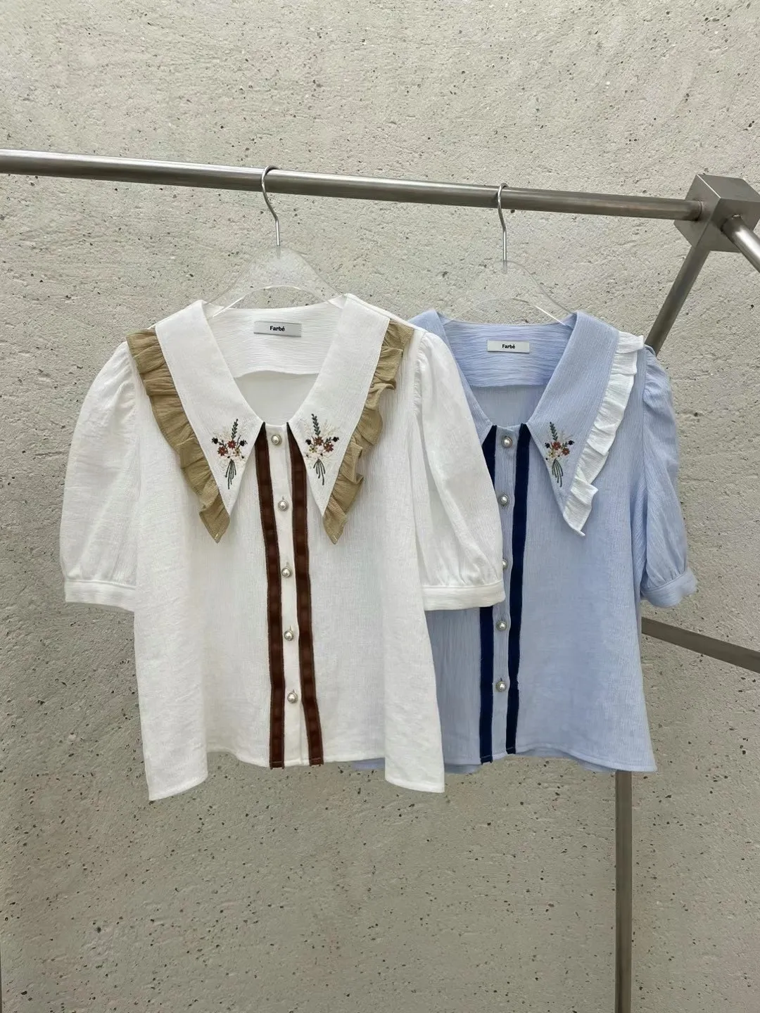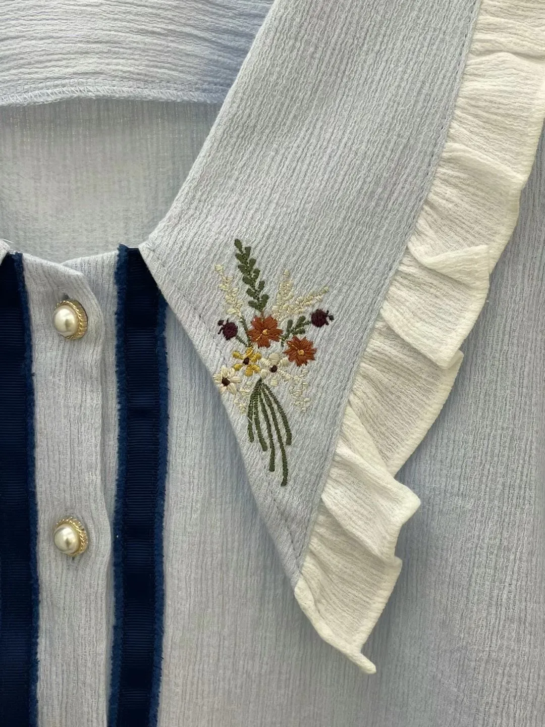 TA723跳色刺繡小花美領上衣 白 藍 官網價$1210 線上價$1190