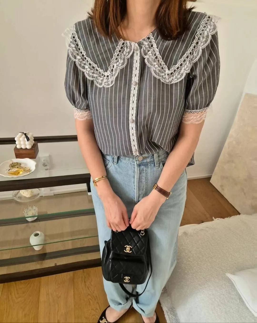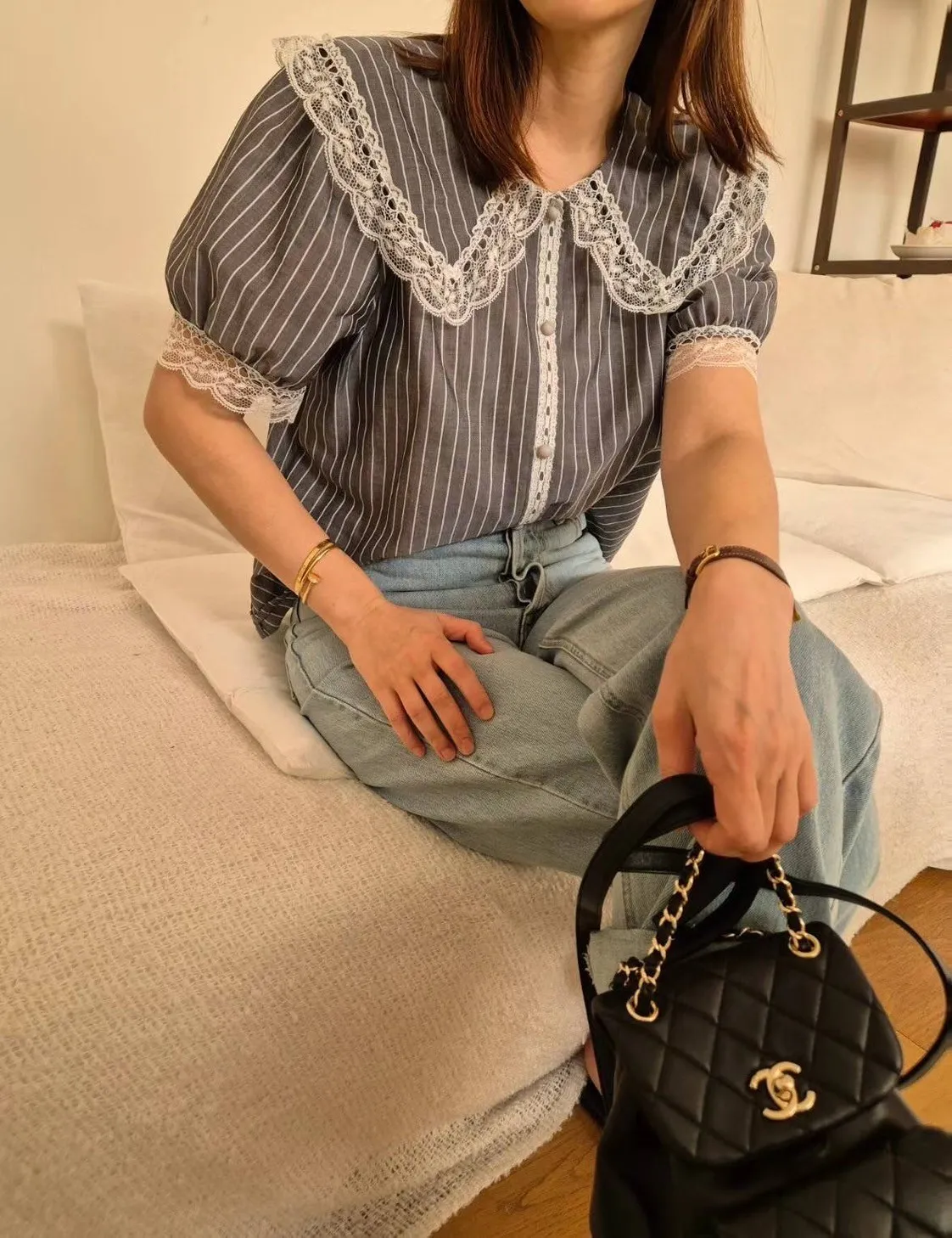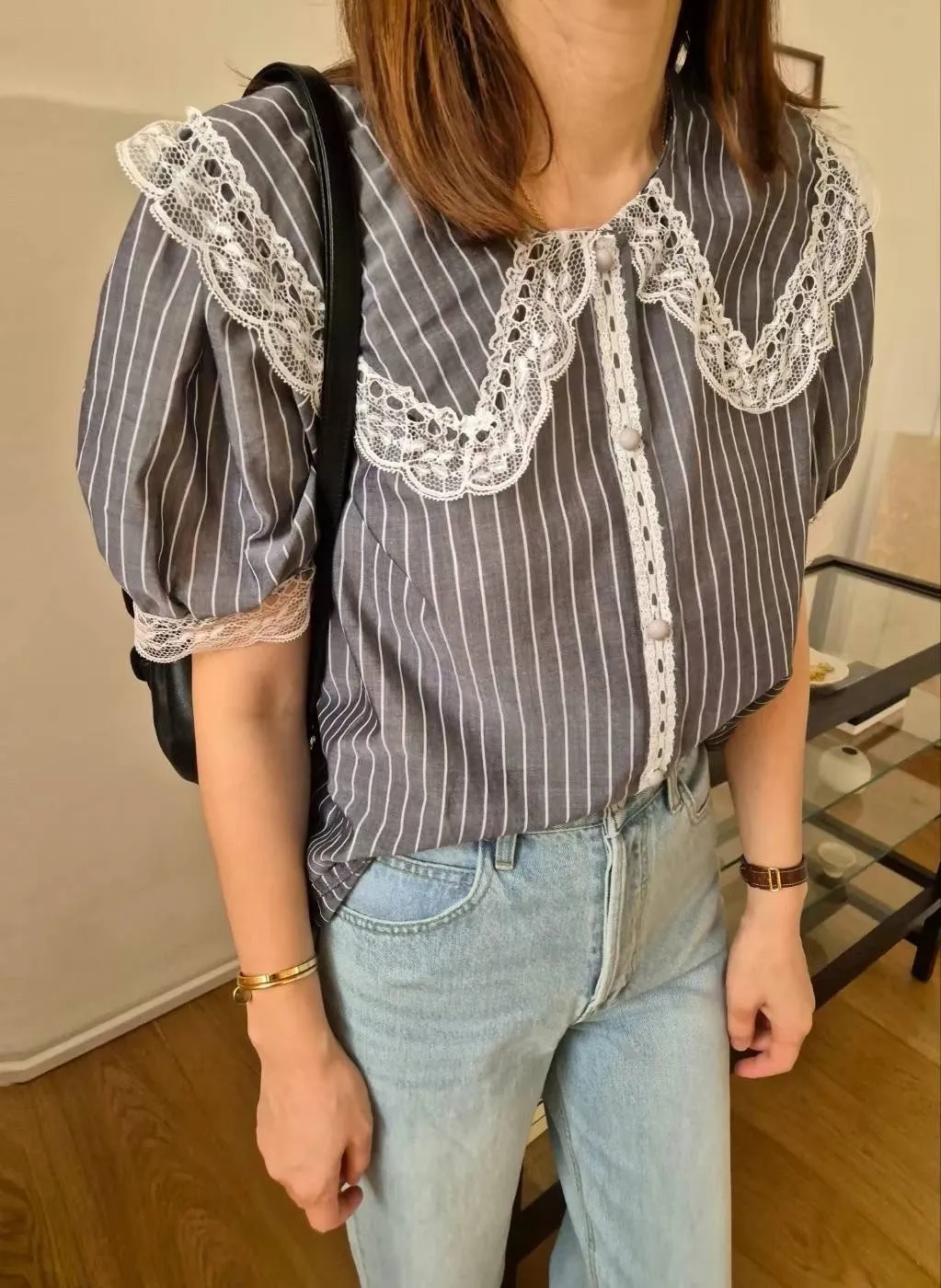 TA775質感蕾絲翻領上衣 灰 藍 官網價$1090 線上價$1060