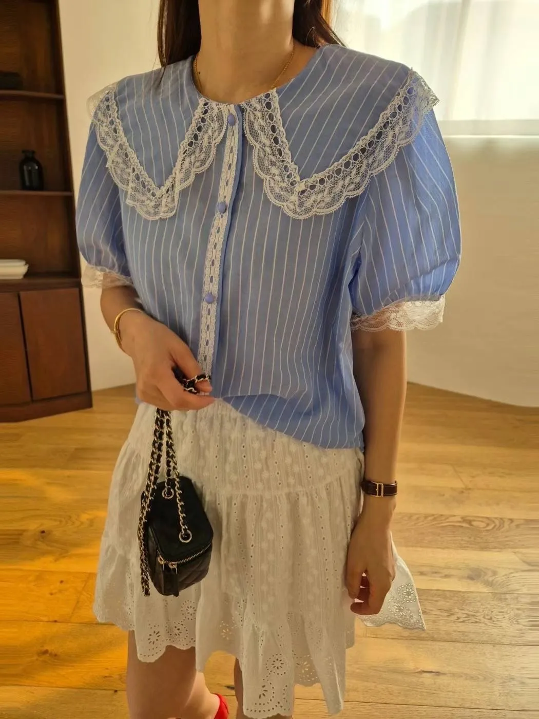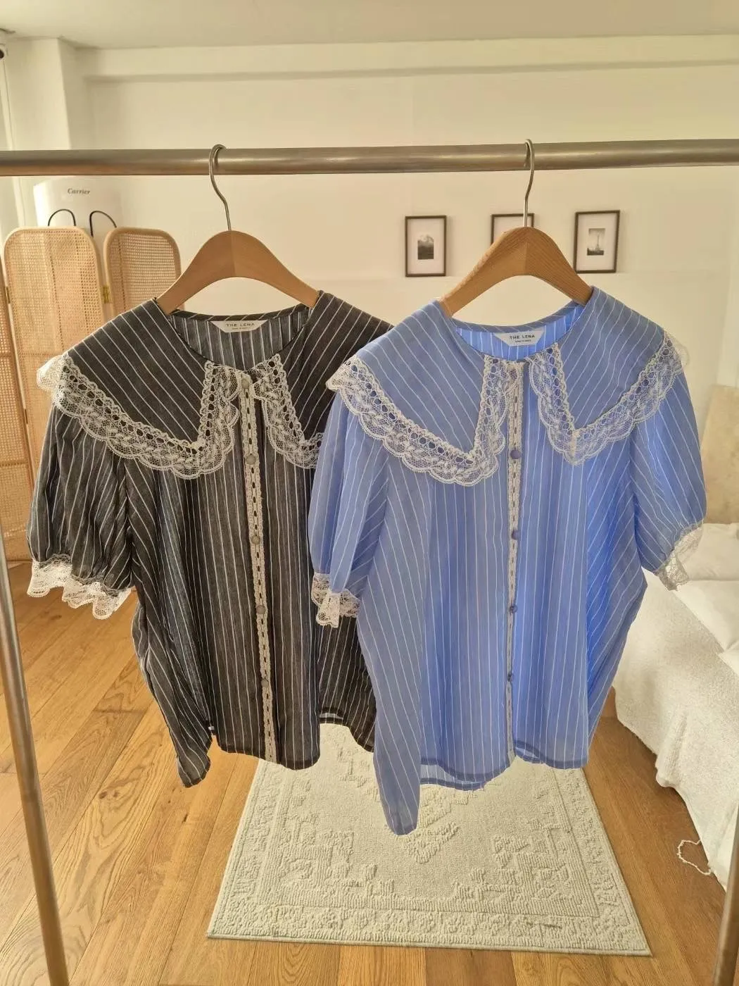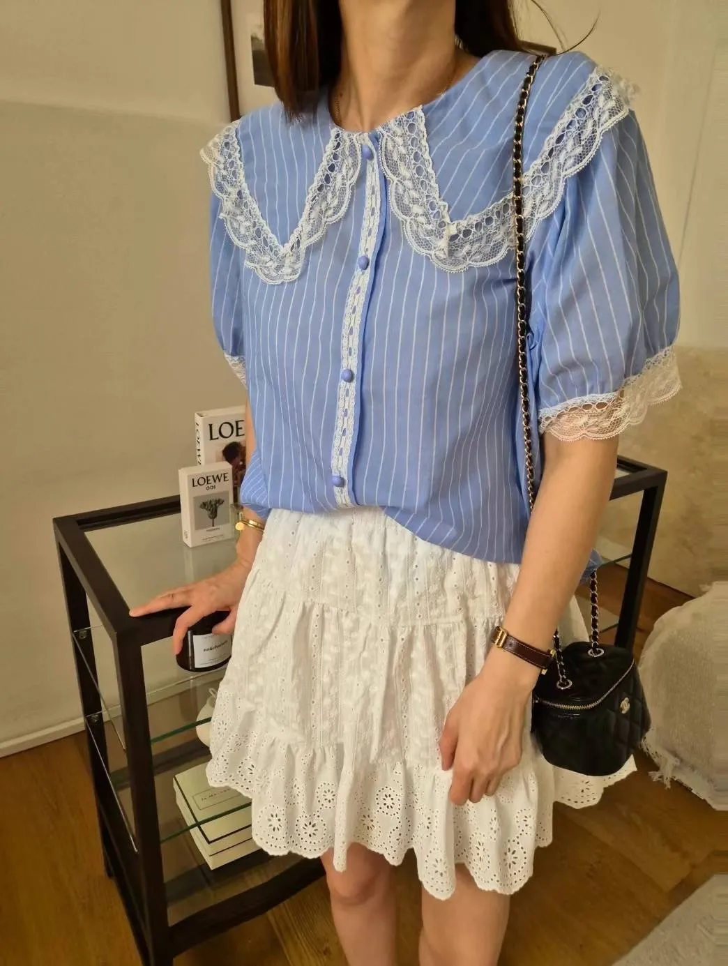 TA775質感蕾絲翻領上衣 灰 藍 官網價$1090 線上價$1060