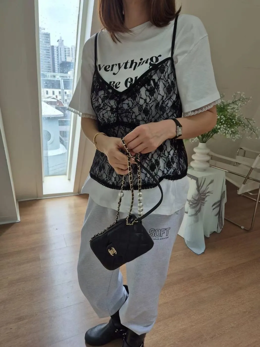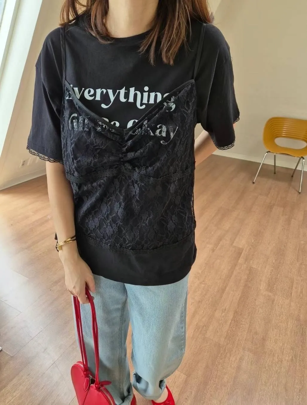 棉 薄款 觸感類似莫代爾 透氣舒適 落肩顯瘦 拼接布蕾絲手袖
