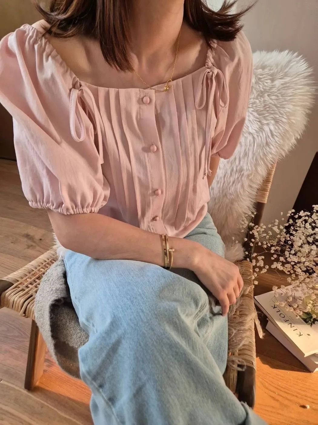 TA780琴弦細褶雙蝴蝶結上衣 白 粉 官網價$1080 線上價$1050
