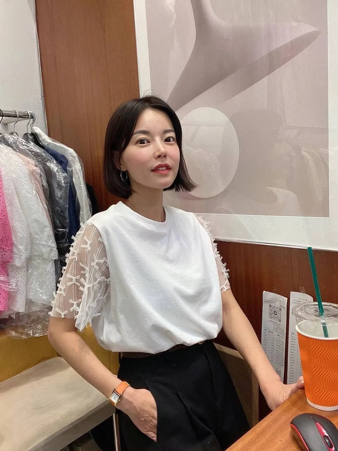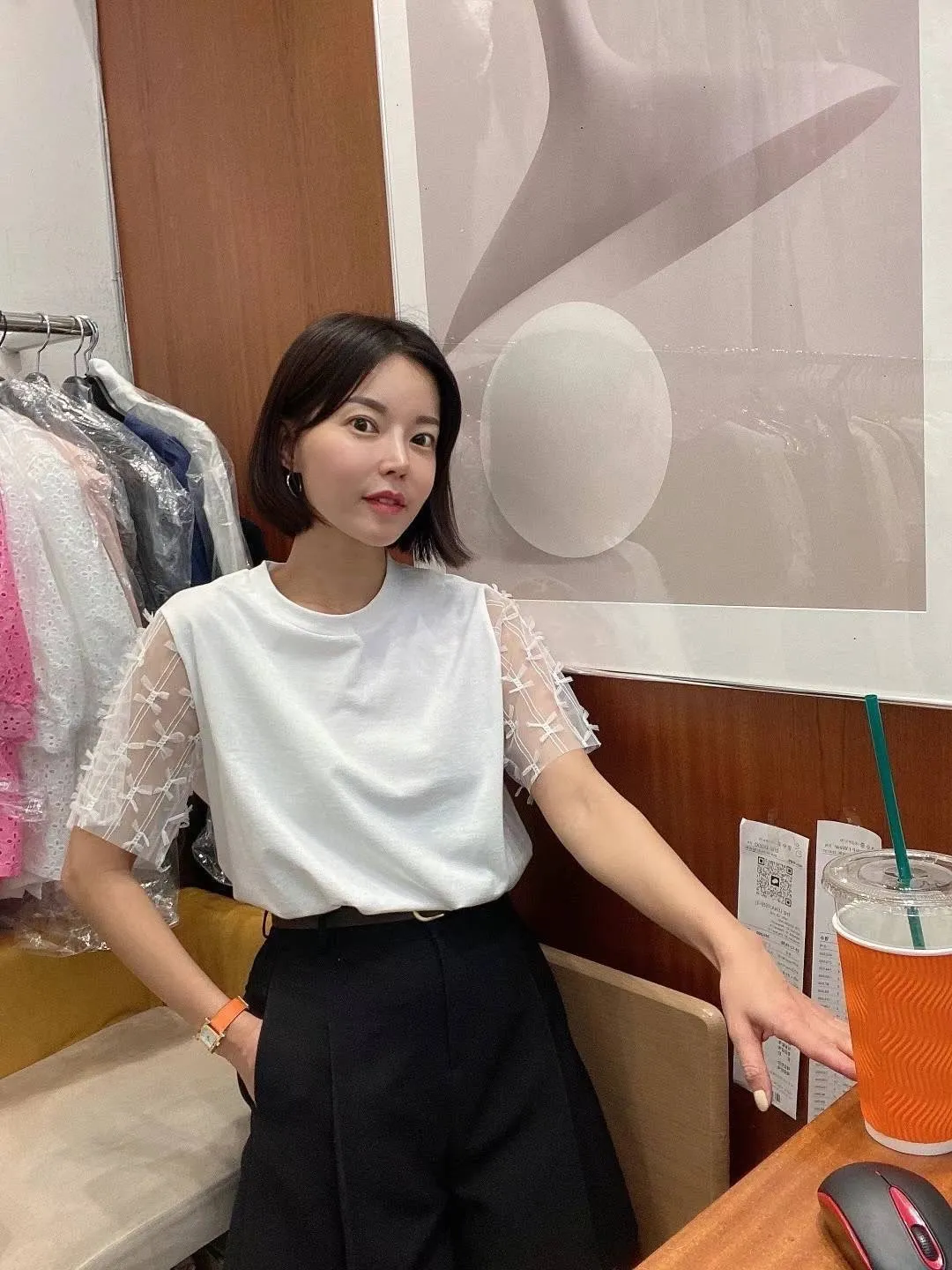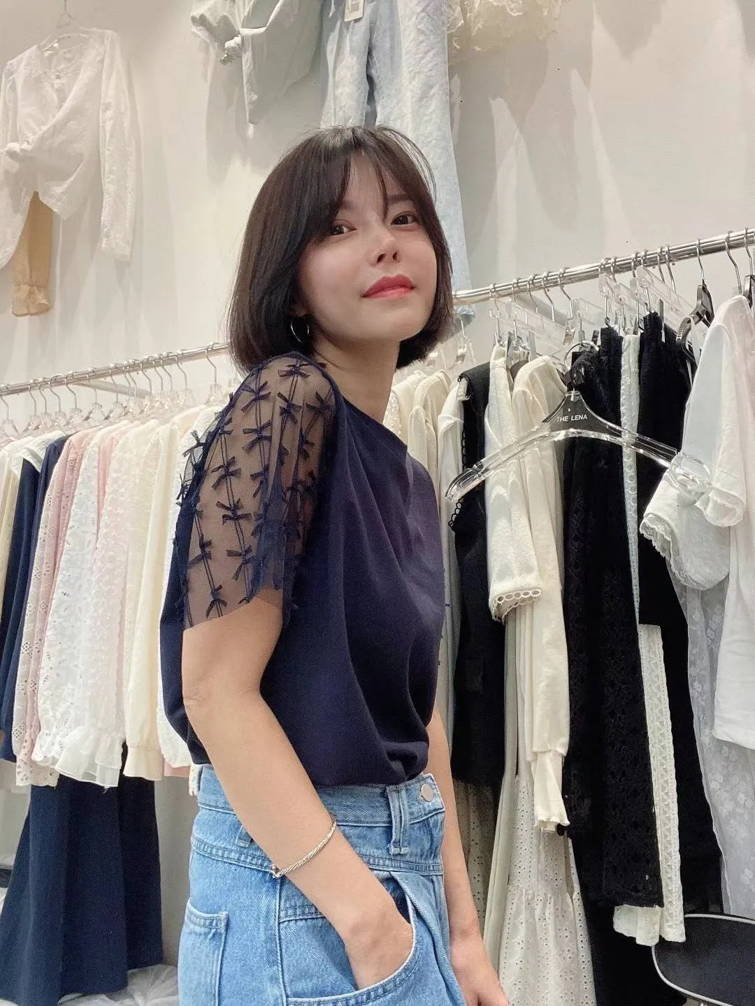 TA781透光網紗美袖上衣 白 藍 官網價$729 線上價$699