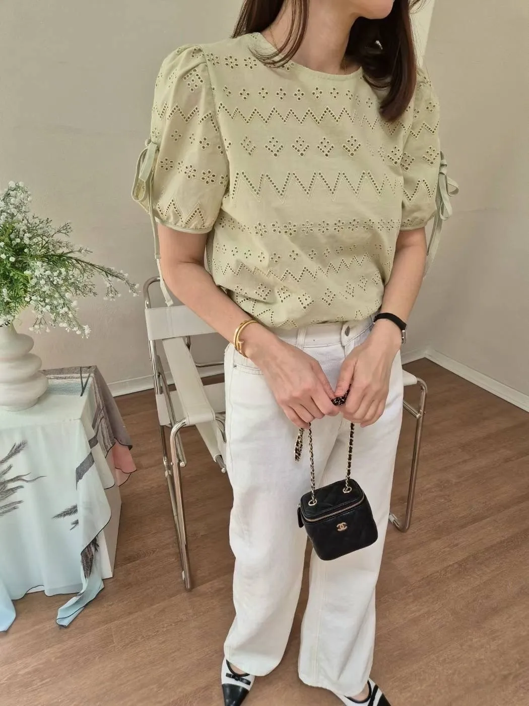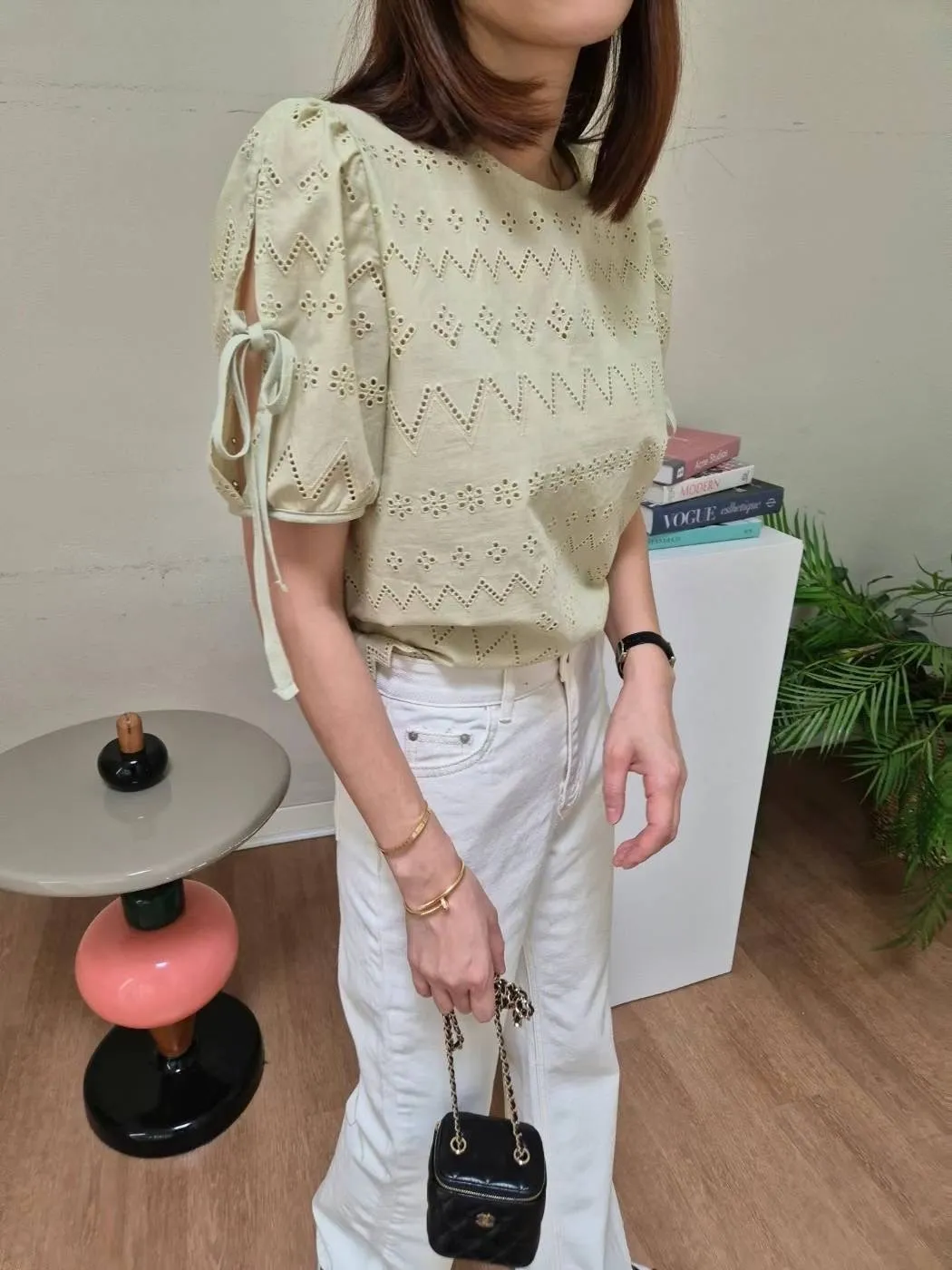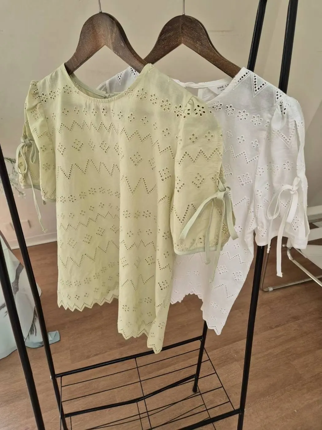 TA788簍空美袖綁帶布蕾絲上衣 白 綠 官網價$1190 線上價$1160