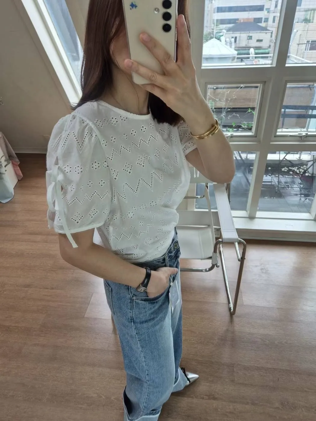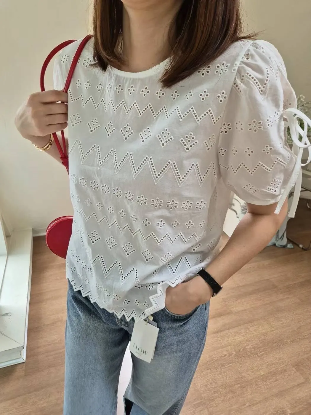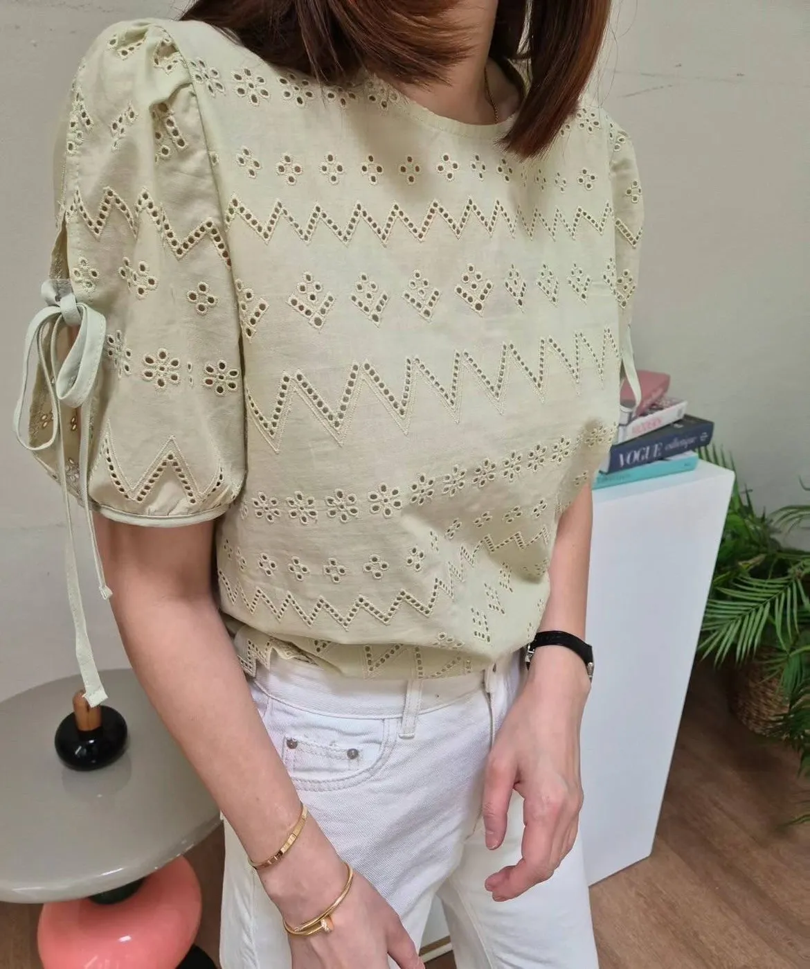 TA788簍空美袖綁帶布蕾絲上衣 白 綠 官網價$1190 線上價$1160