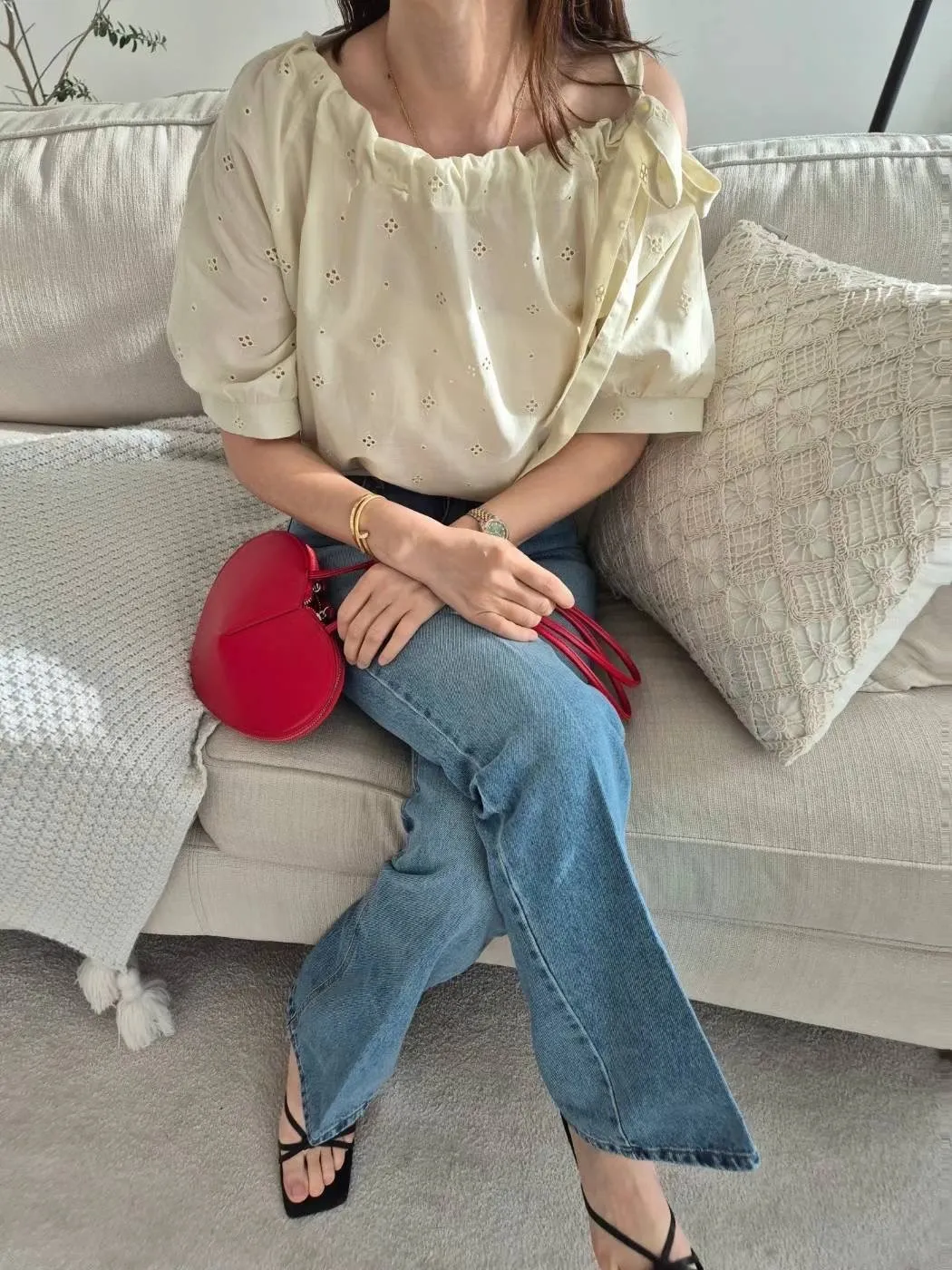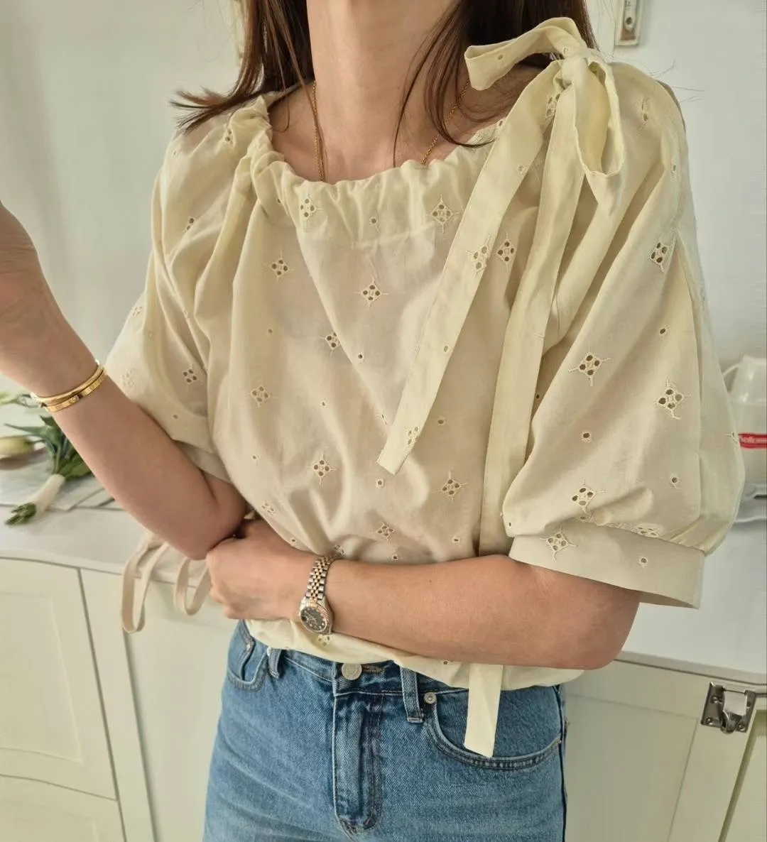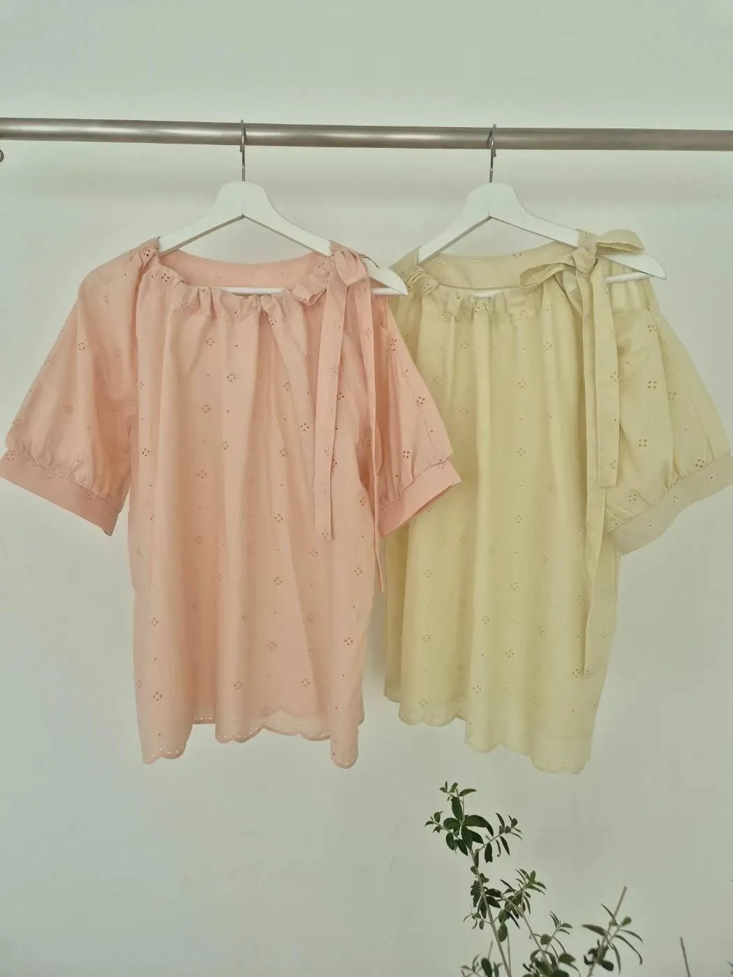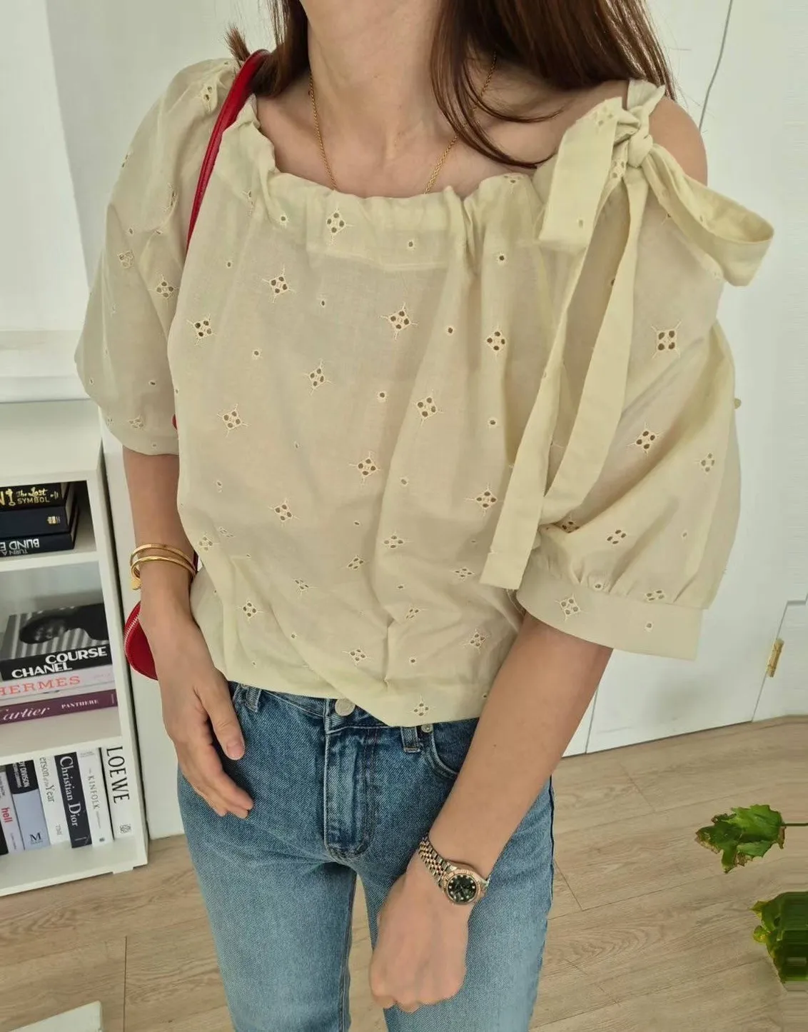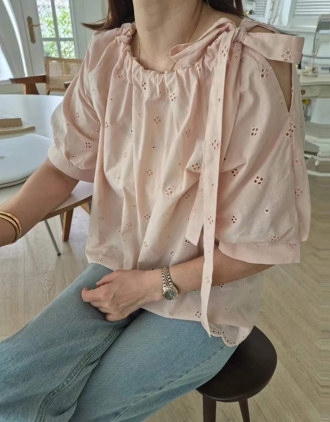 TA798側肩綁帶簍空布蕾絲上衣 綠 粉 官網價$1260 線上價$1230