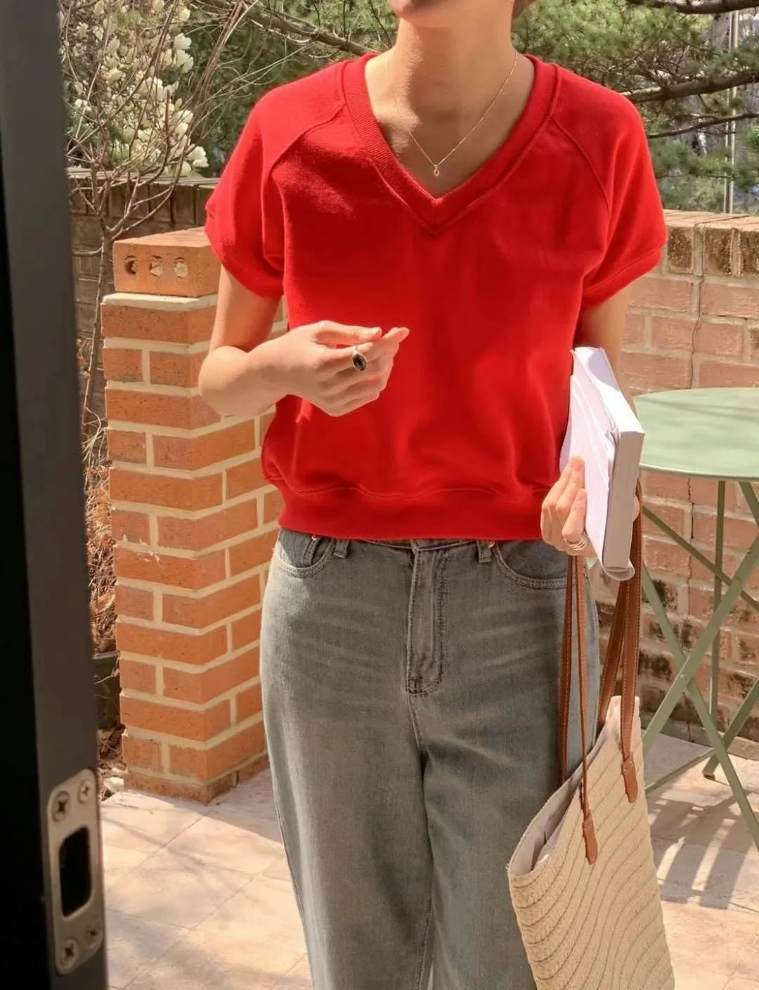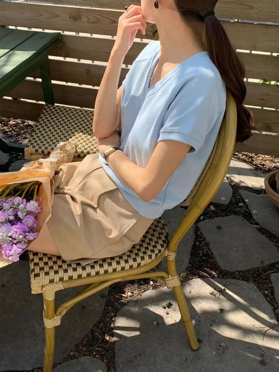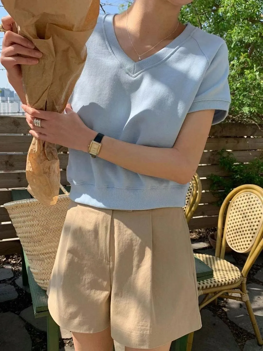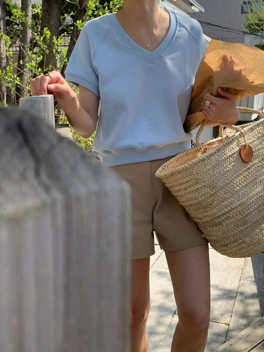 棉 落肩款 觸感舒適 V領顯瘦 偏短版下擺鬆緊 穿到M號