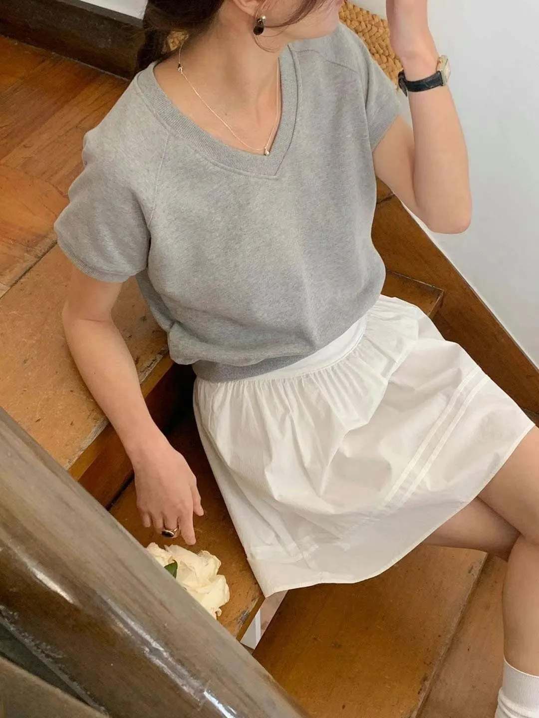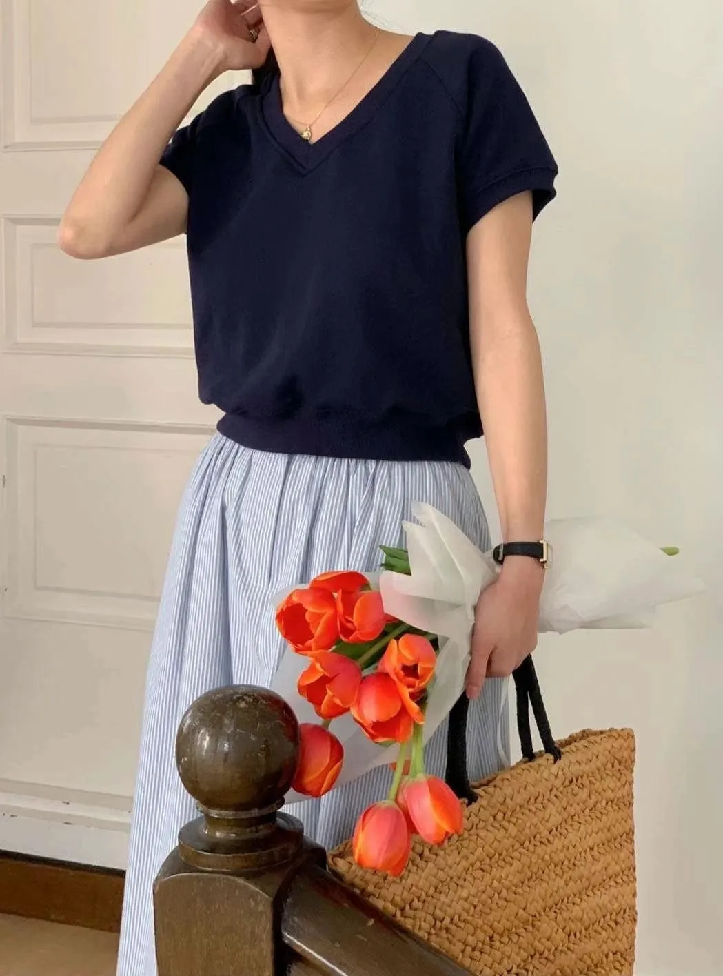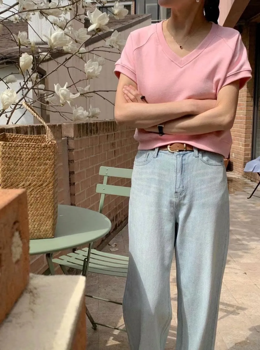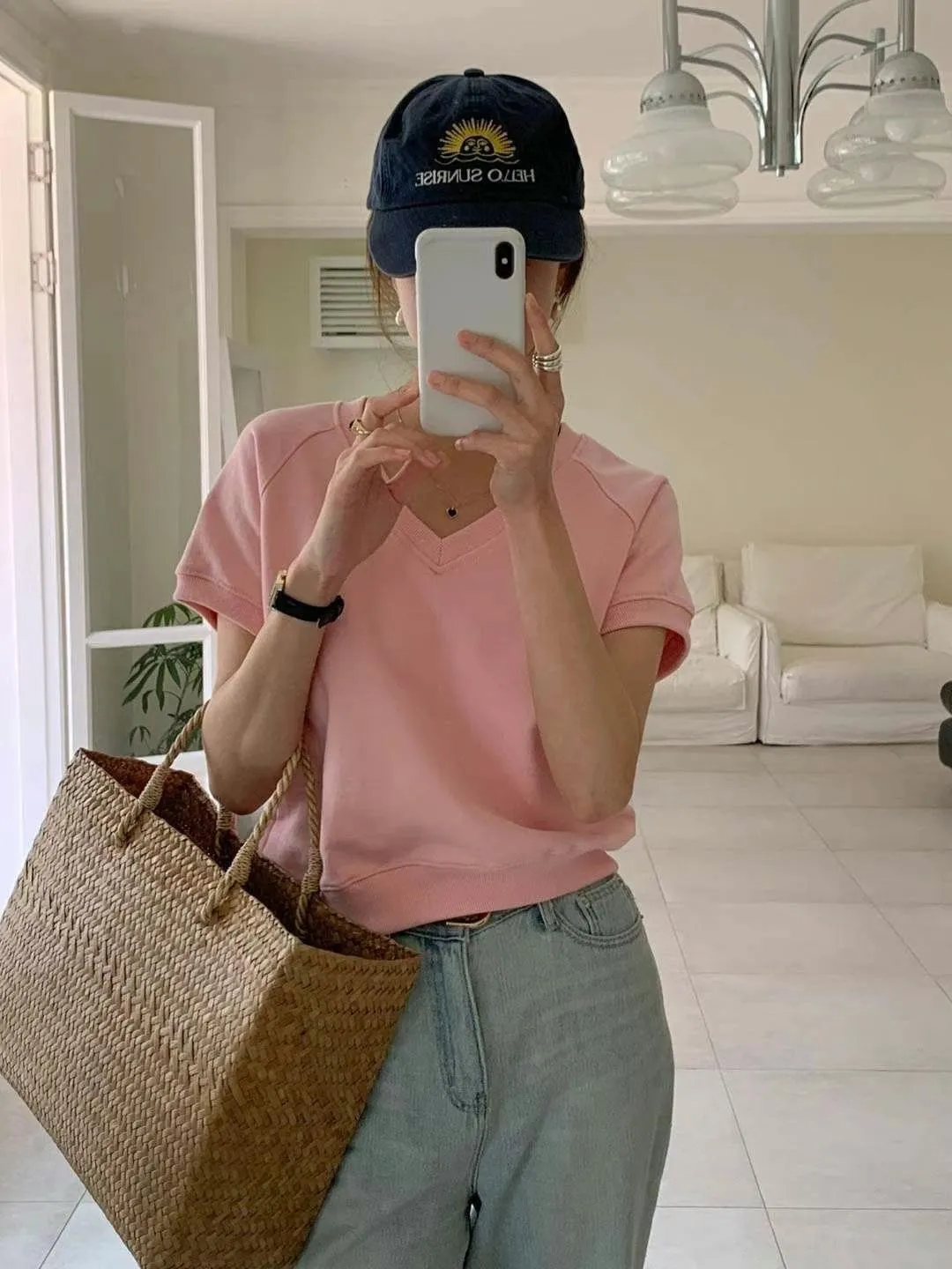 棉 落肩款 觸感舒適 V領顯瘦 偏短版下擺鬆緊 穿到M號