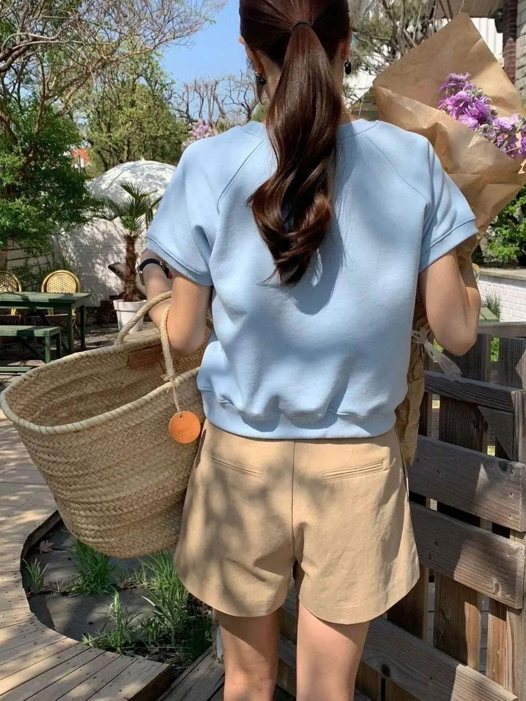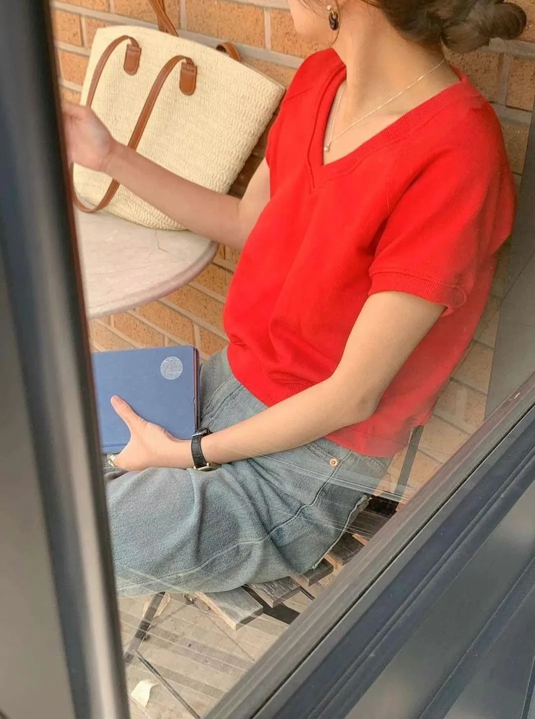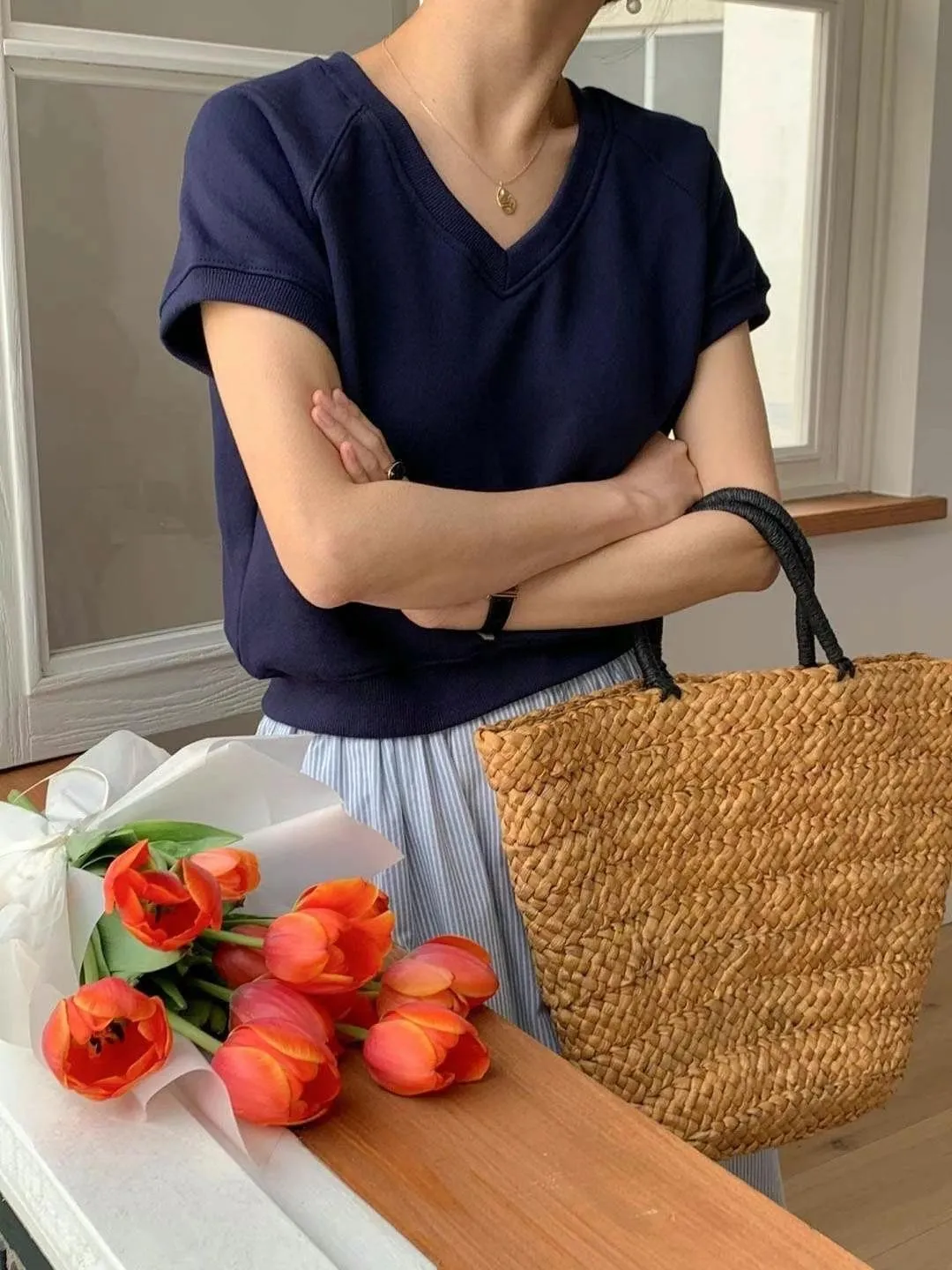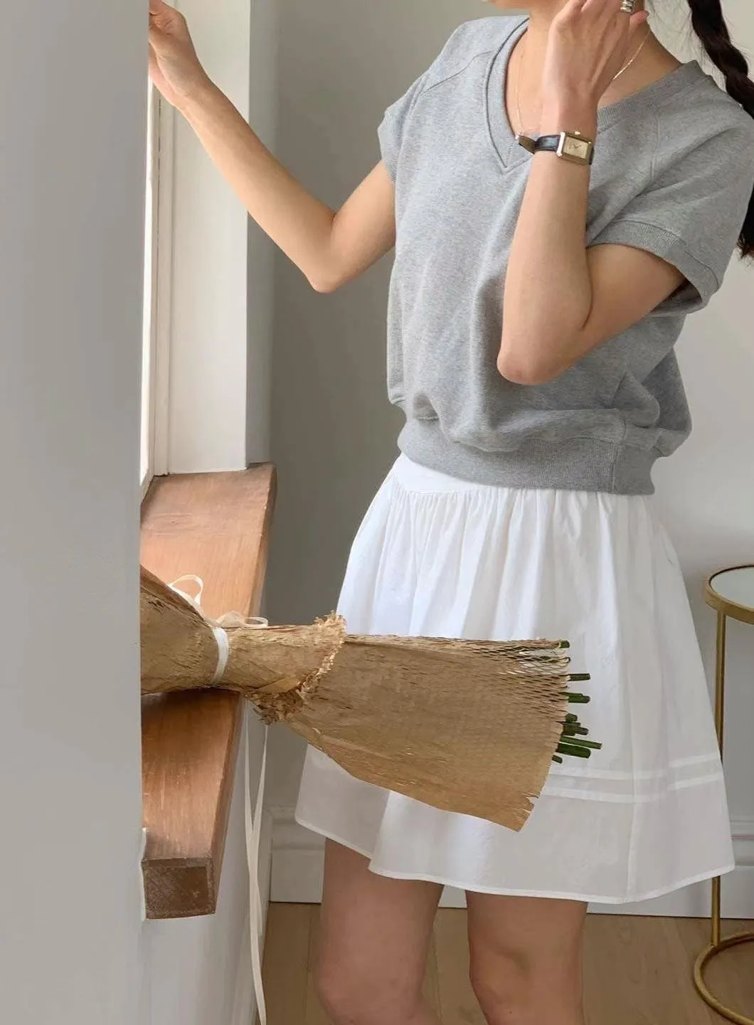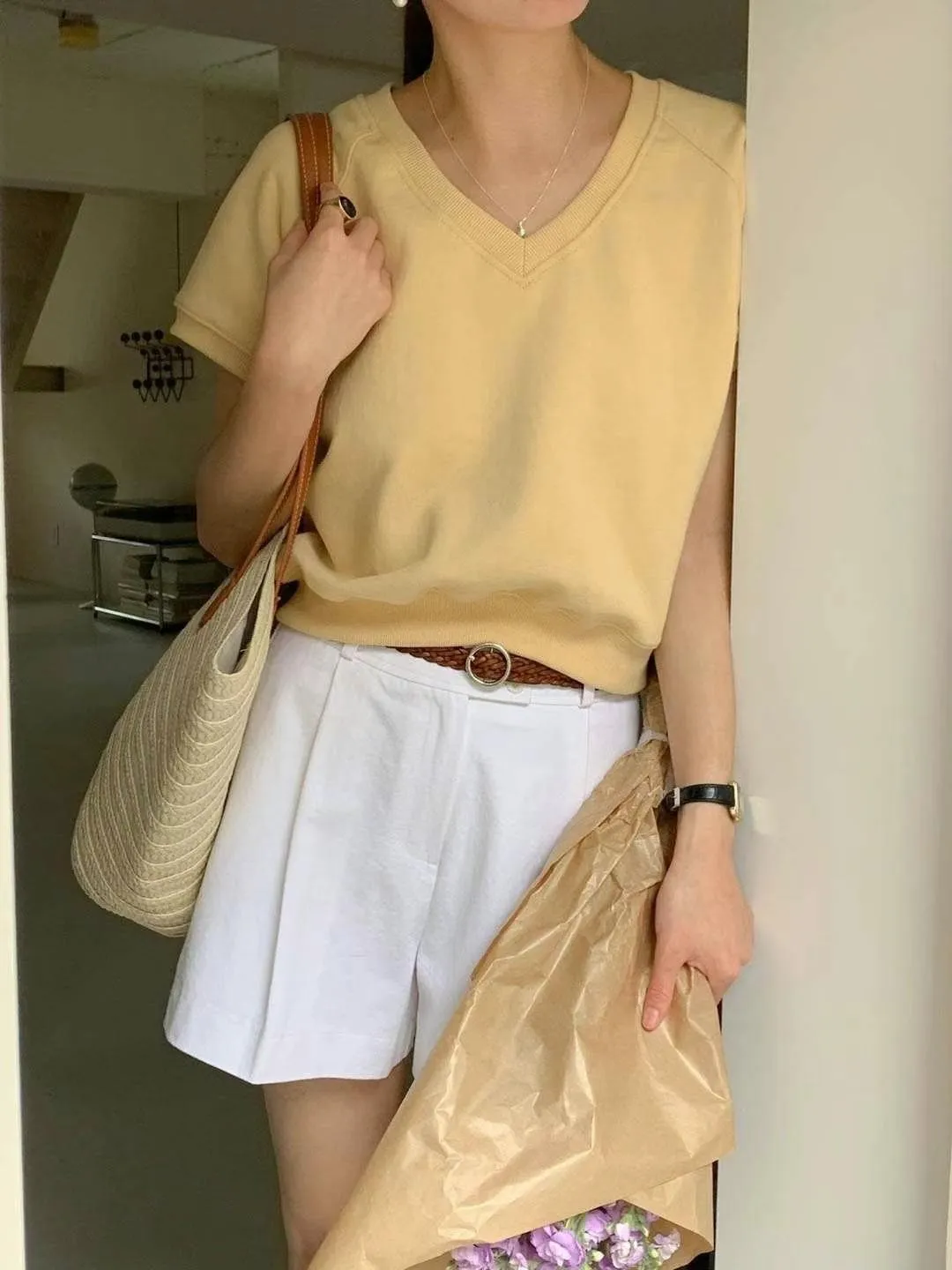 棉 落肩款 觸感舒適 V領顯瘦 偏短版下擺鬆緊 穿到M號