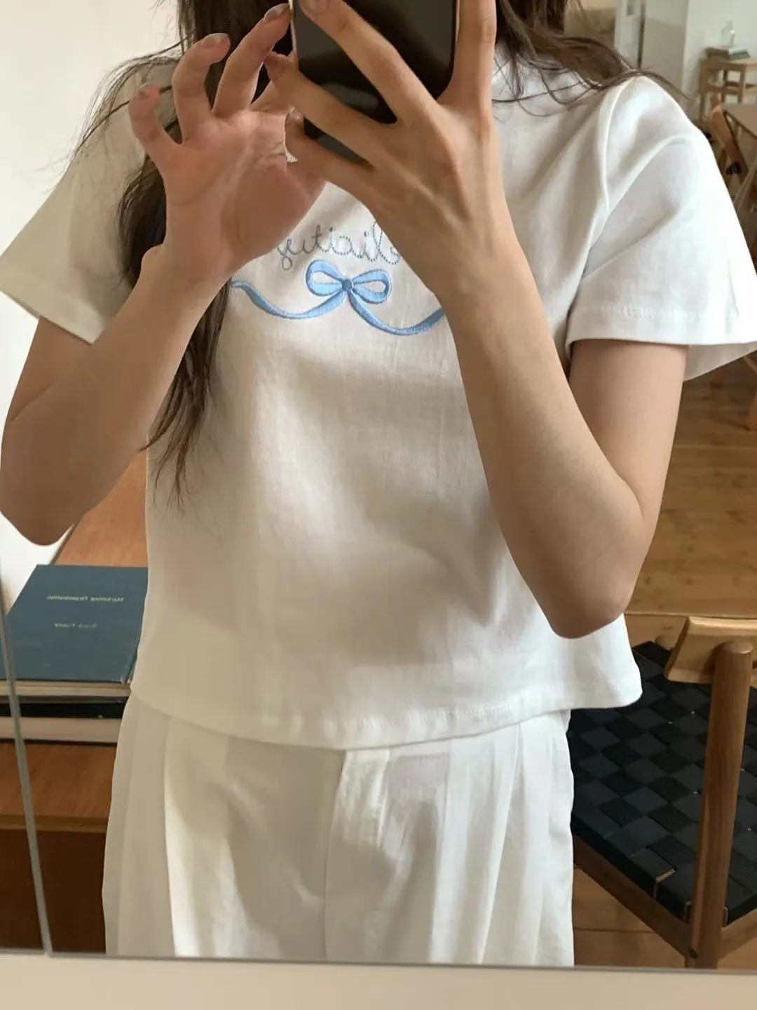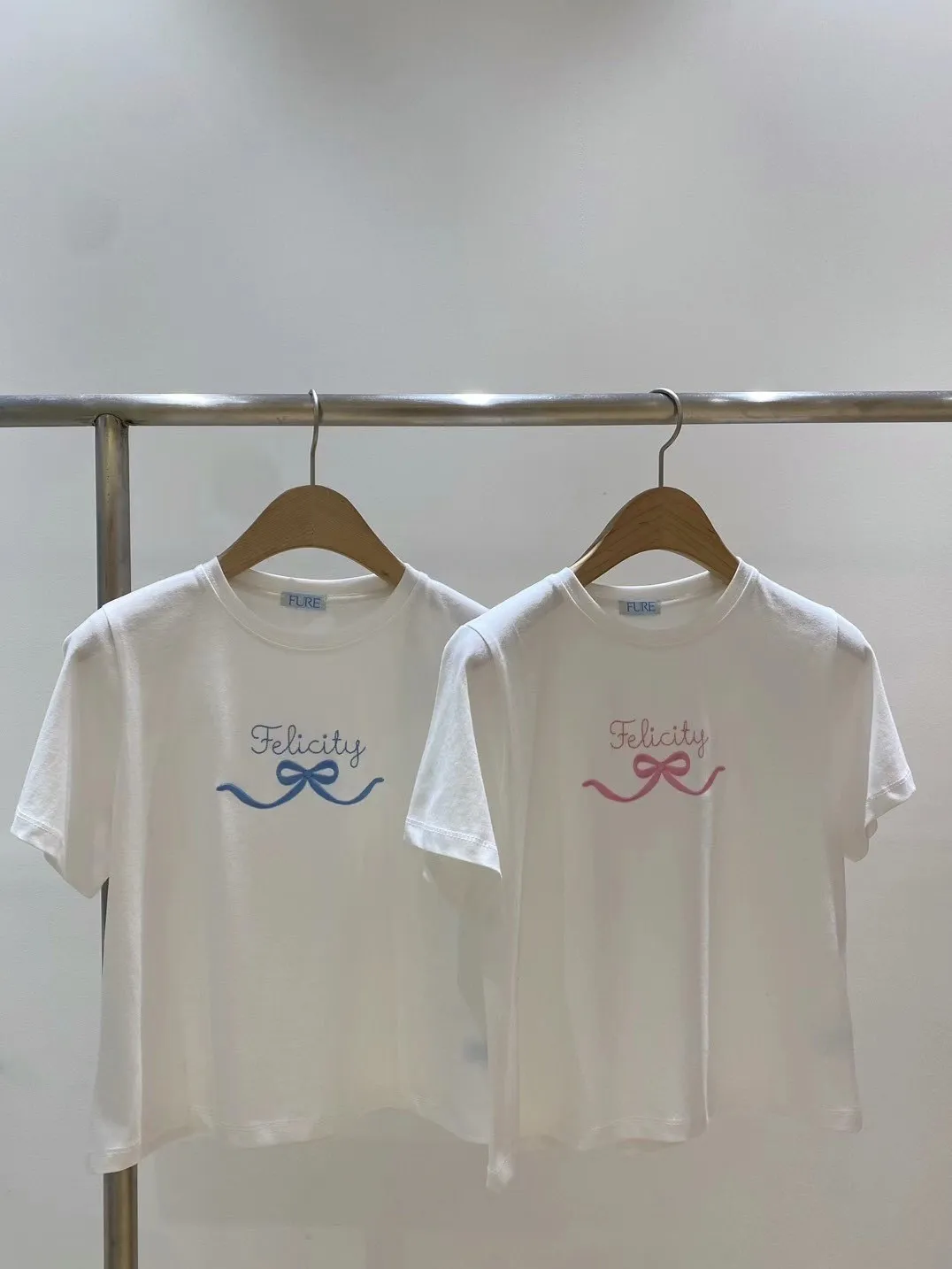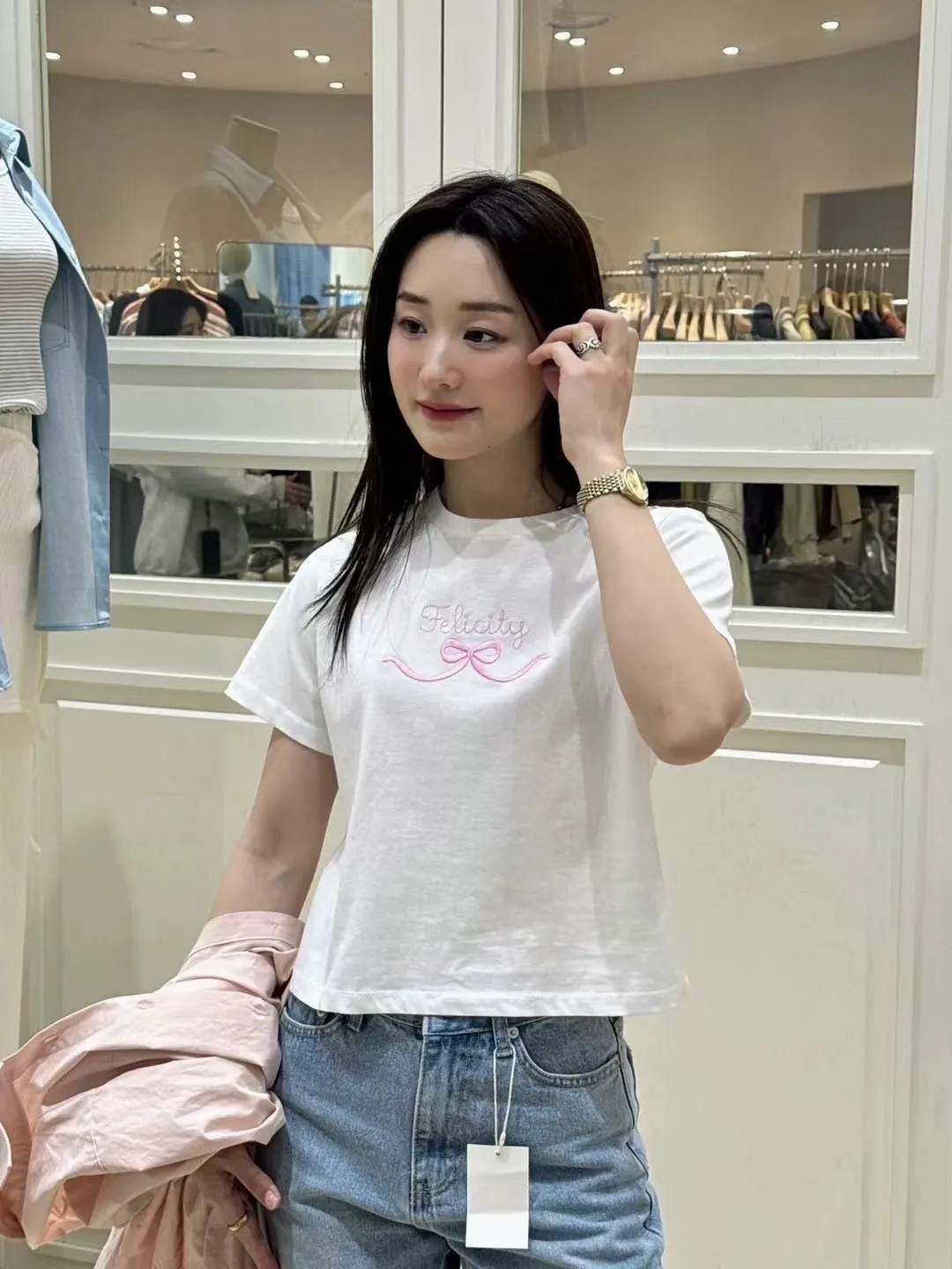 TA854英文刺繡蝴蝶結短版Tshirt 藍 粉 官網價$560 線上價$530