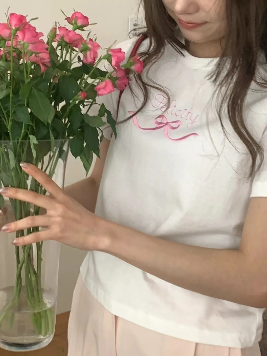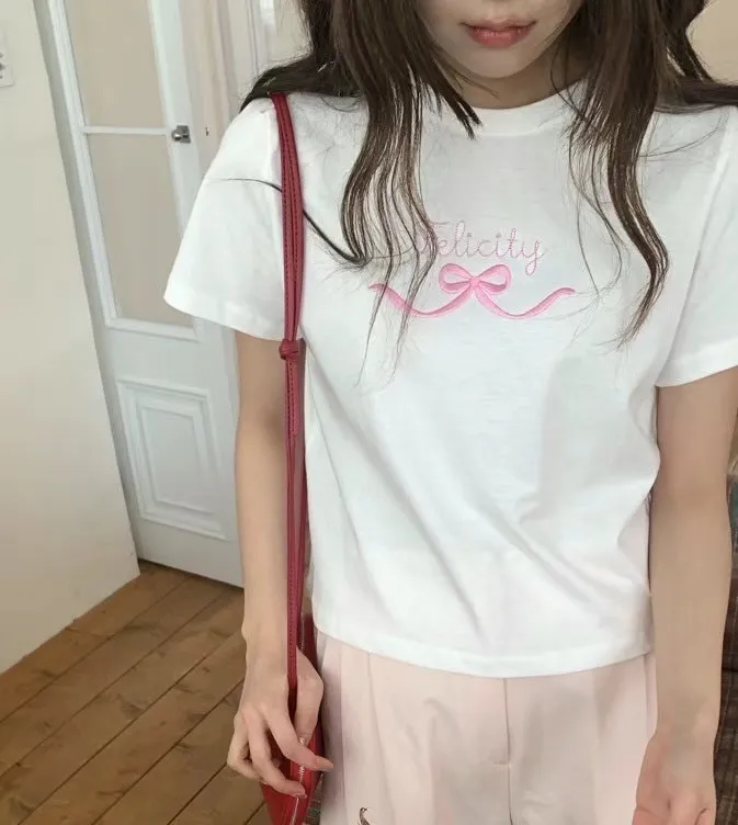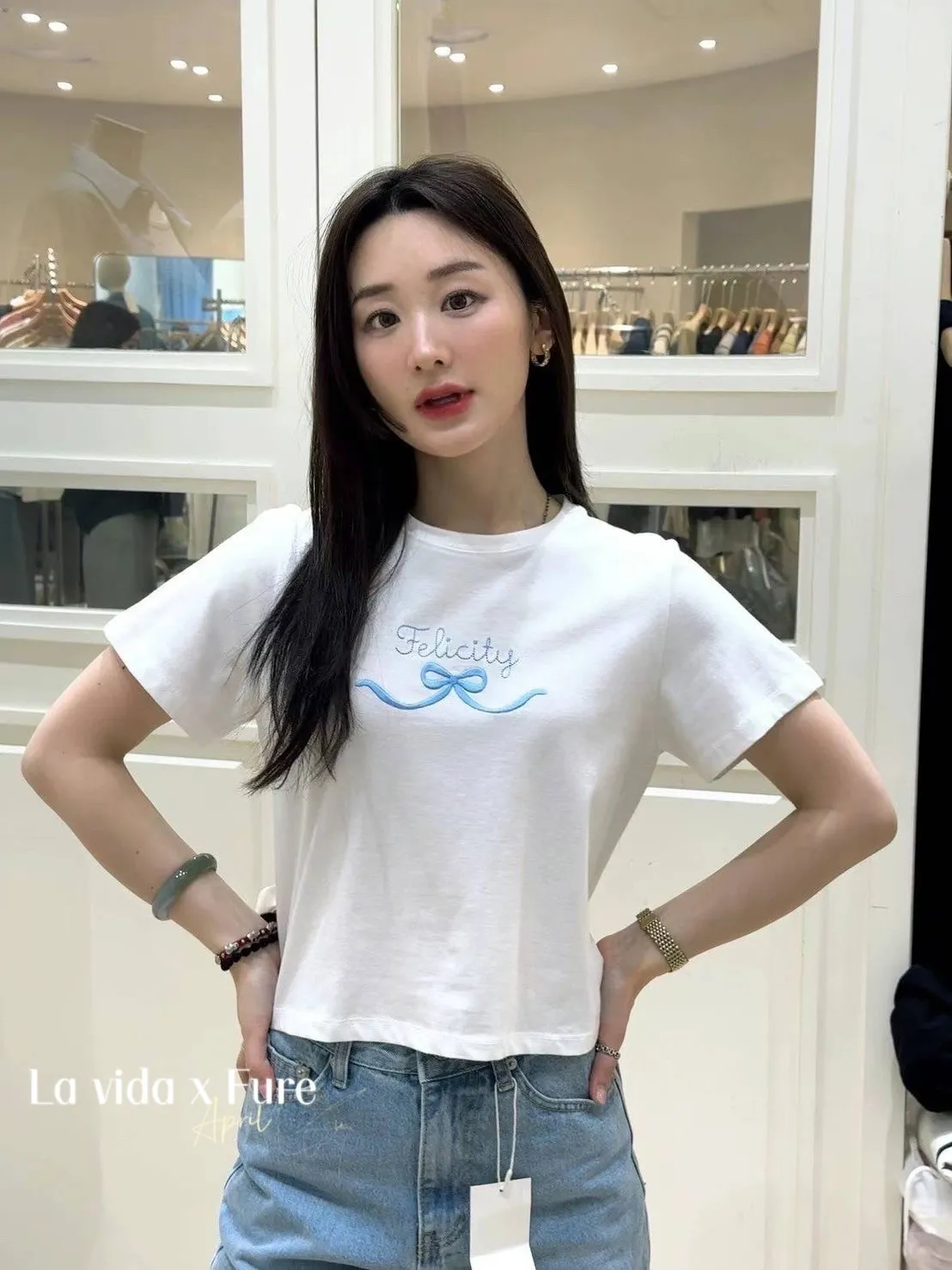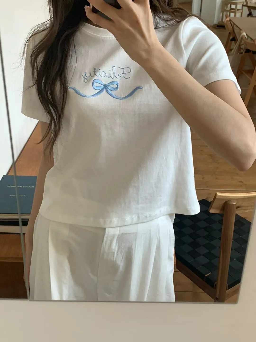 TA854英文刺繡蝴蝶結短版Tshirt 藍 粉 官網價$560 線上價$530