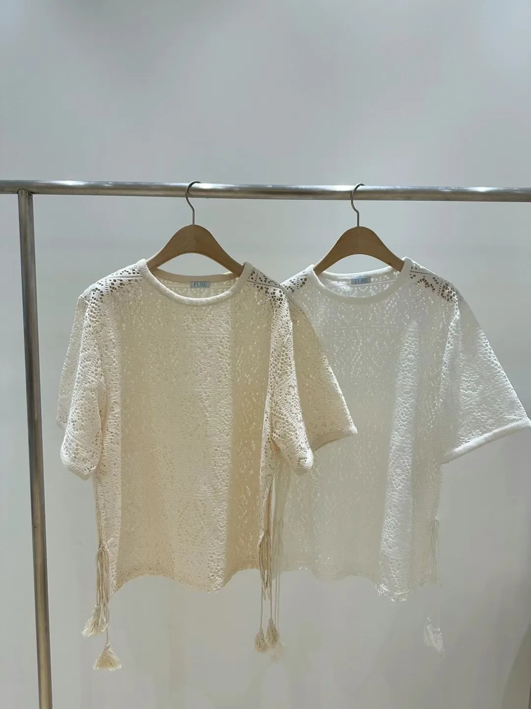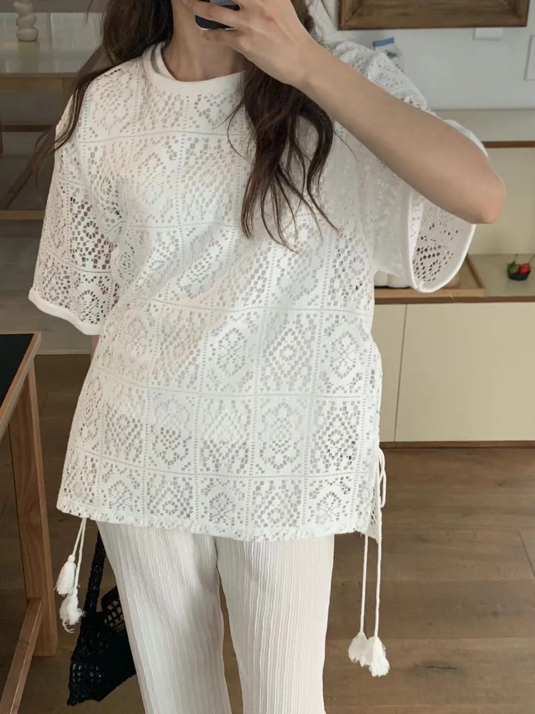 TA875流蘇綁帶簍空布蕾絲美衣 白 米 官網價$890 線上價$860