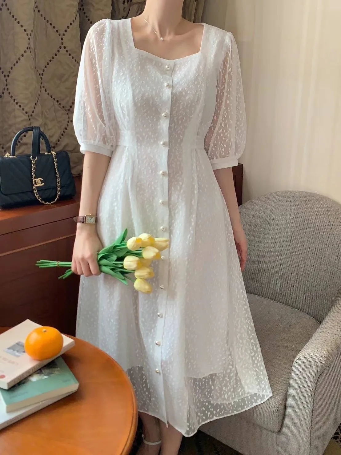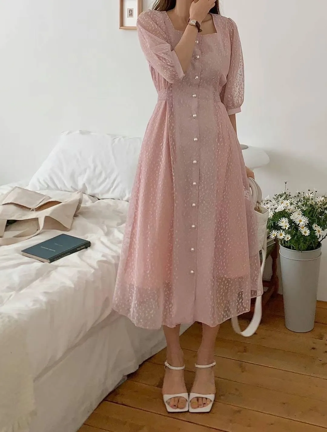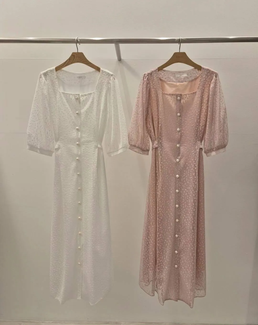TA886雪花透光珍珠釦洋裝 白 粉 官網價$1520 線上價$1490