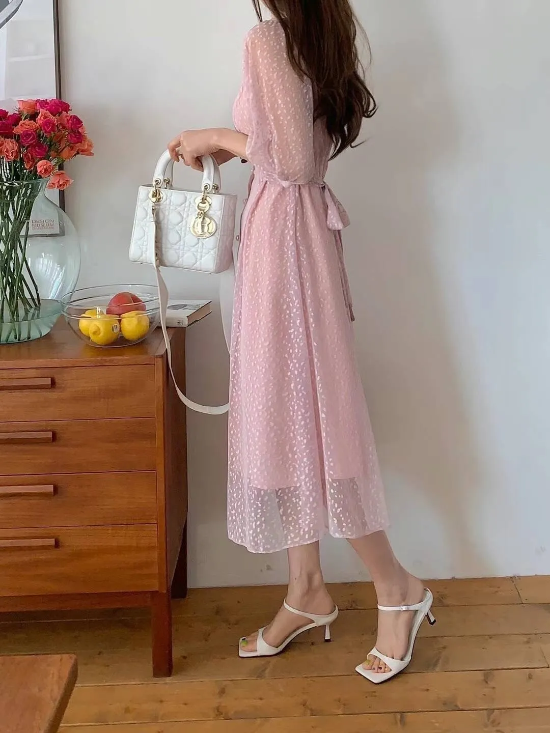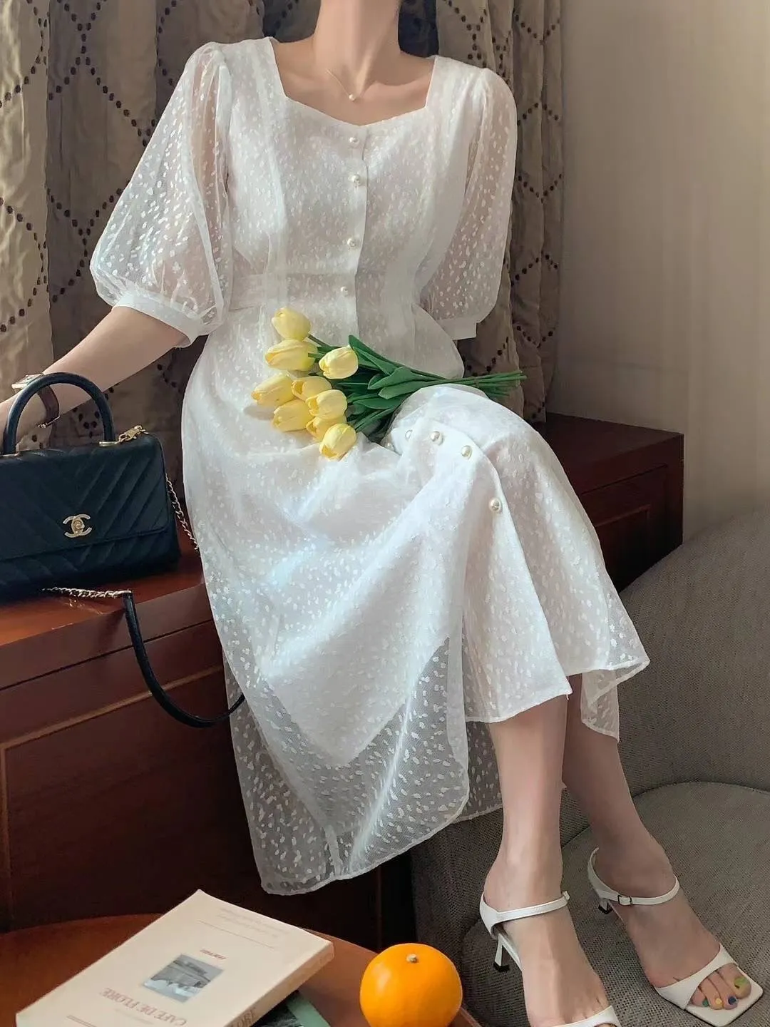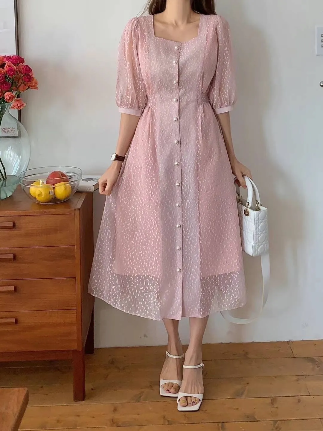 TA886雪花透光珍珠釦洋裝 白 粉 官網價$1520 線上價$1490