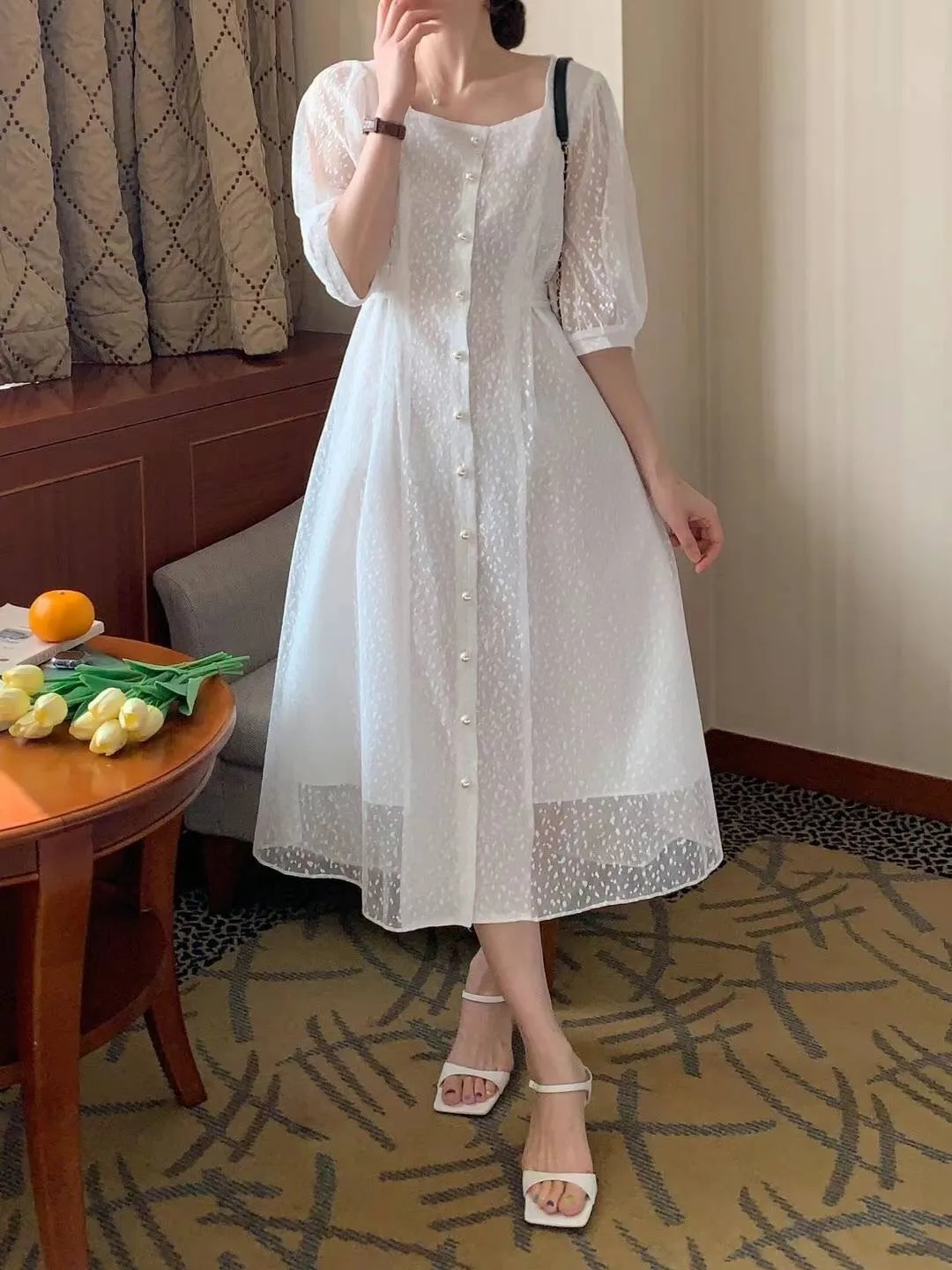 雪紡+網紗 透光視覺 方領顯瘦 珍珠排釦穿脫 有內裡