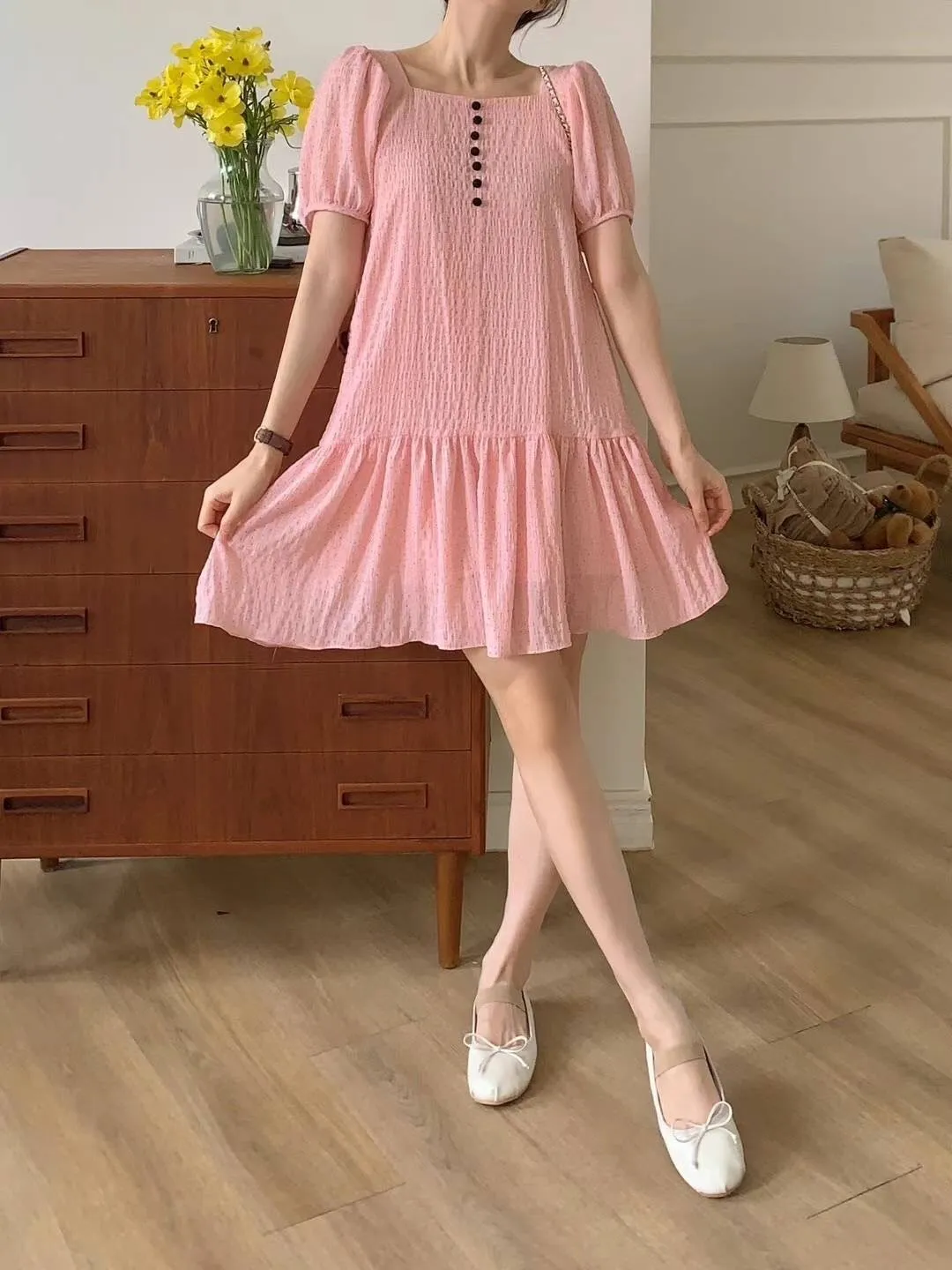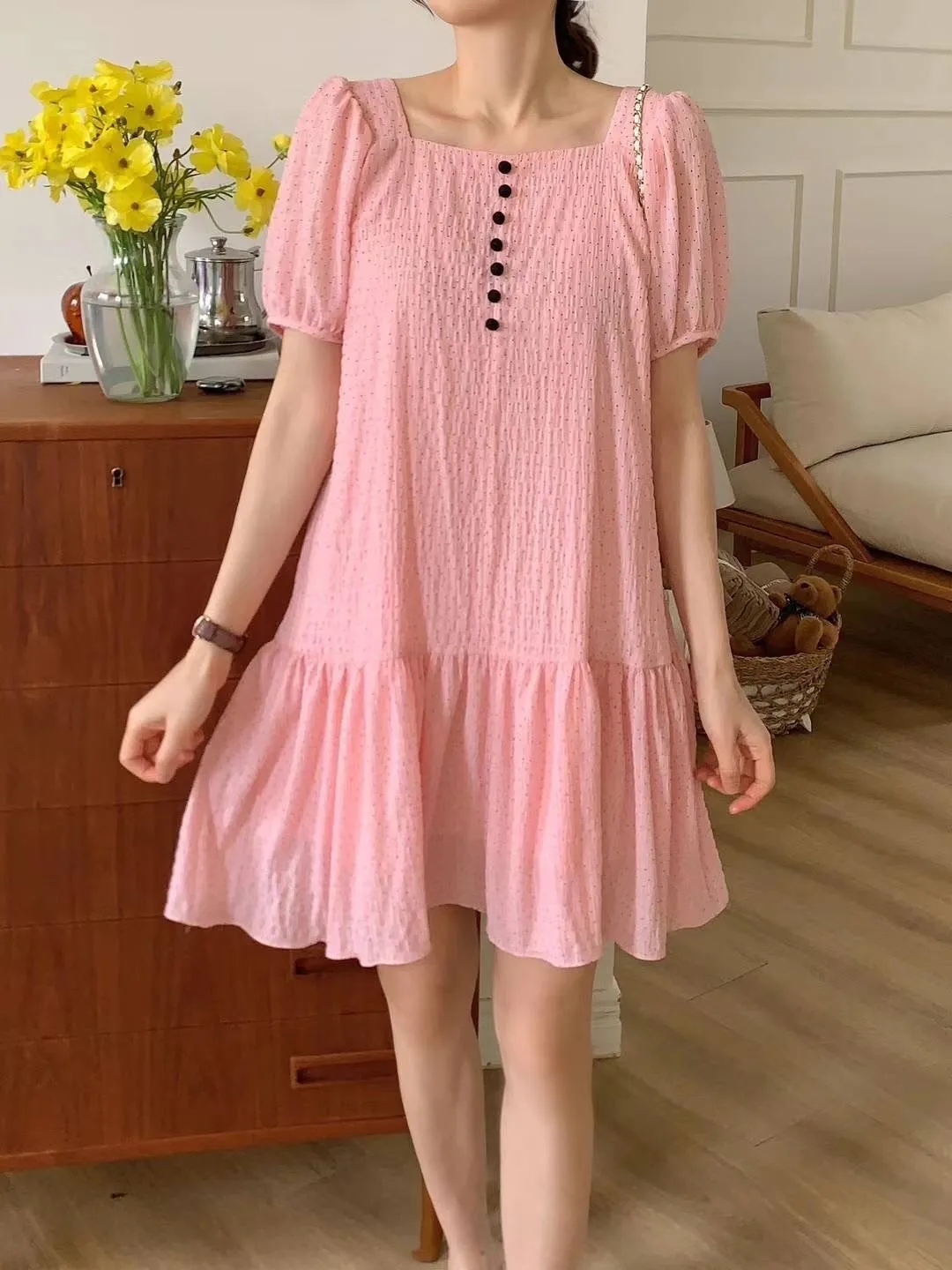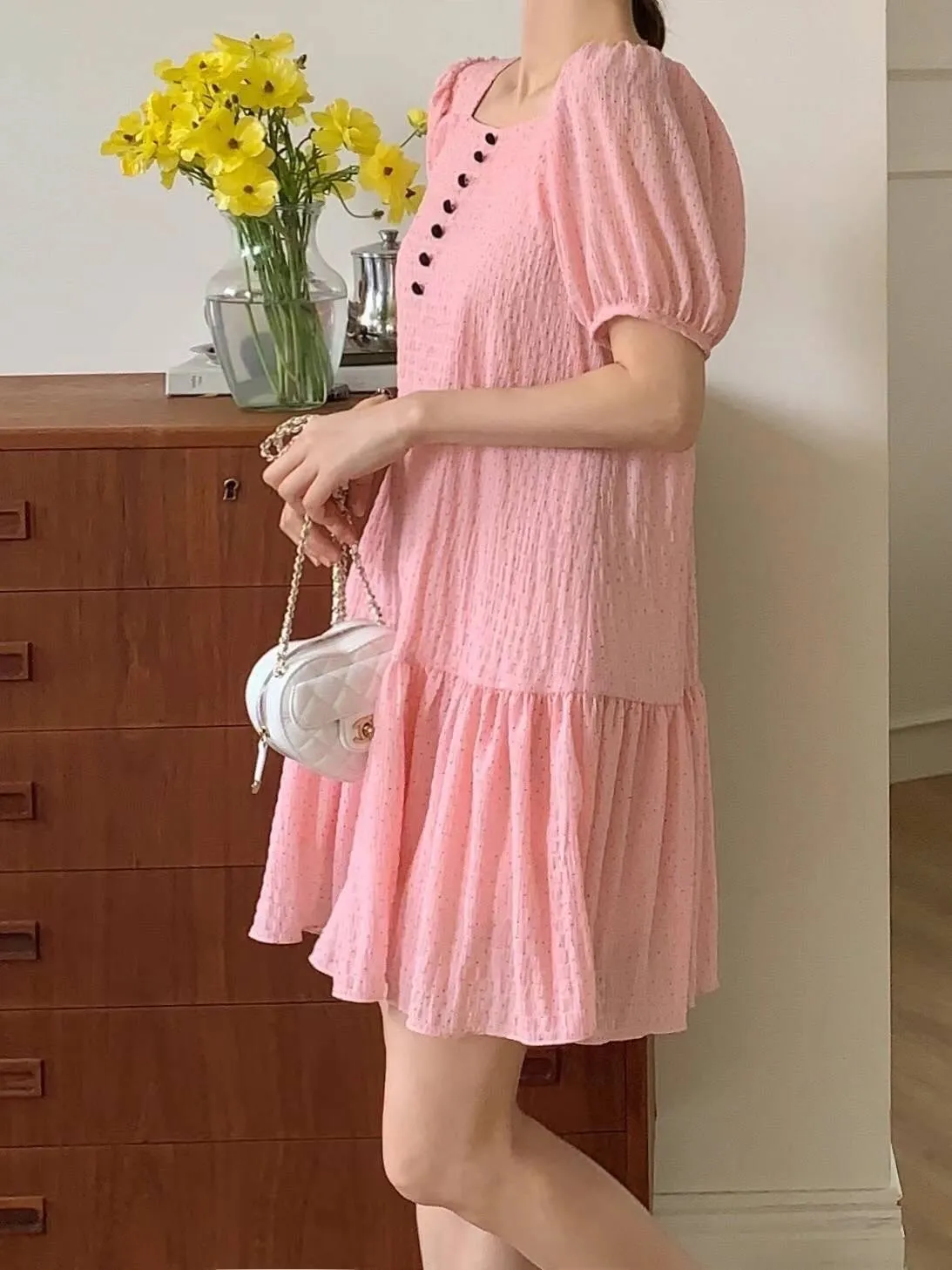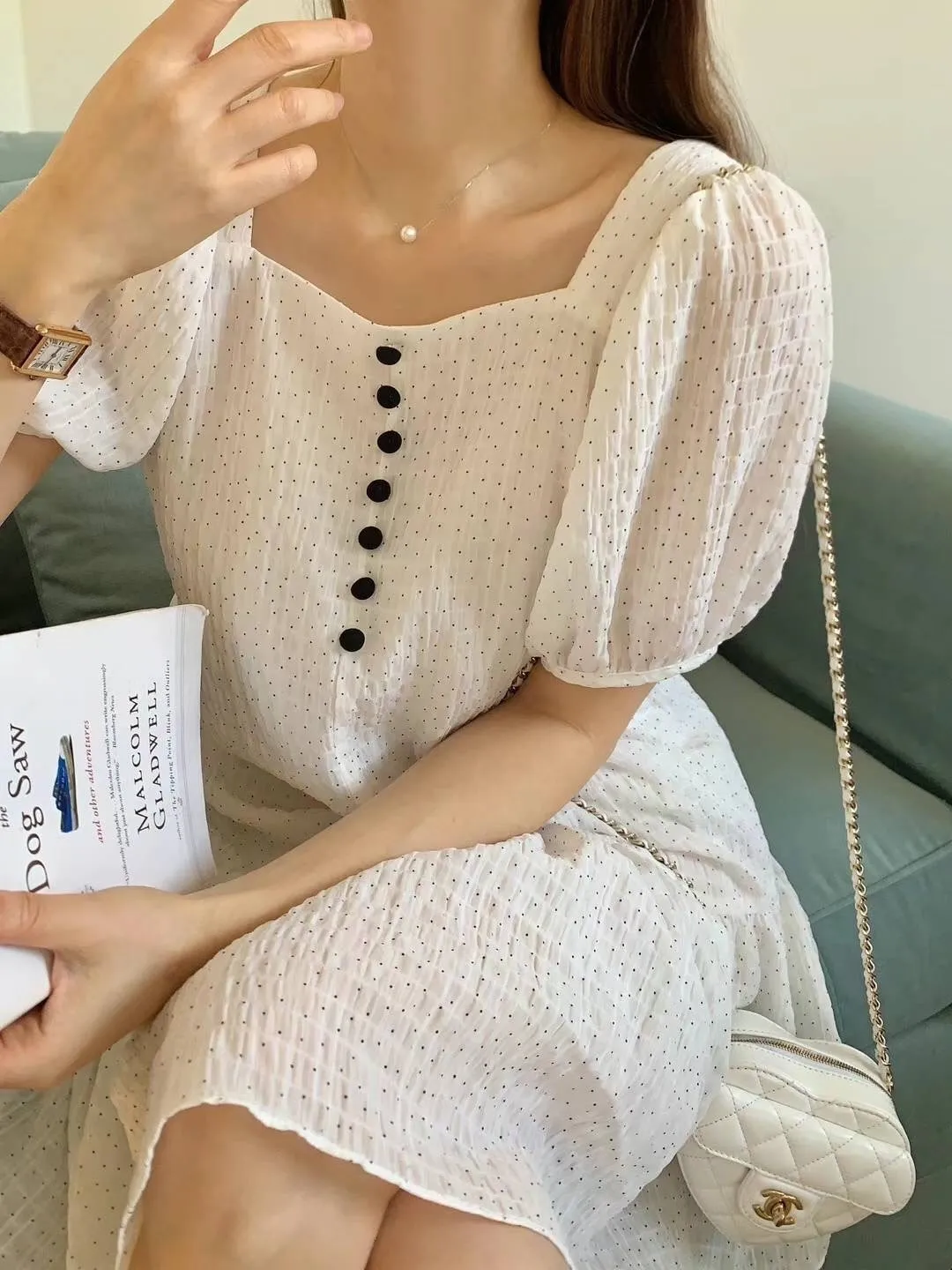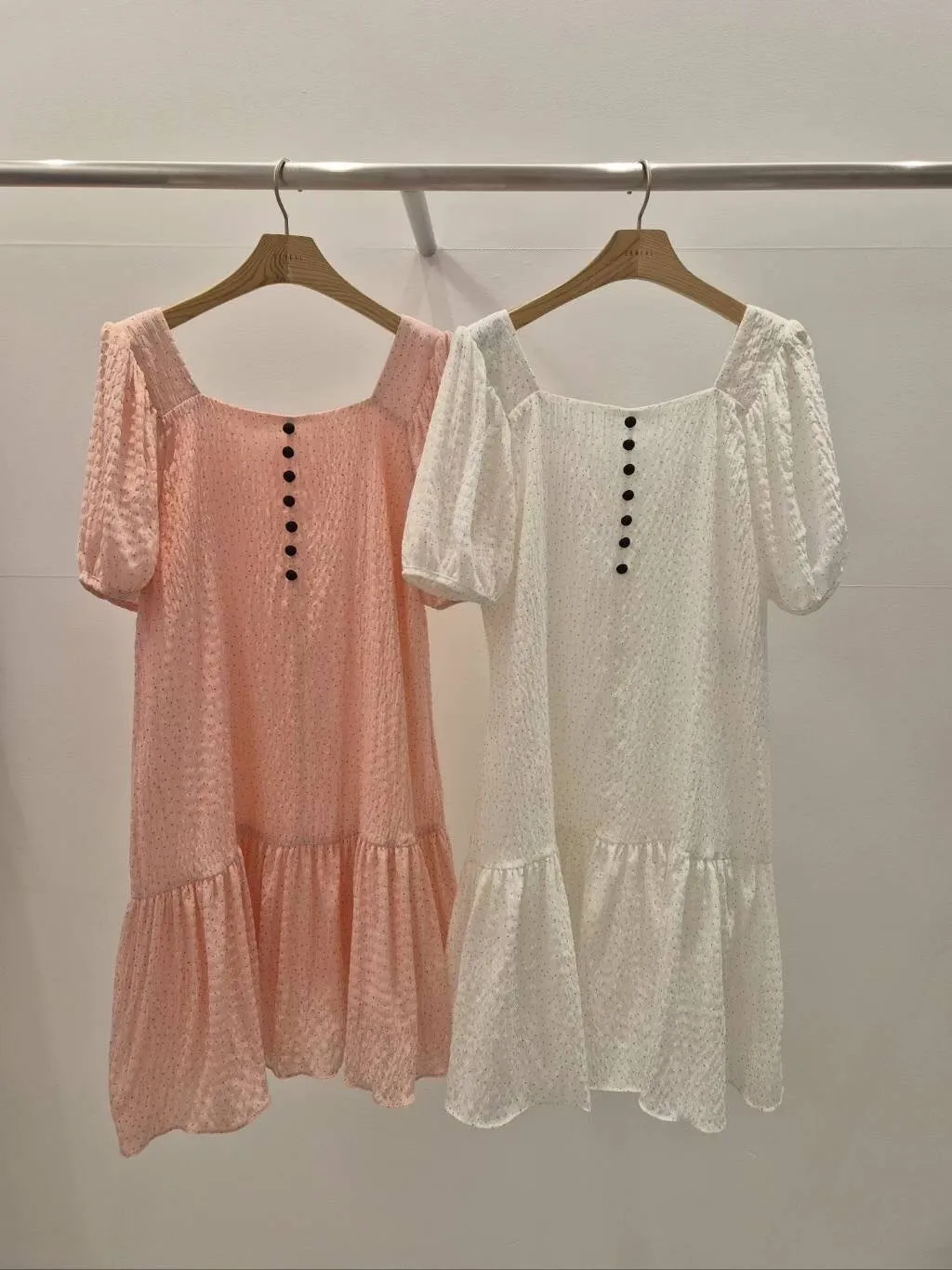 雪紡 飄逸輕盈 細緻點點 蛋糕裙 不易皺 釦子裝飾 拉鍊穿脫