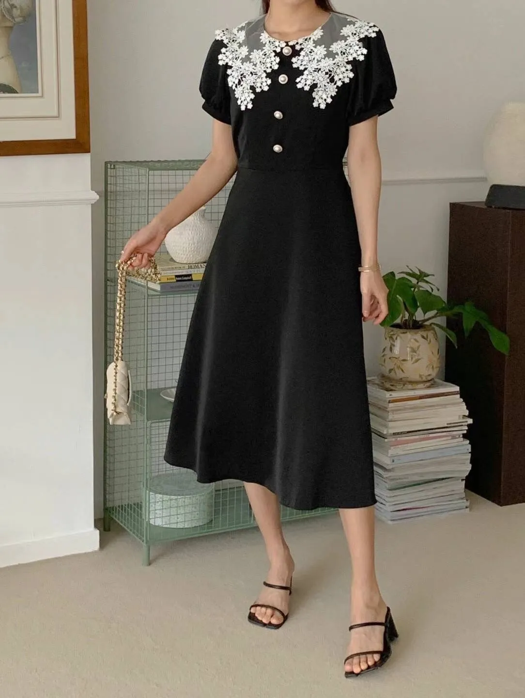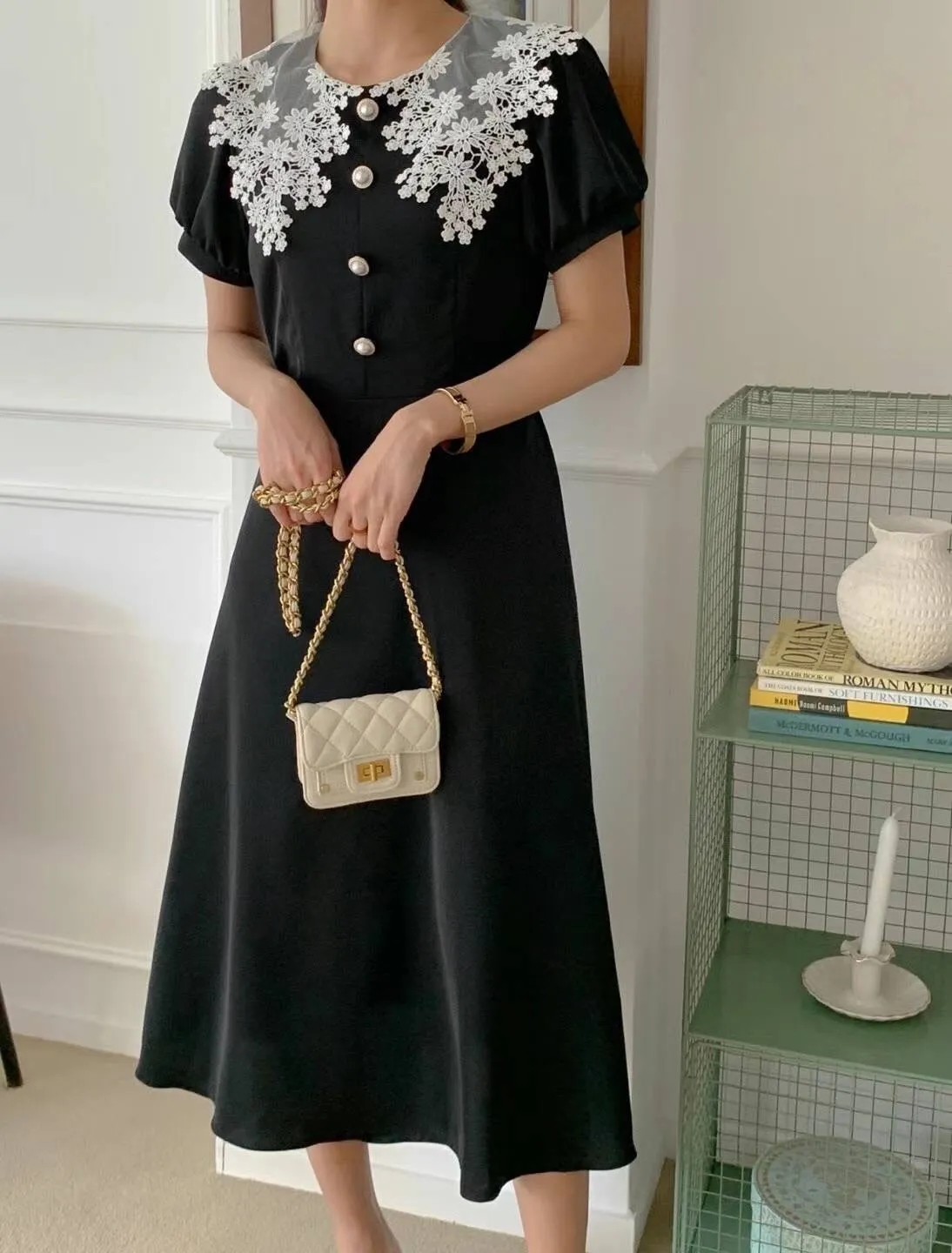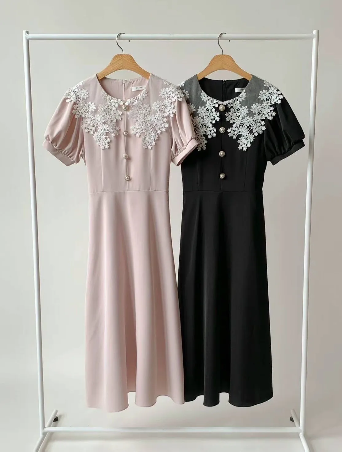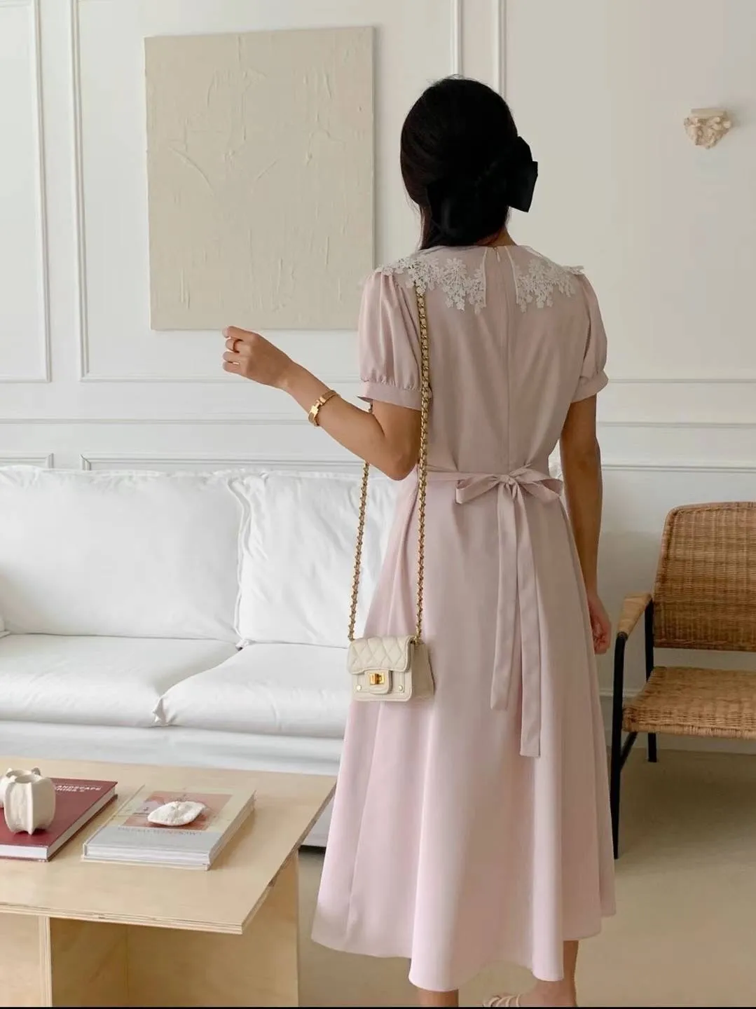 雪紡 棉刺雕花繡翻領 拉鍊穿脫 自然腰身 腰有綁帶 穿到M號
