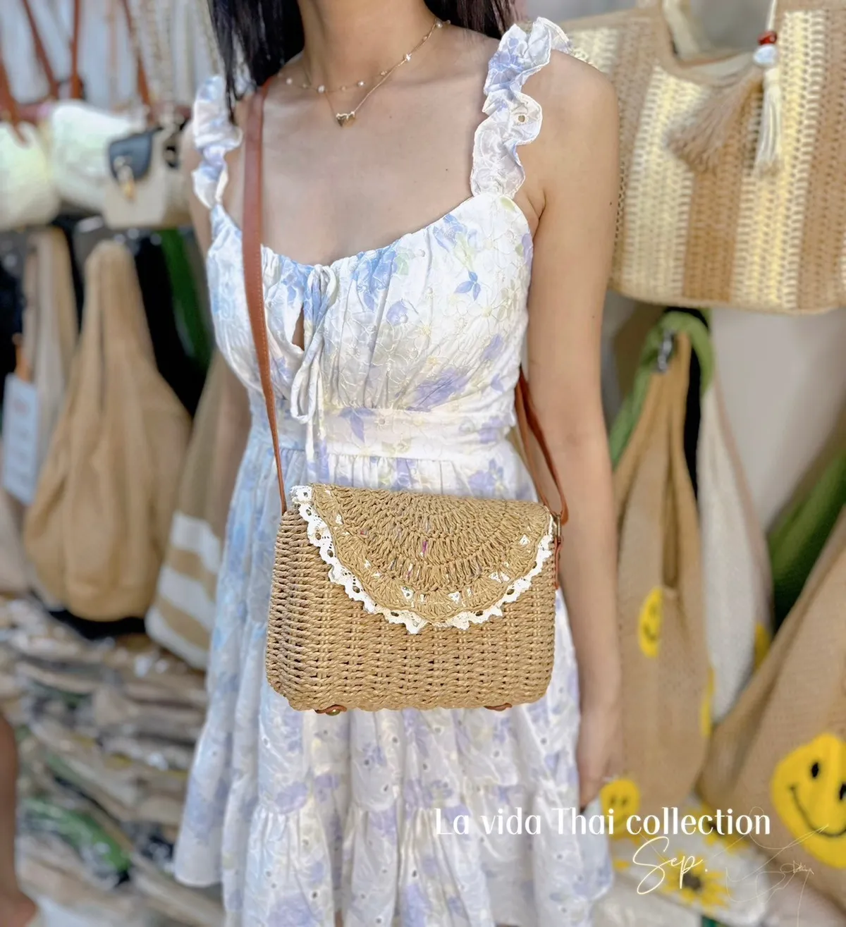 草編包 皮革背帶可調 瓷釦閉合 內理可愛精緻花花布 輕盈不重