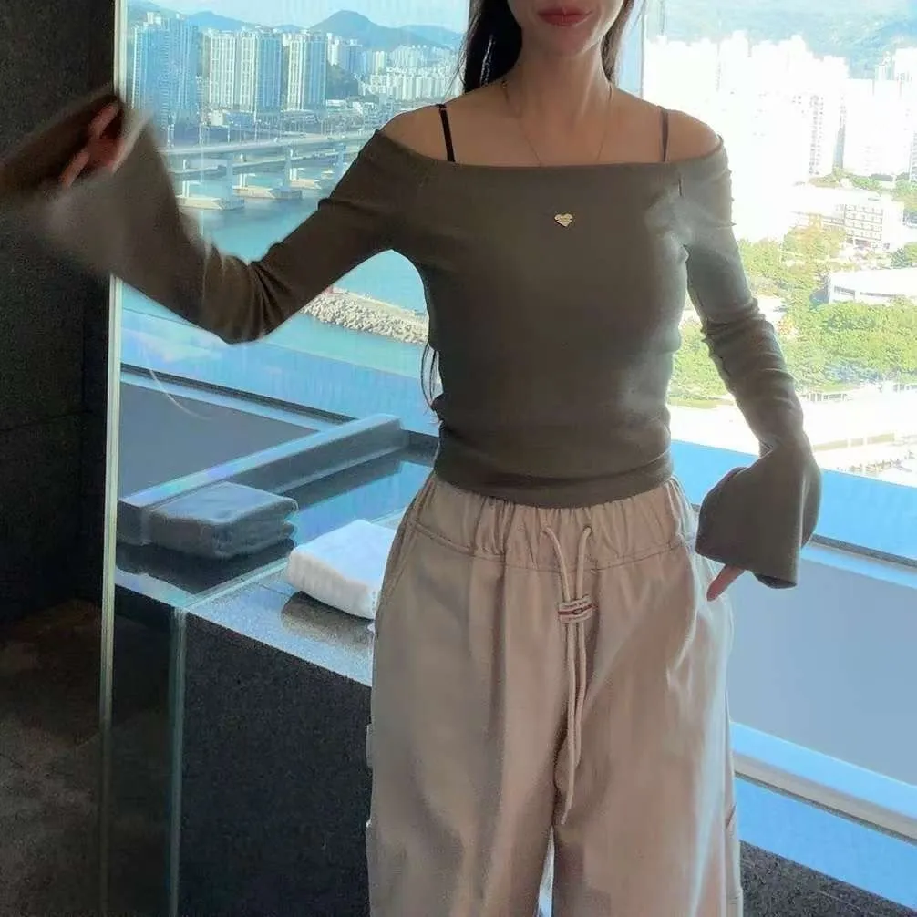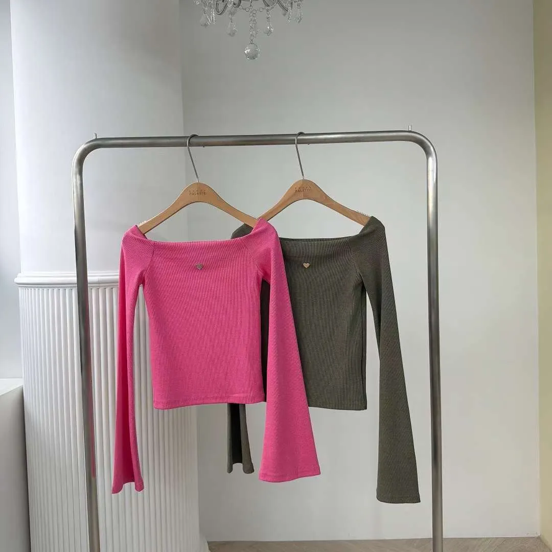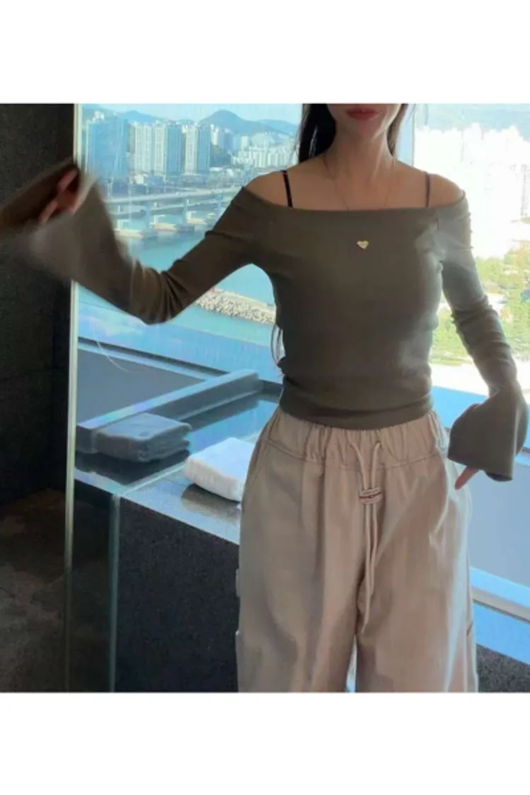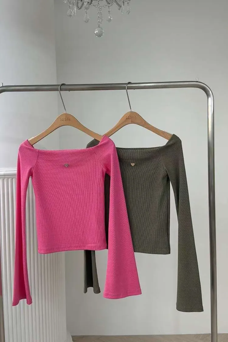 棉+彈力 喇叭袖顯瘦 胸前小愛心 可一字領