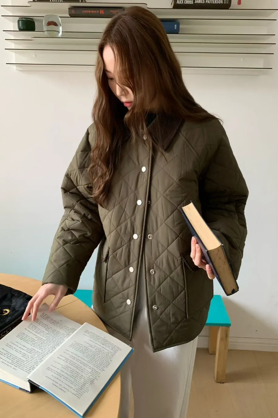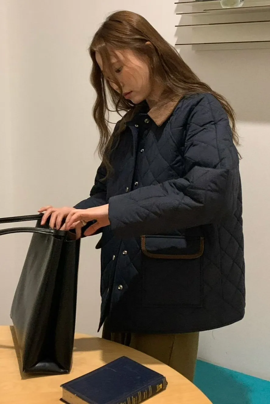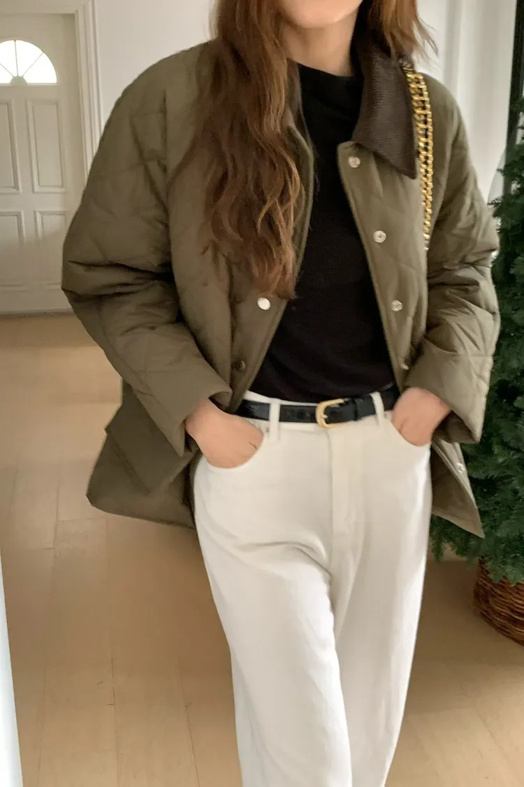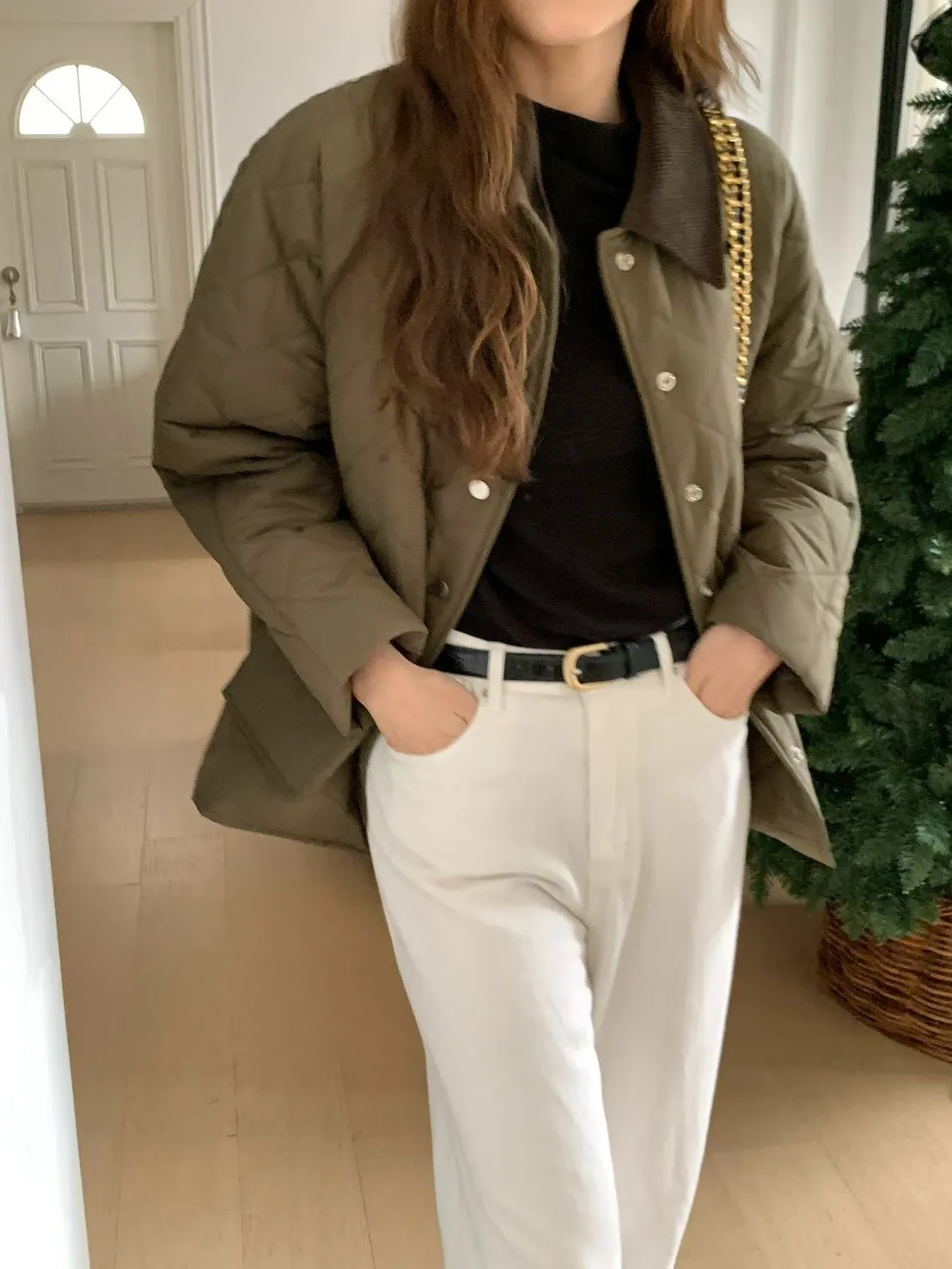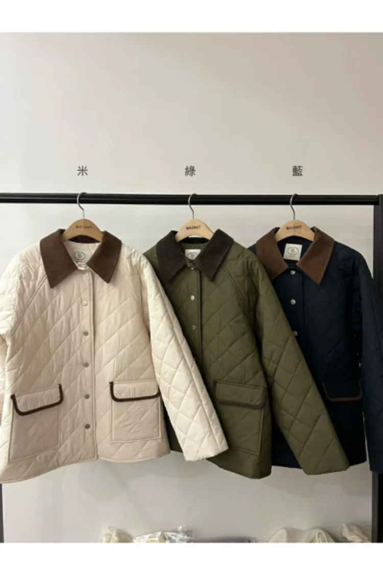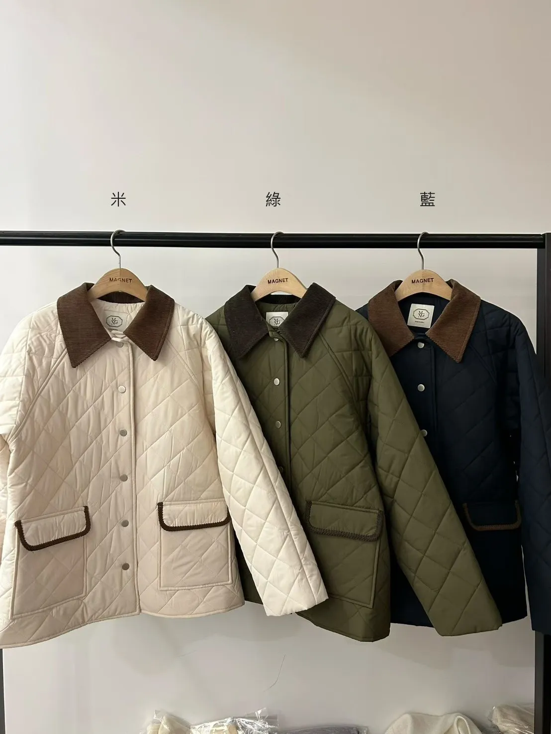 棉+尼龍 高單工廠製造 菱格鋪棉 輕盈質地 燈心絨領 有口袋