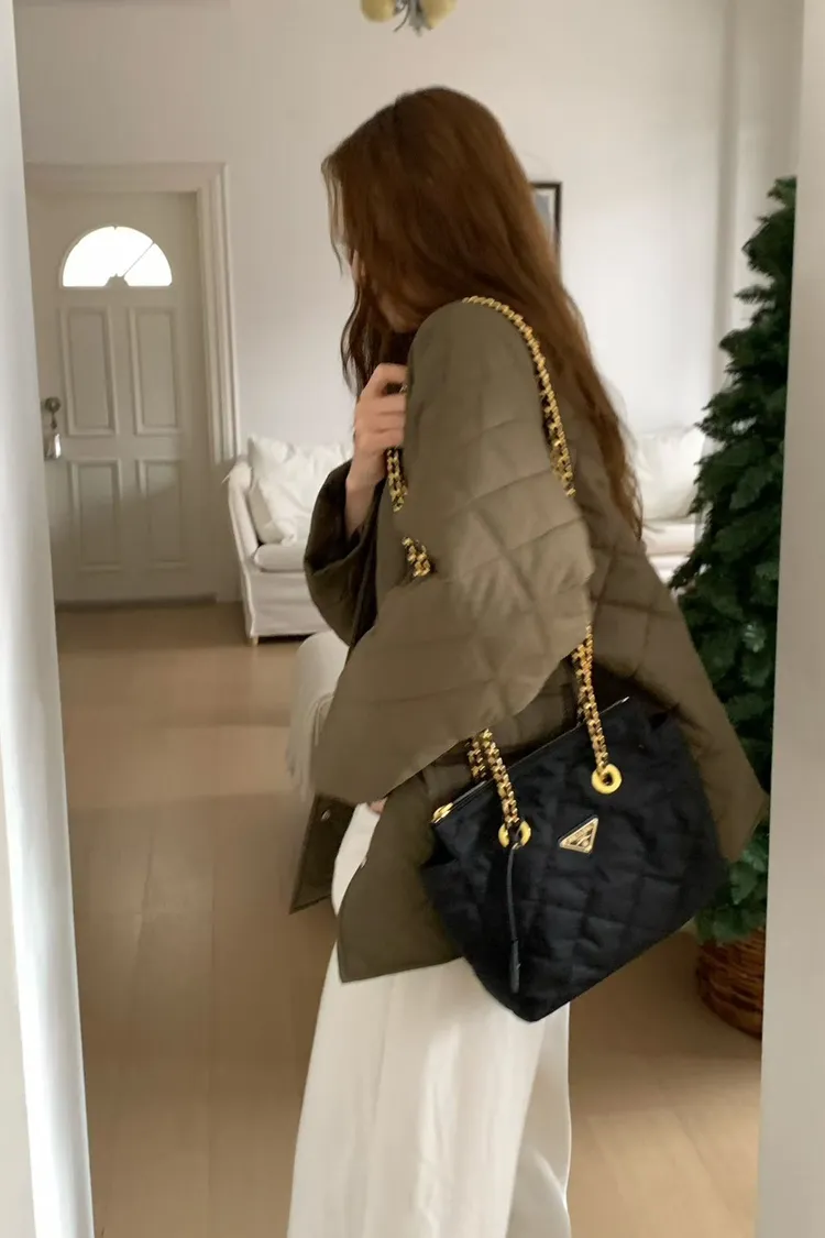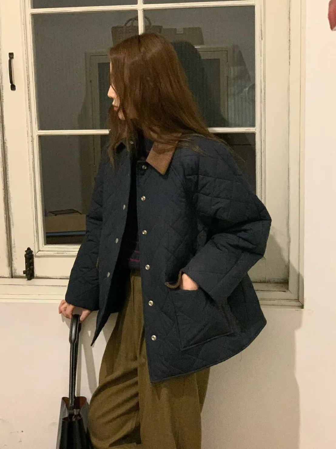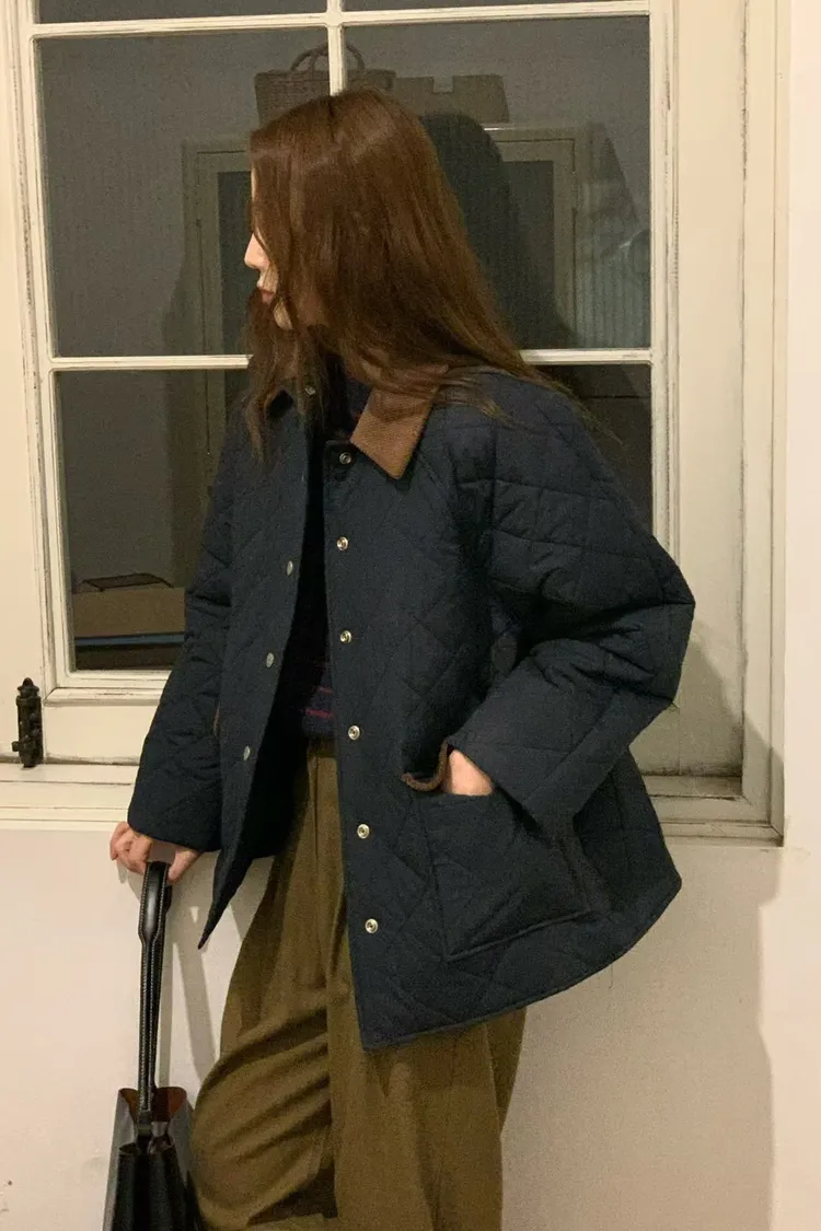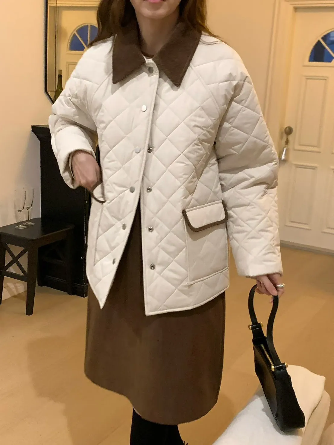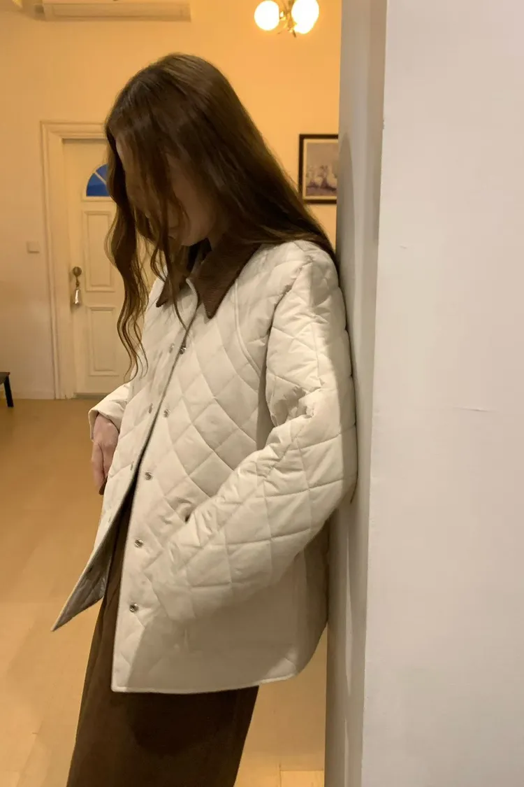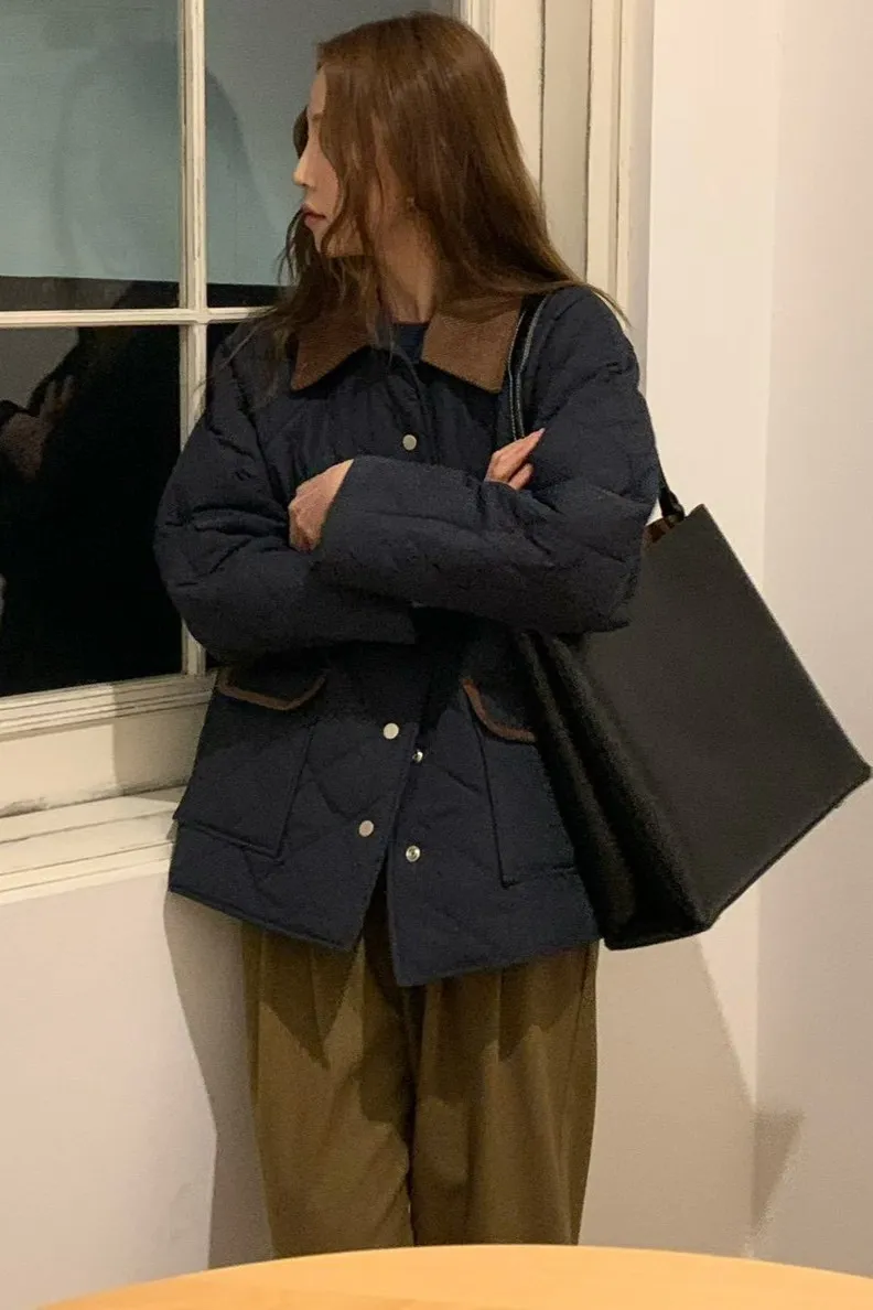 棉+尼龍 高單工廠製造 菱格鋪棉 輕盈質地 燈心絨領 有口袋