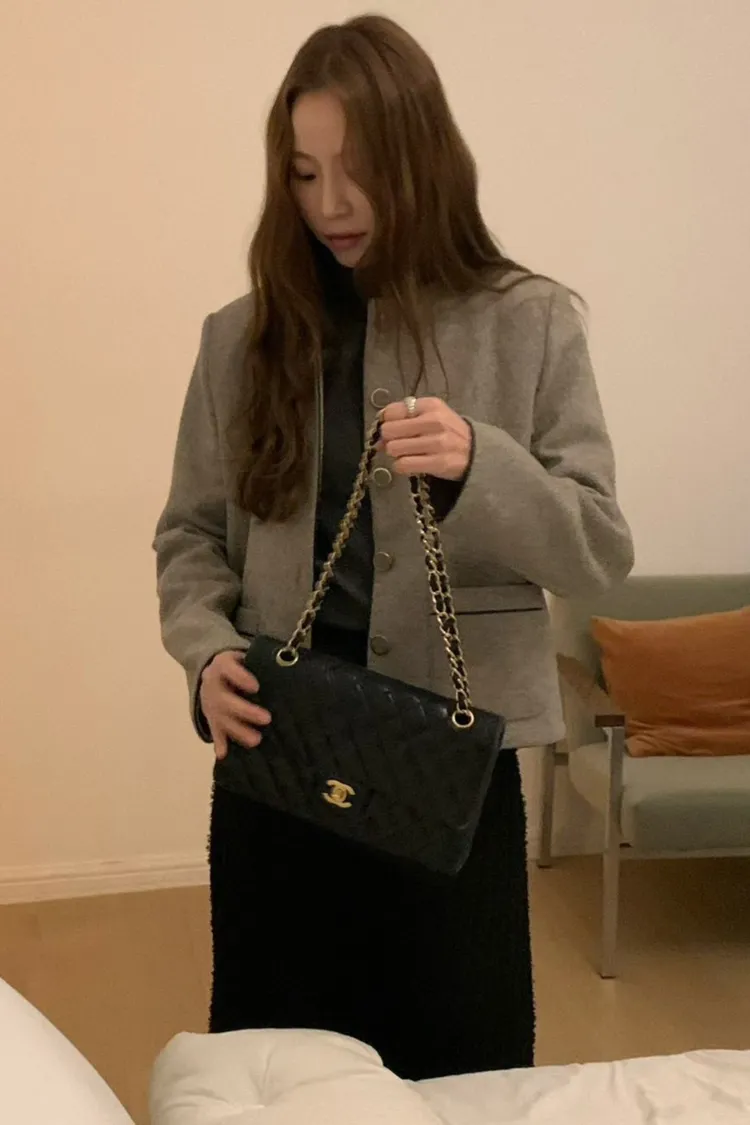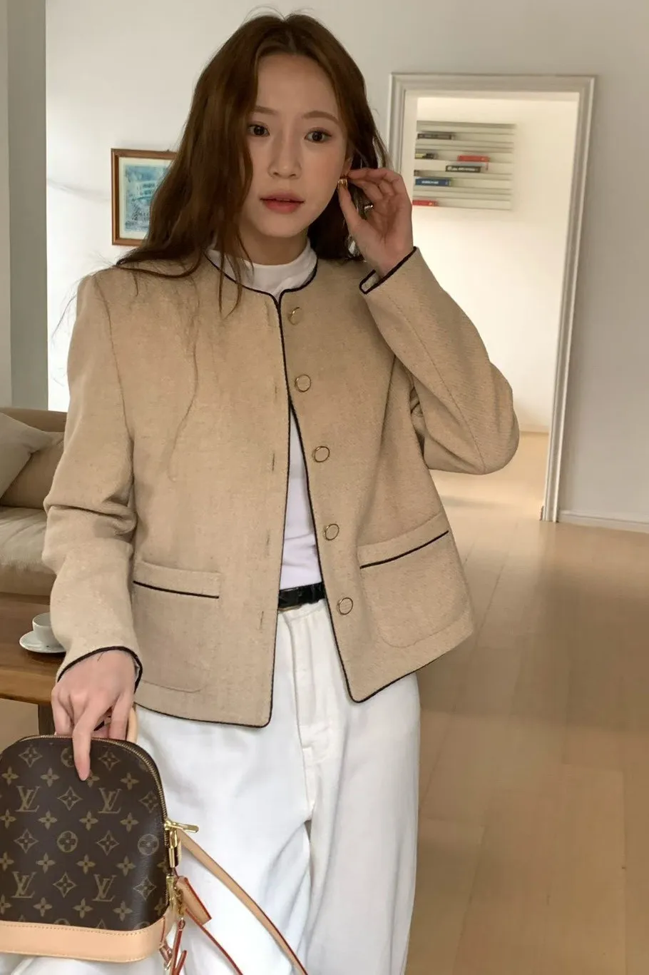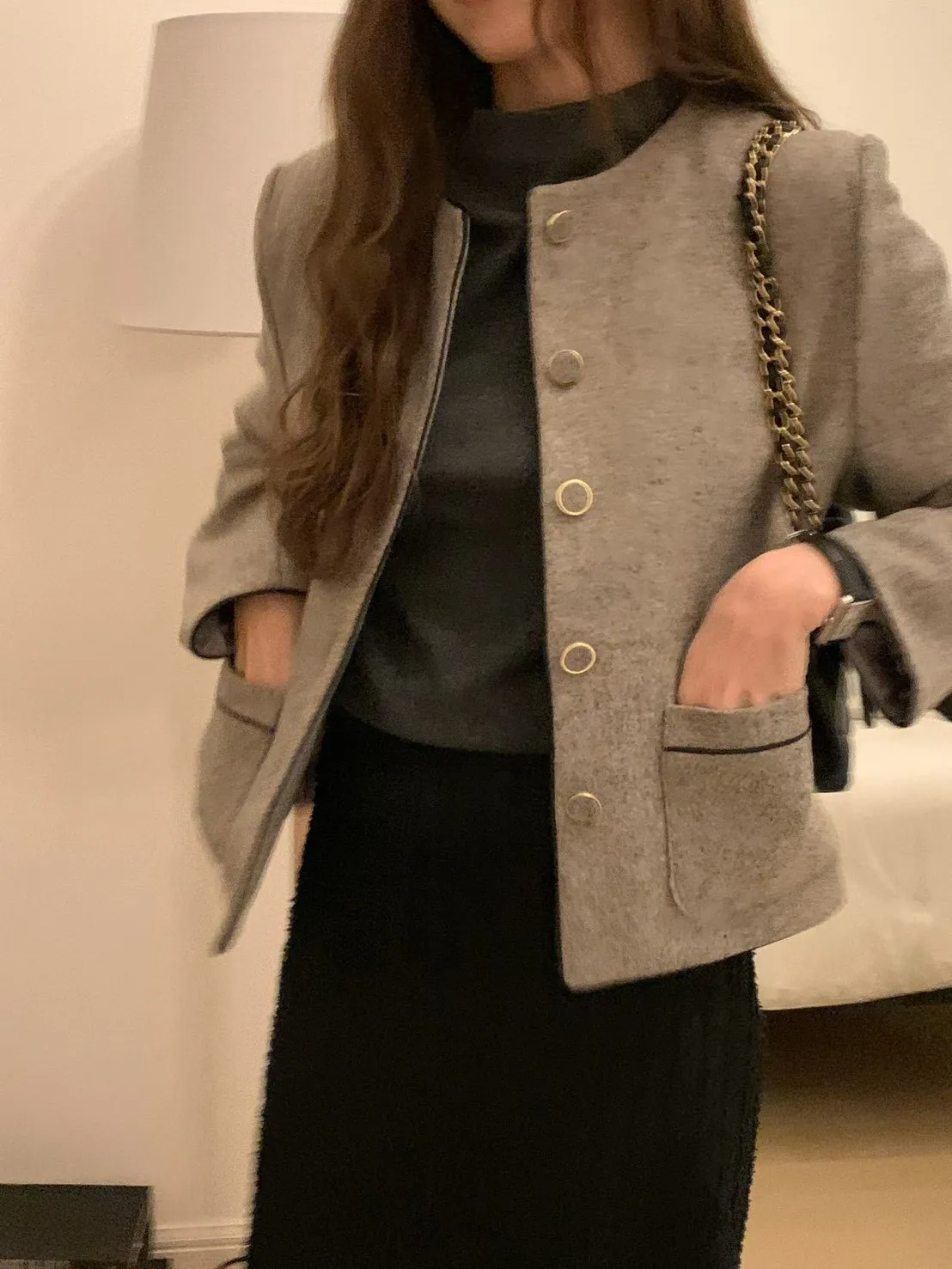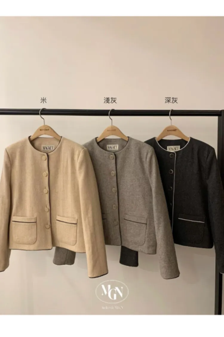 羊毛70%+聚酯 韓系學院風 底部雙口袋 金圓框美釦