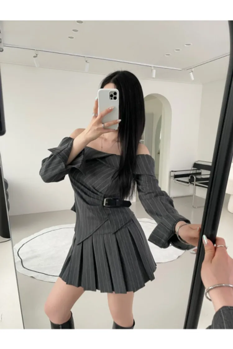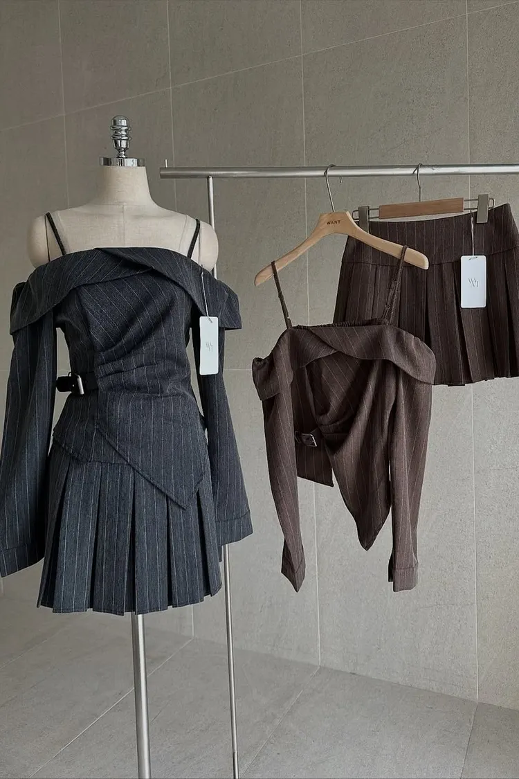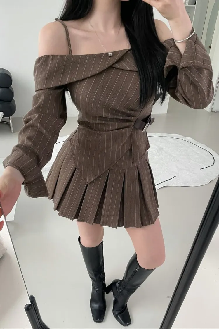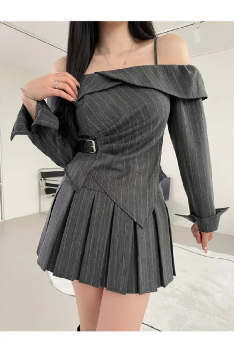 棉+聚酯 小性感縮腰鎖骨上衣 百褶裙 穿到M號