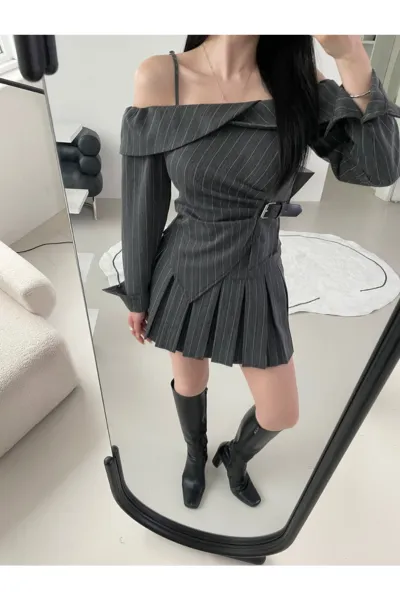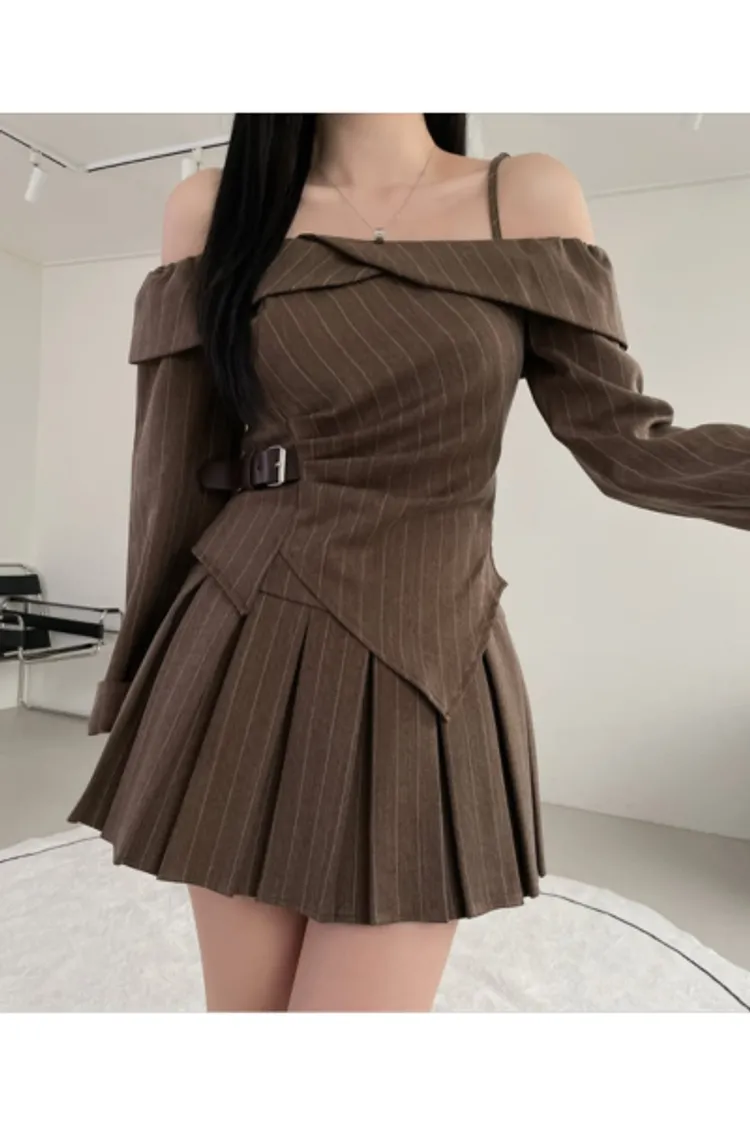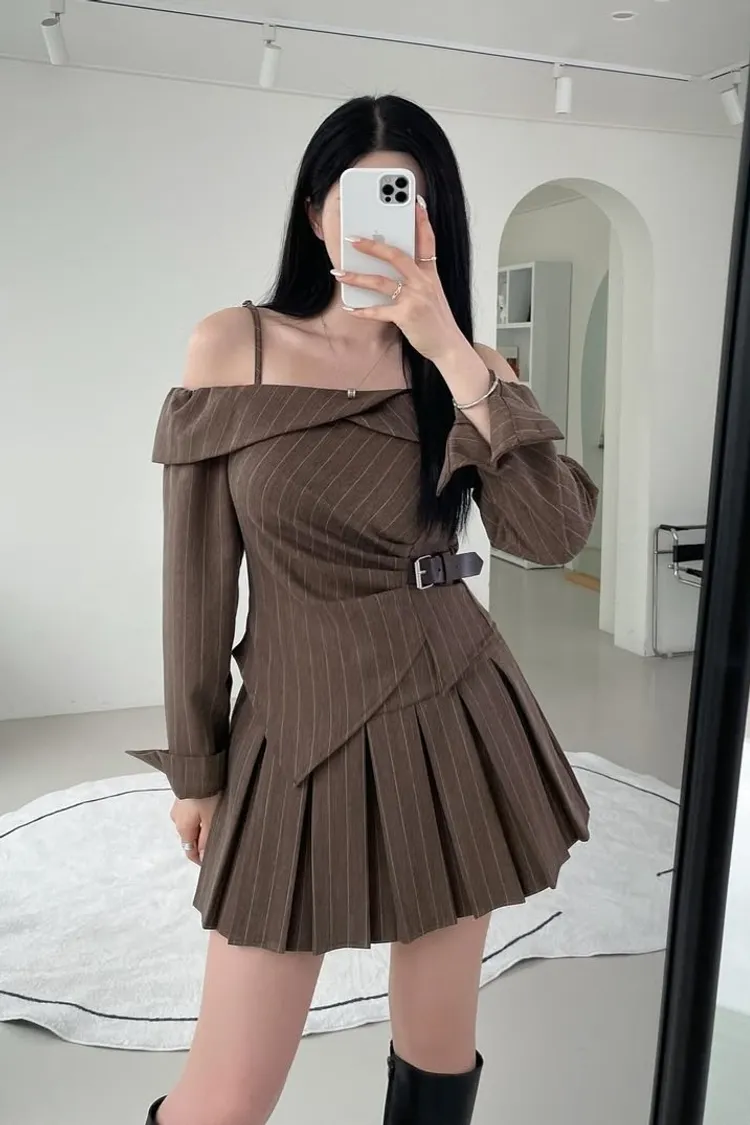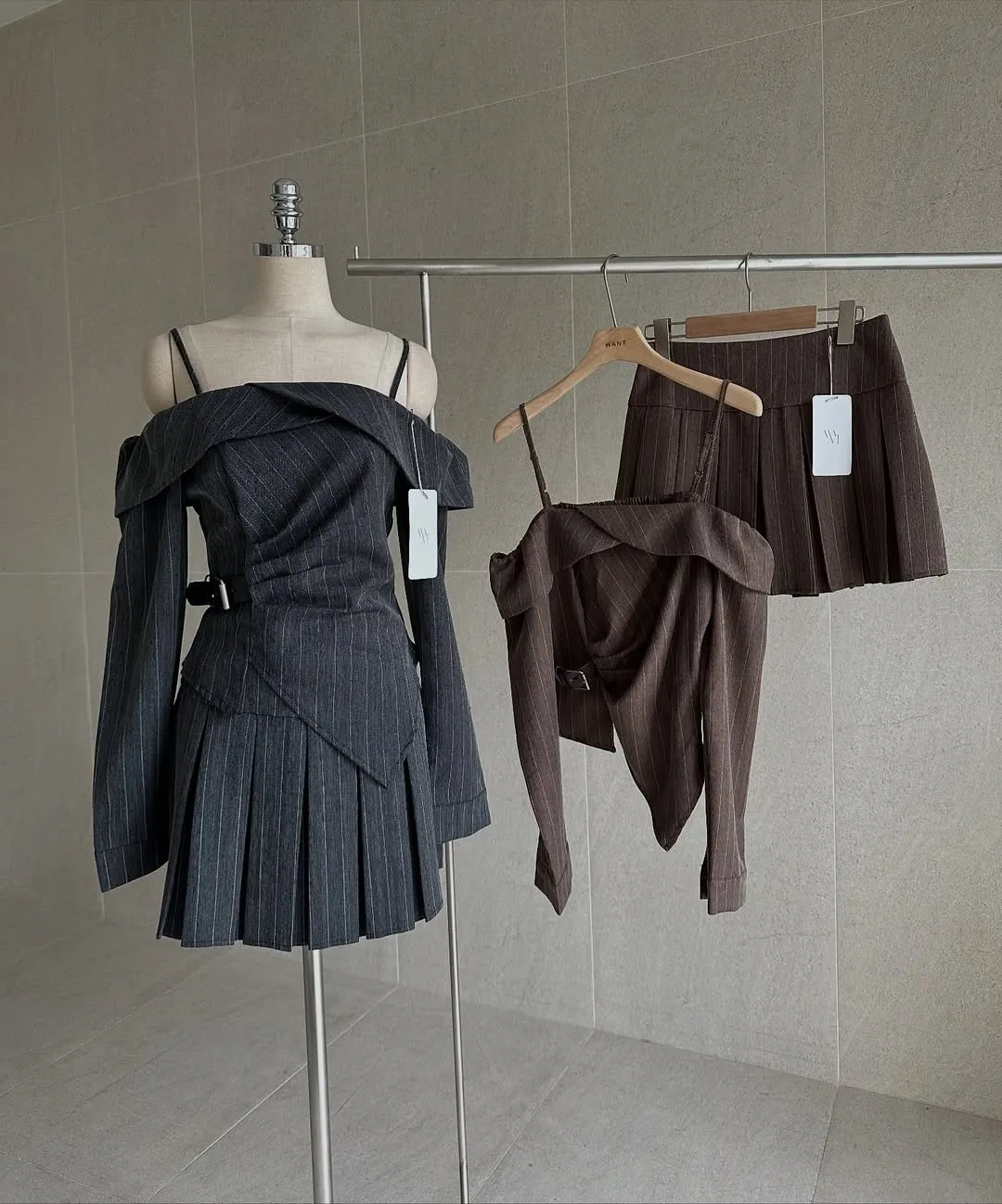 棉+聚酯 小性感縮腰鎖骨上衣 百褶裙 穿到M號