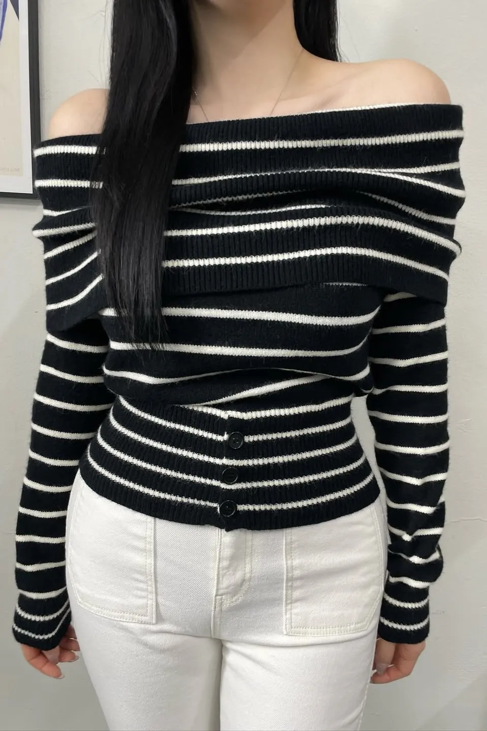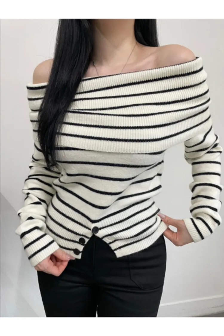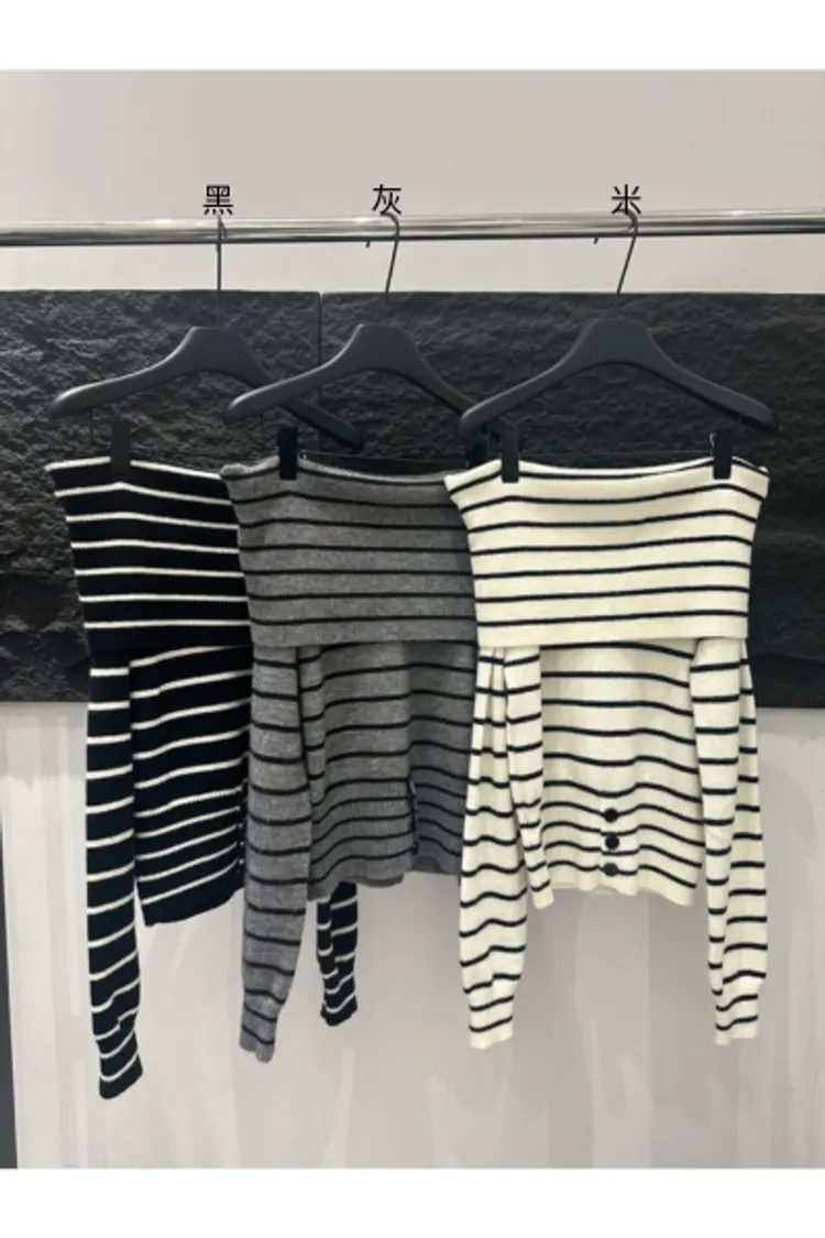 聚酯+彈力 下擺可愛鈕扣 可拉一字領 彈性針織面料 觸感舒適