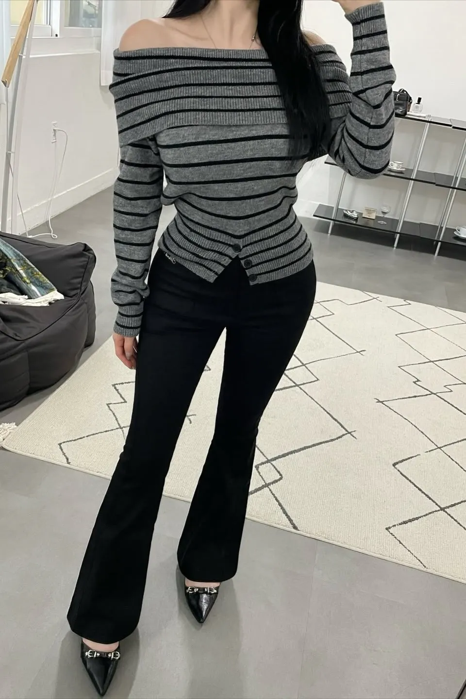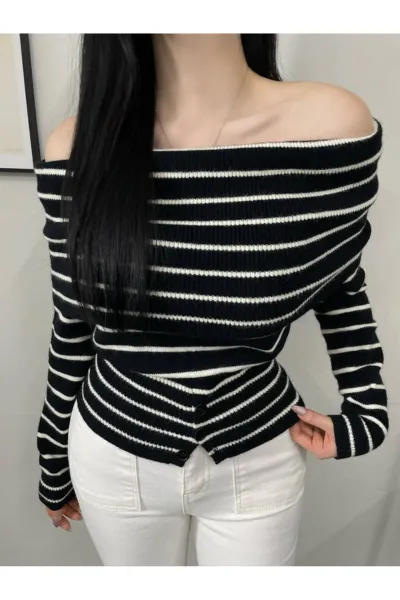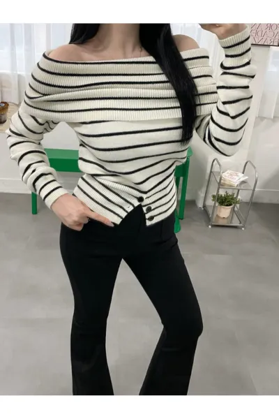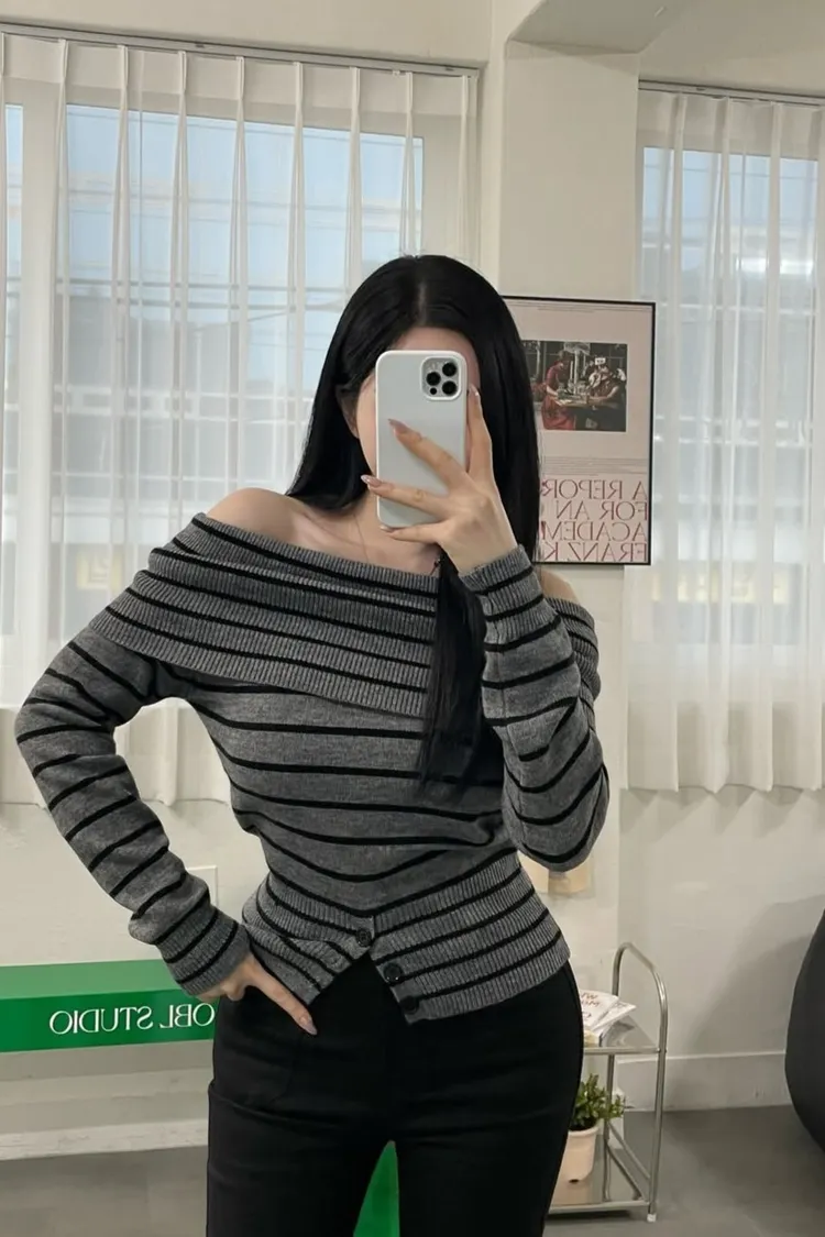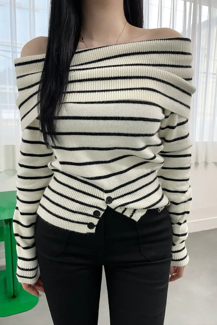 聚酯+彈力 下擺可愛鈕扣 可拉一字領 彈性針織面料 觸感舒適