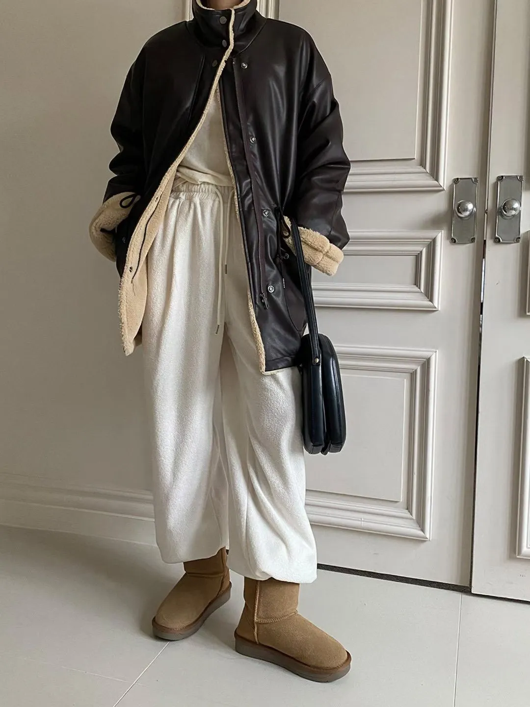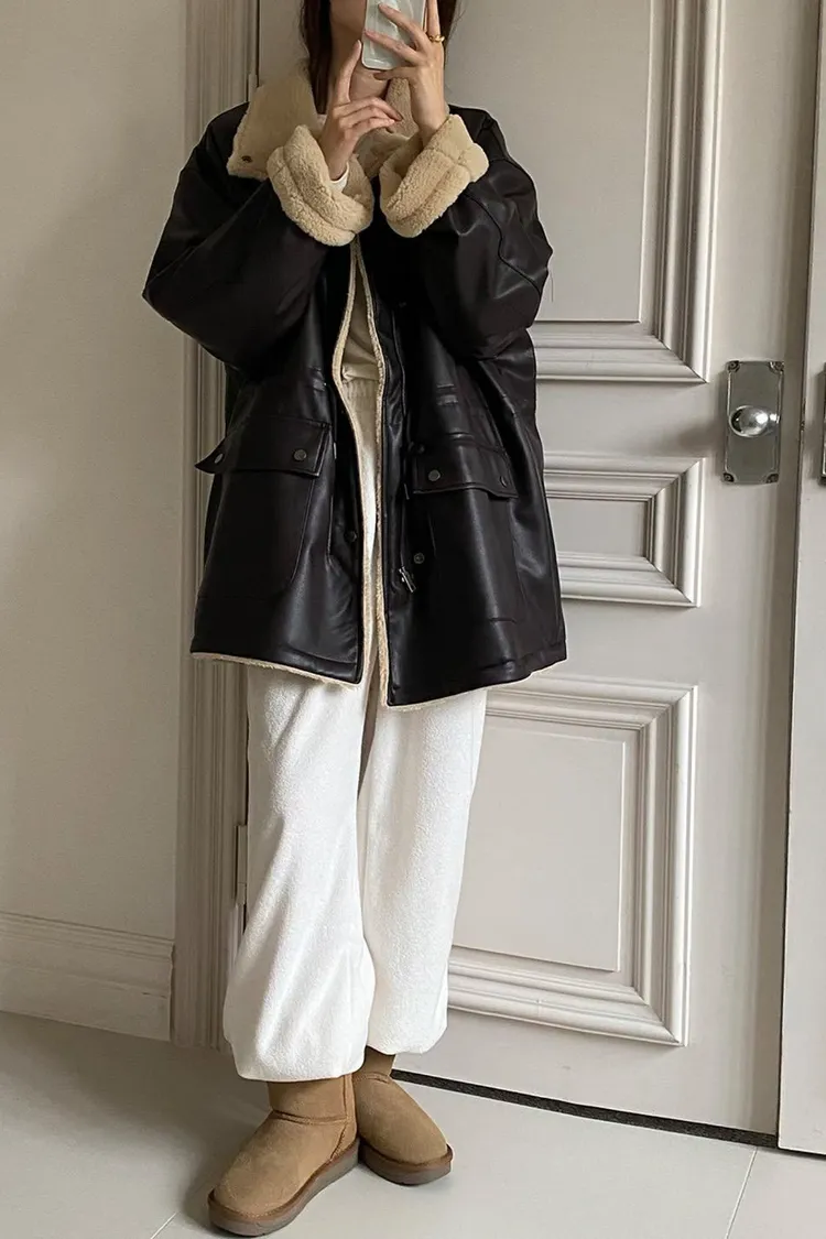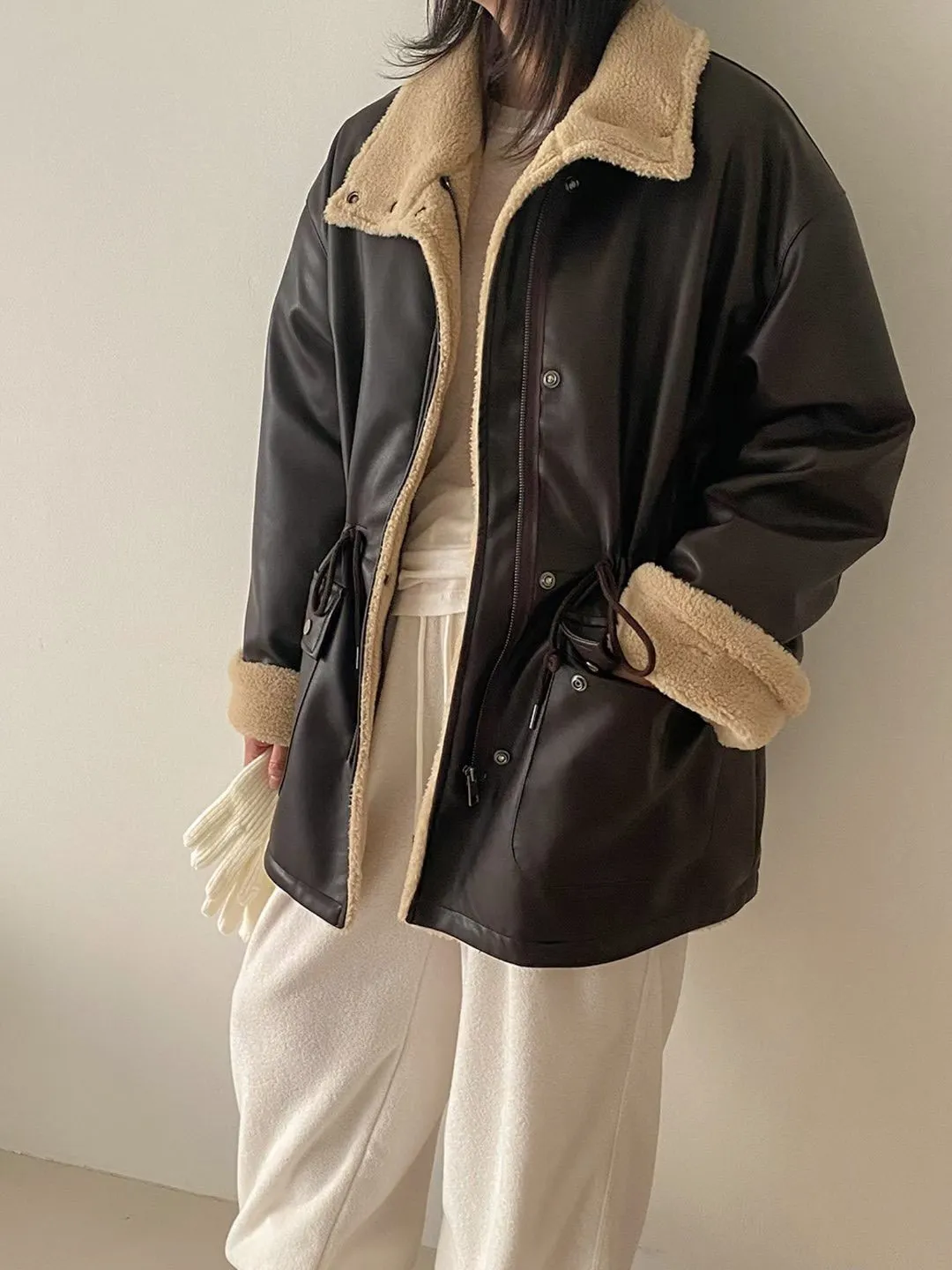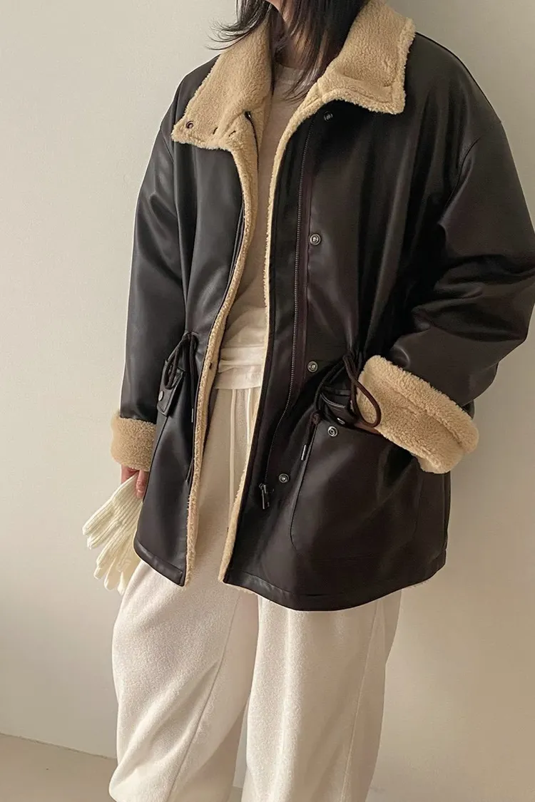合成皮革 柔軟皮革 細腰抽繩 有口袋 內襯羊羔毛 1.5公斤