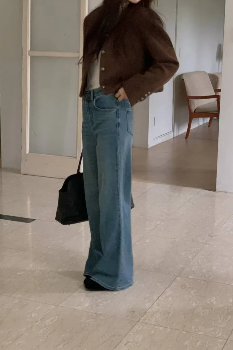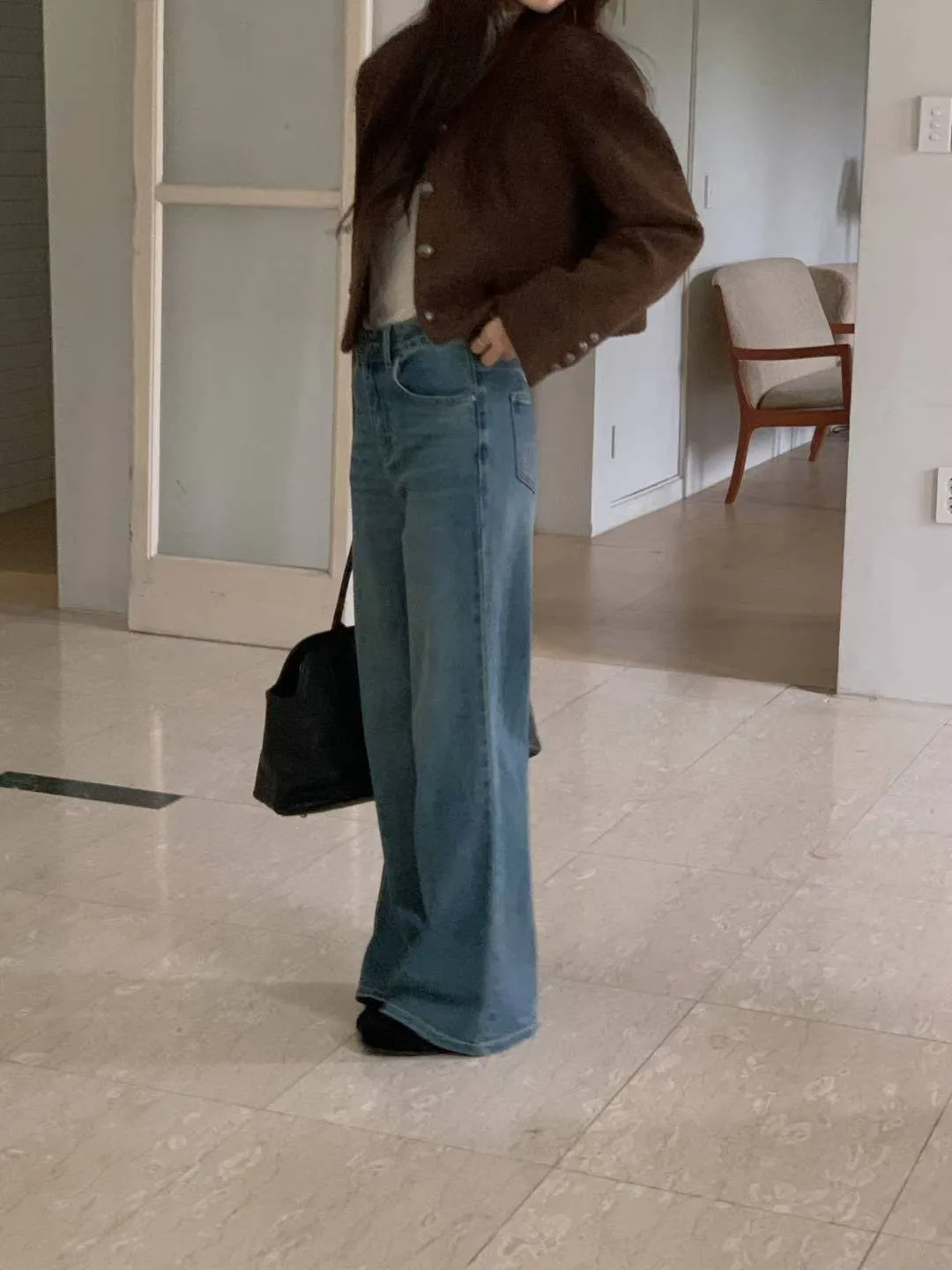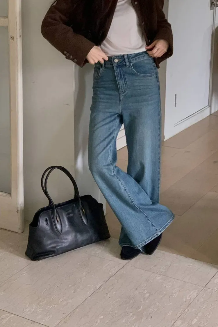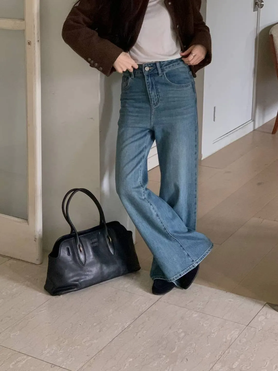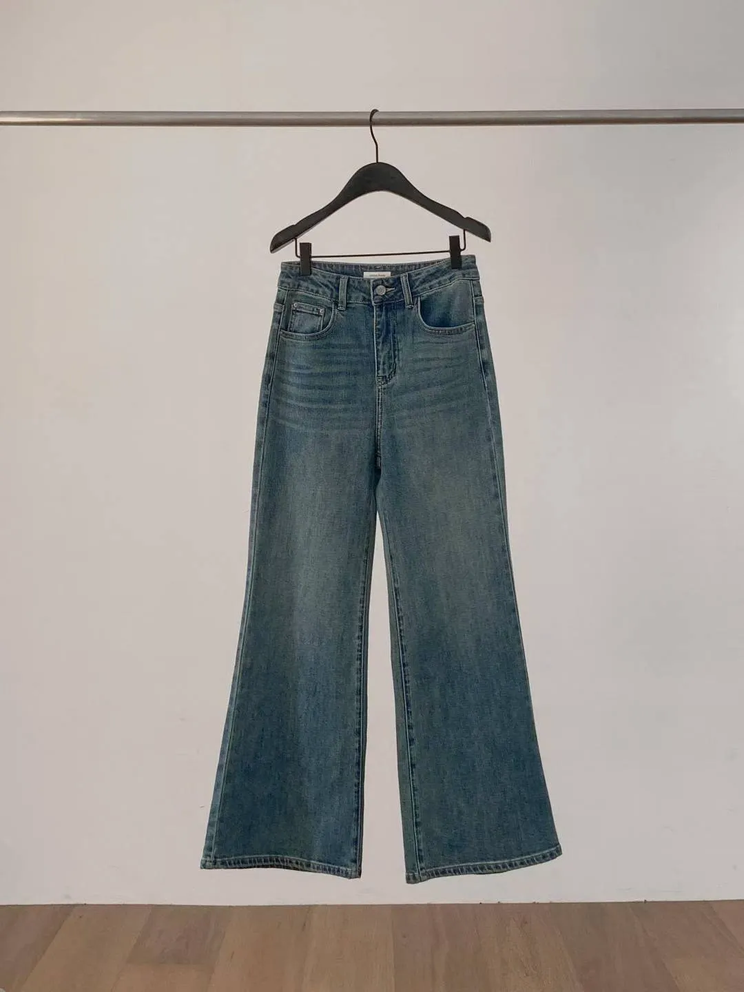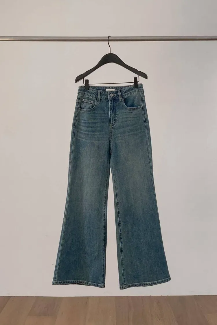 自然刷色 釦練穿脫 高腰版 微微喇叭 微彈性 四季可穿