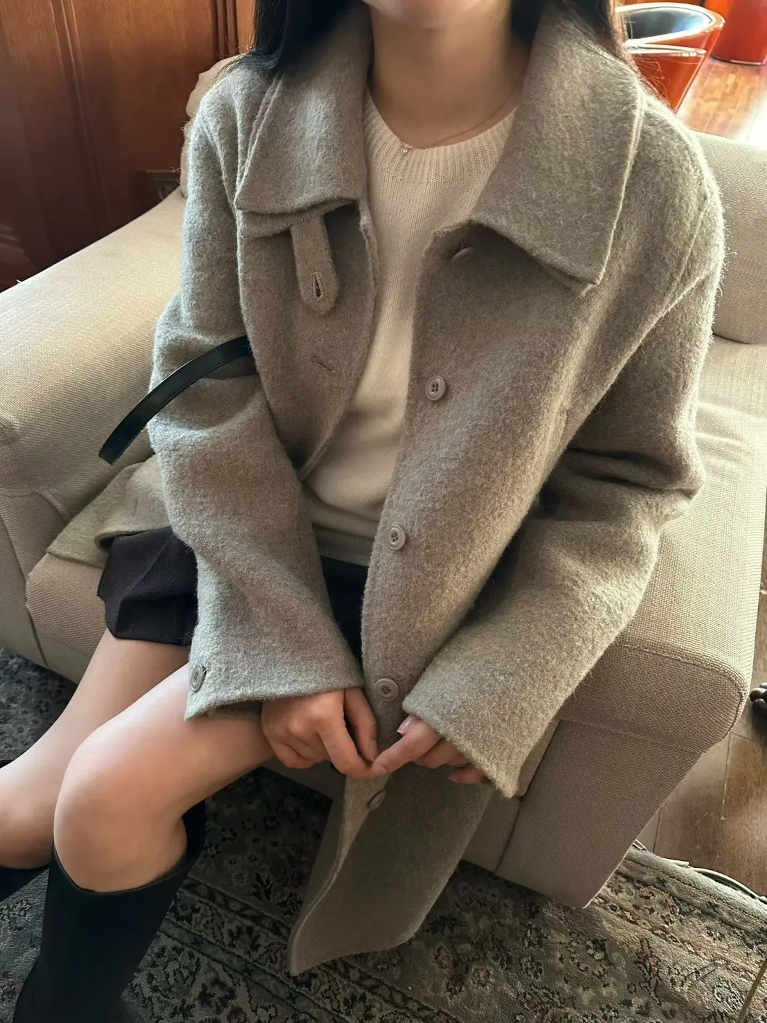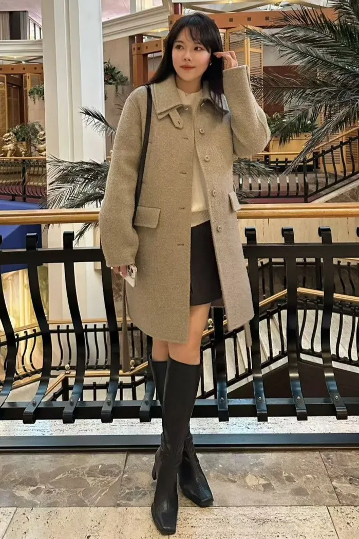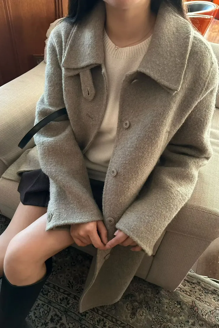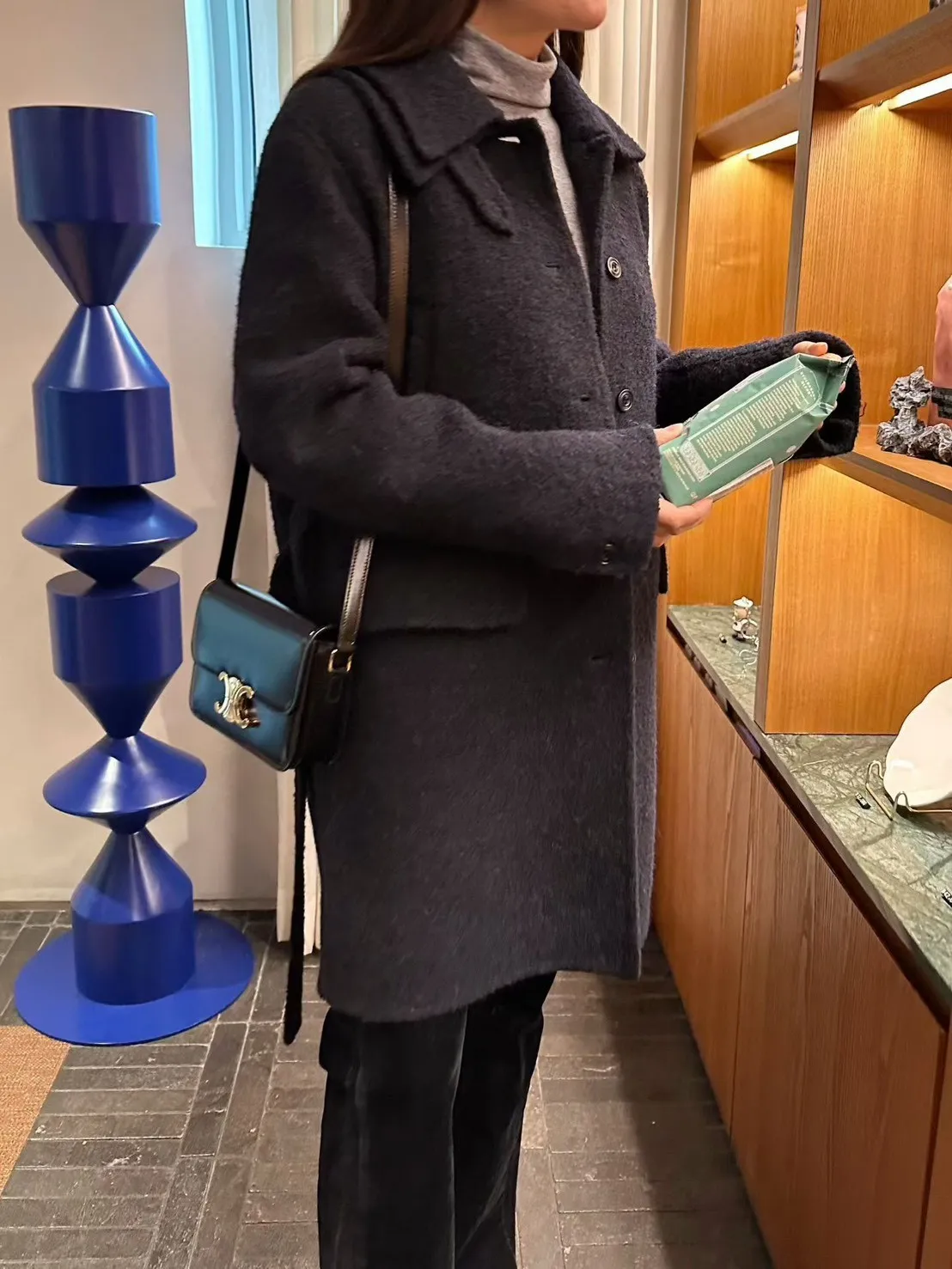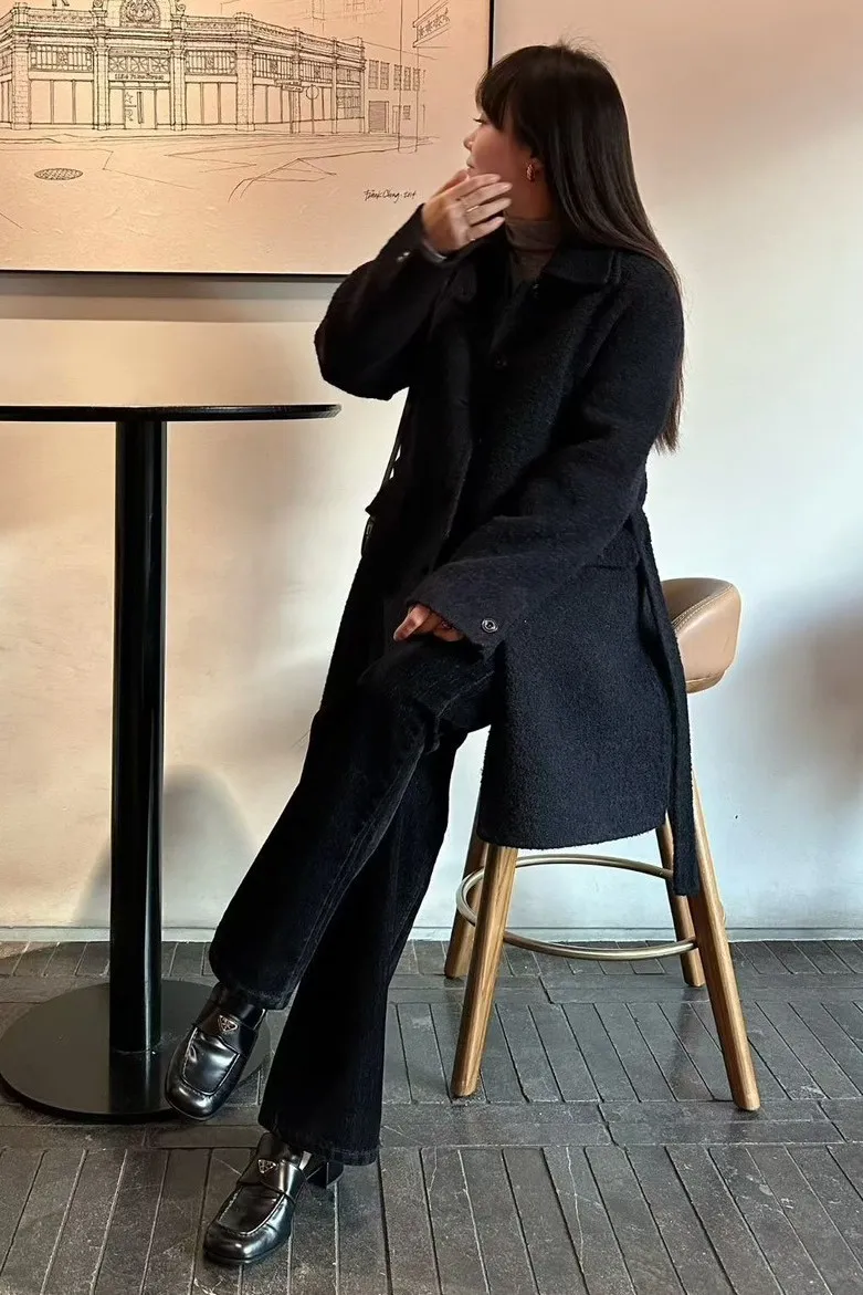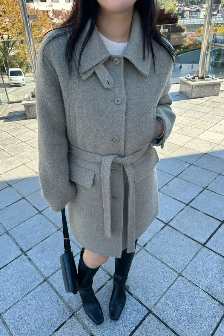安哥拉8%+羊駝10%+羊毛70%+聚酯 排釦穿脫 兩層領 腰綁帶 有口袋有內裡 1.3公斤