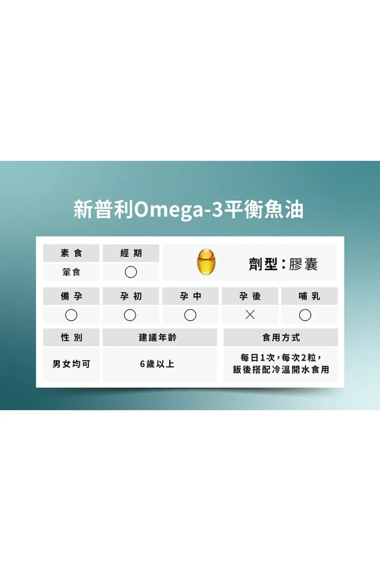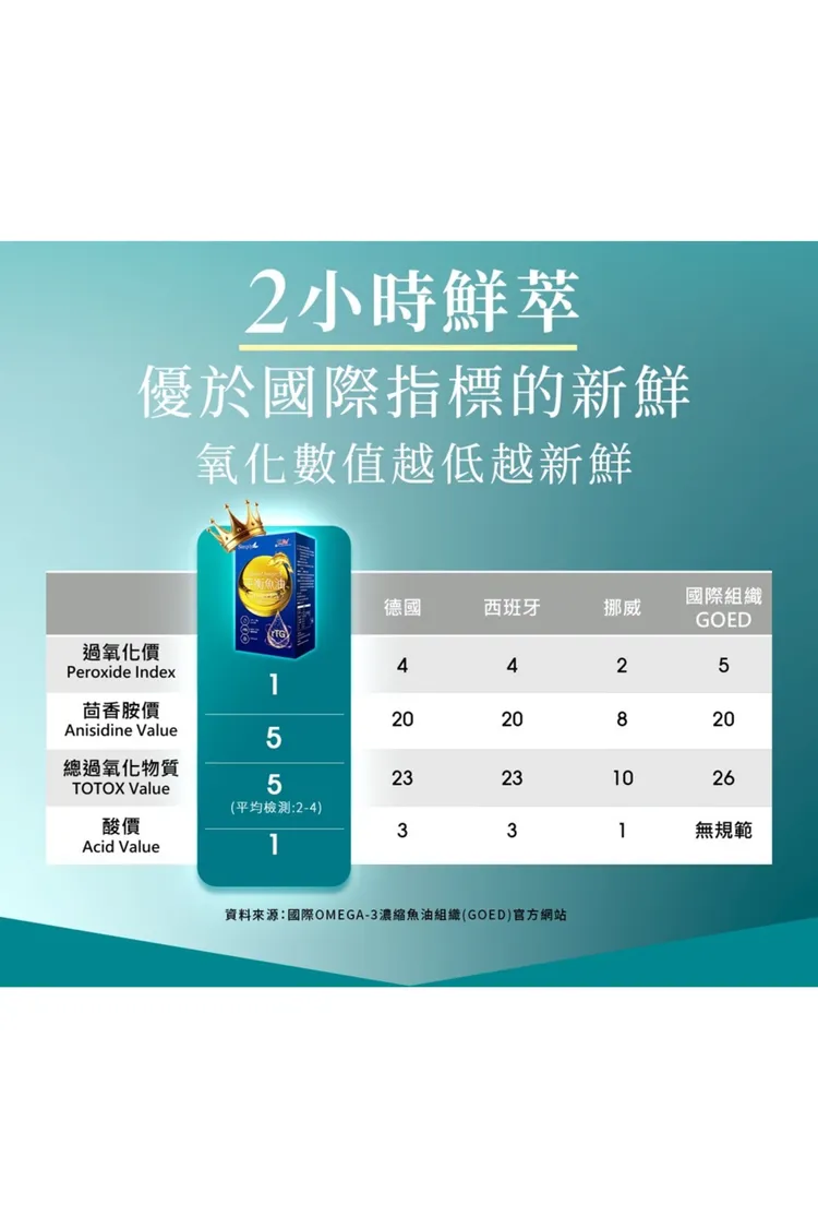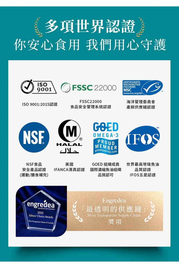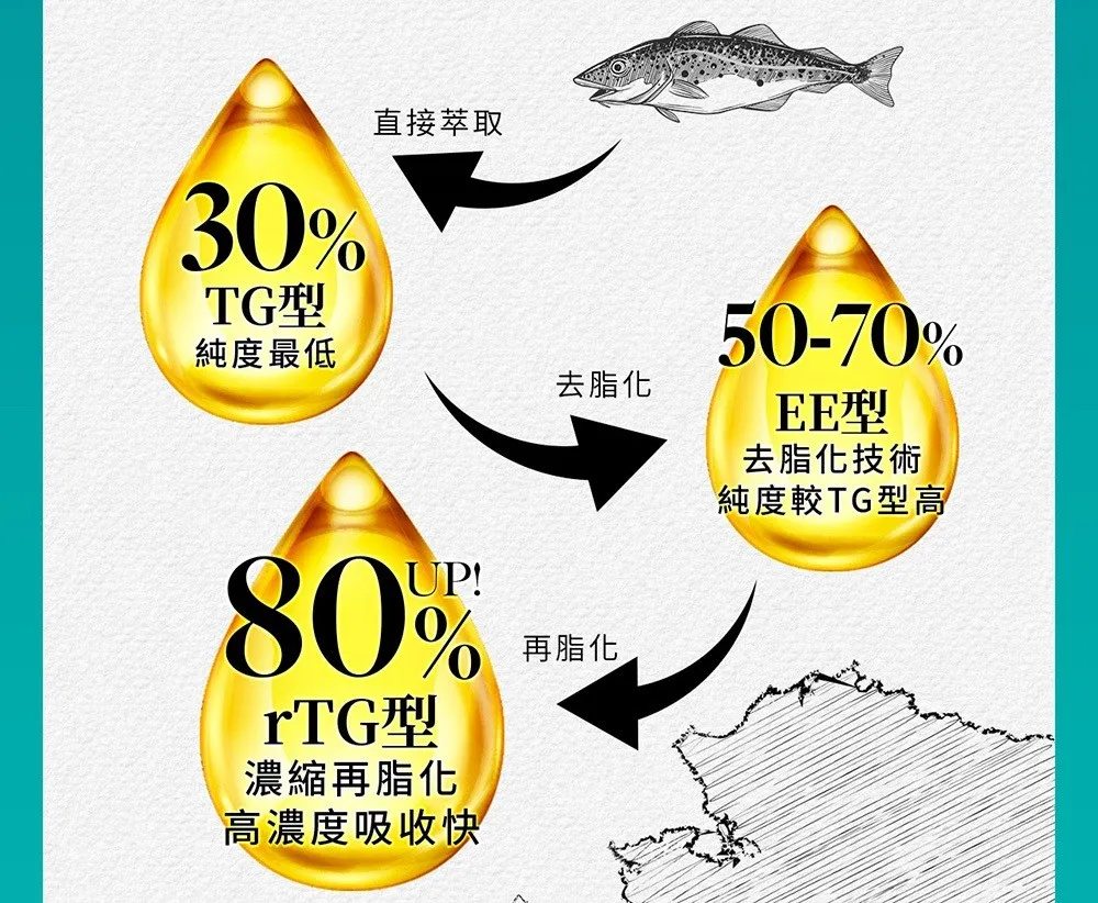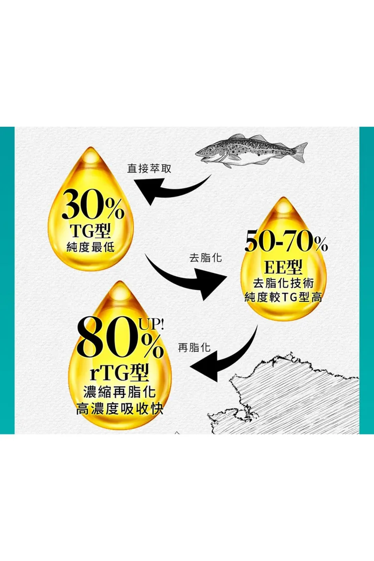 成分 : 高濃度Omega-3:rTG型態,EPA+DHA總含量高達80%。100%純魚油