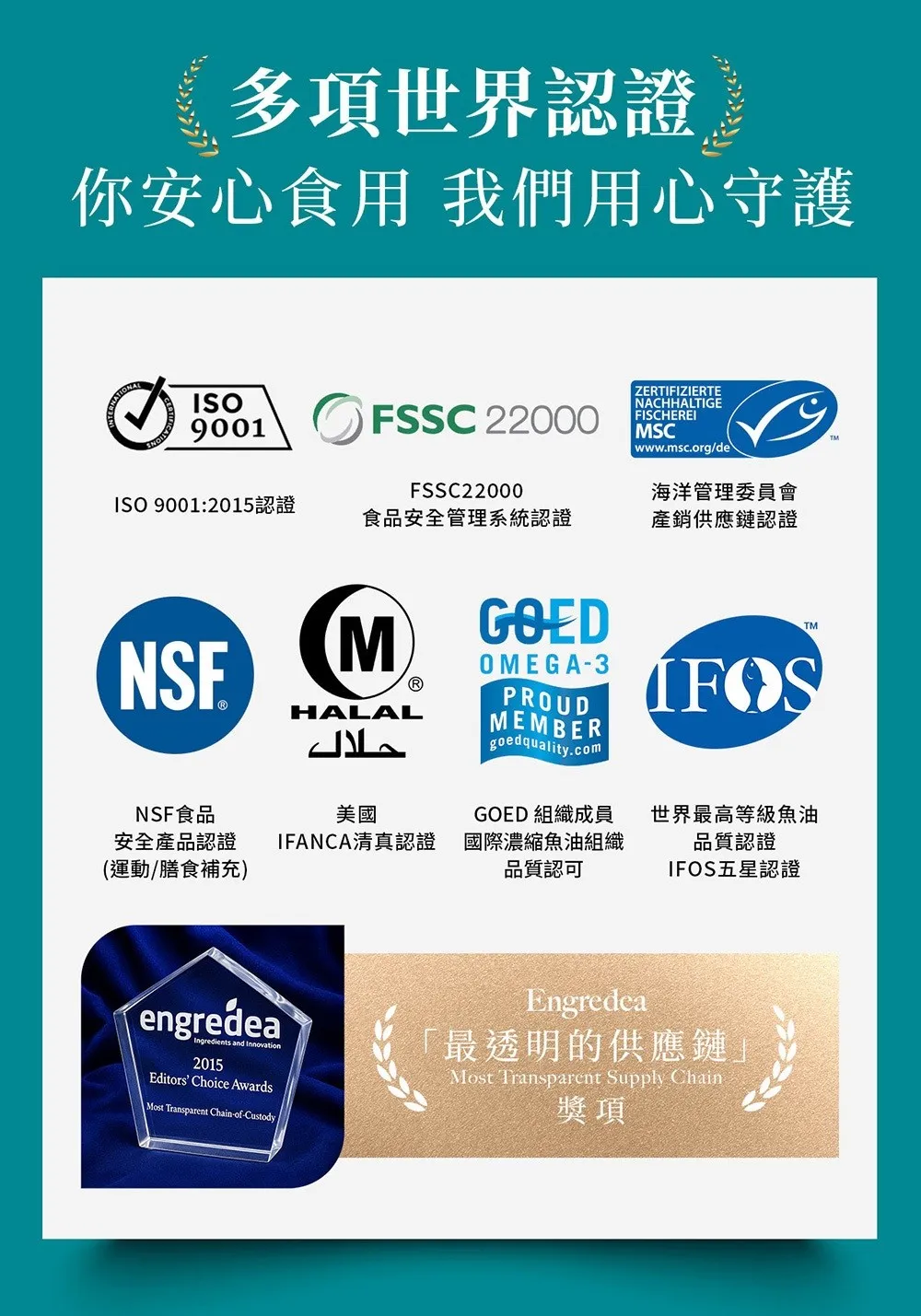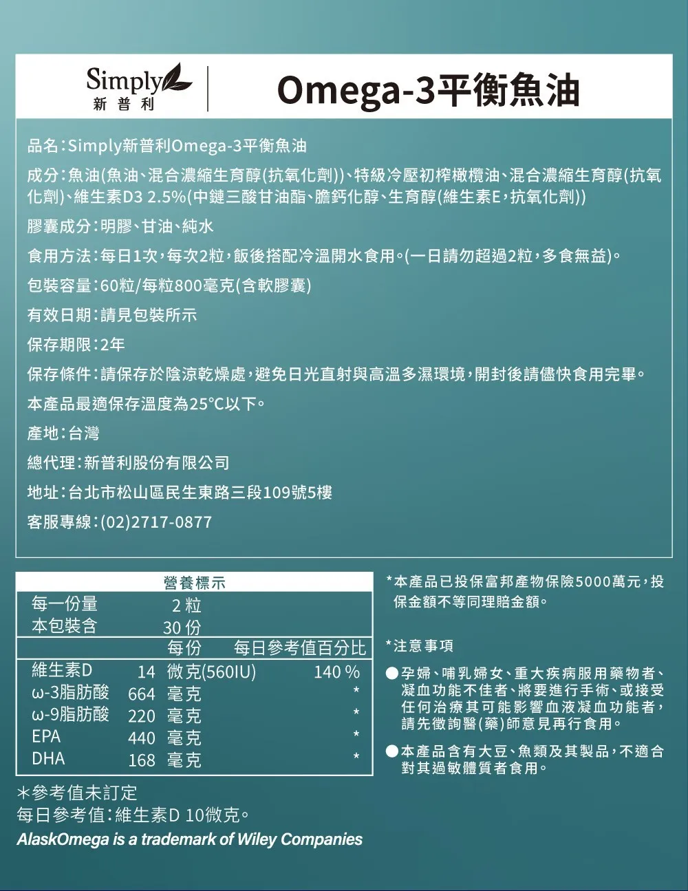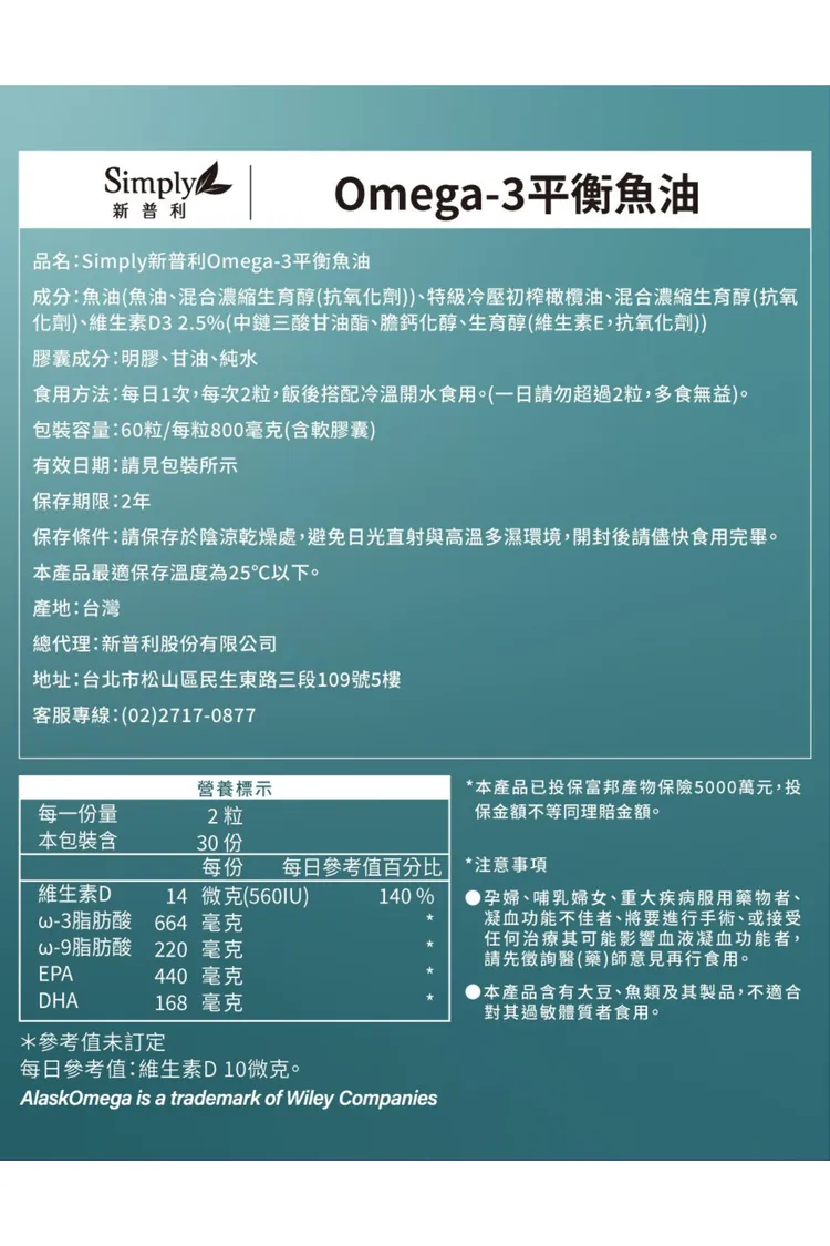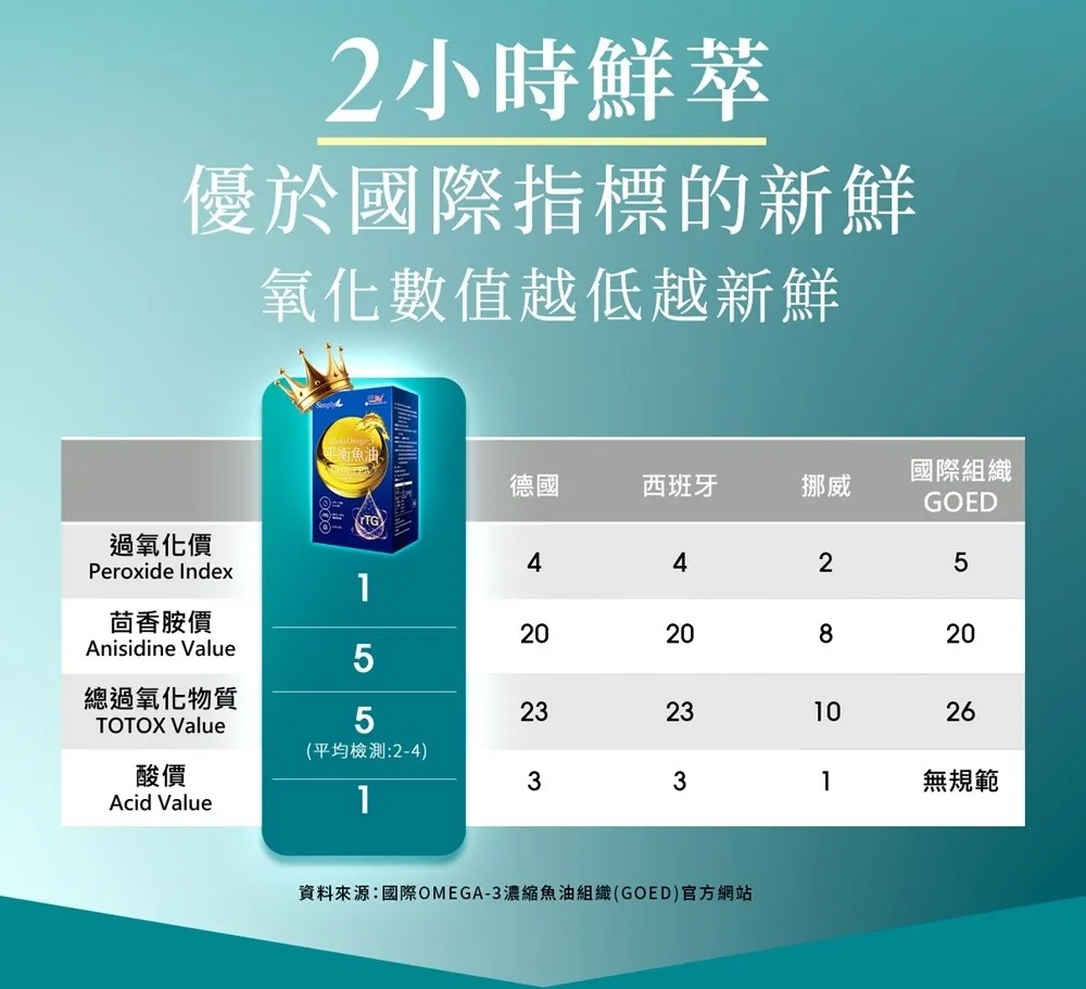 成分 : 高濃度Omega-3:rTG型態,EPA+DHA總含量高達80%。100%純魚油