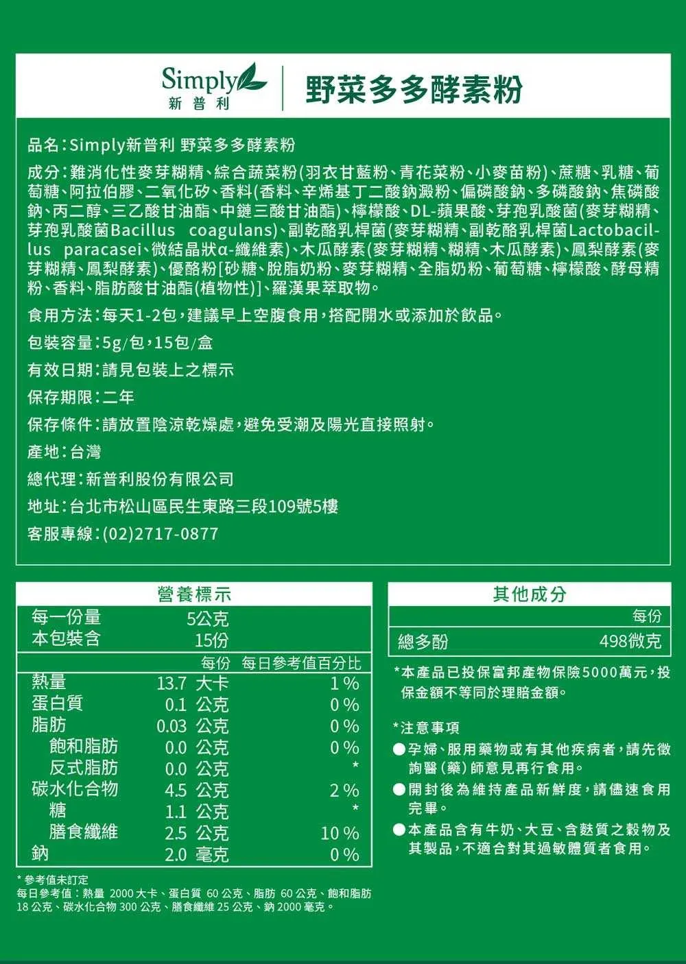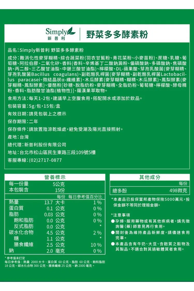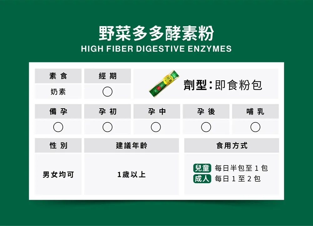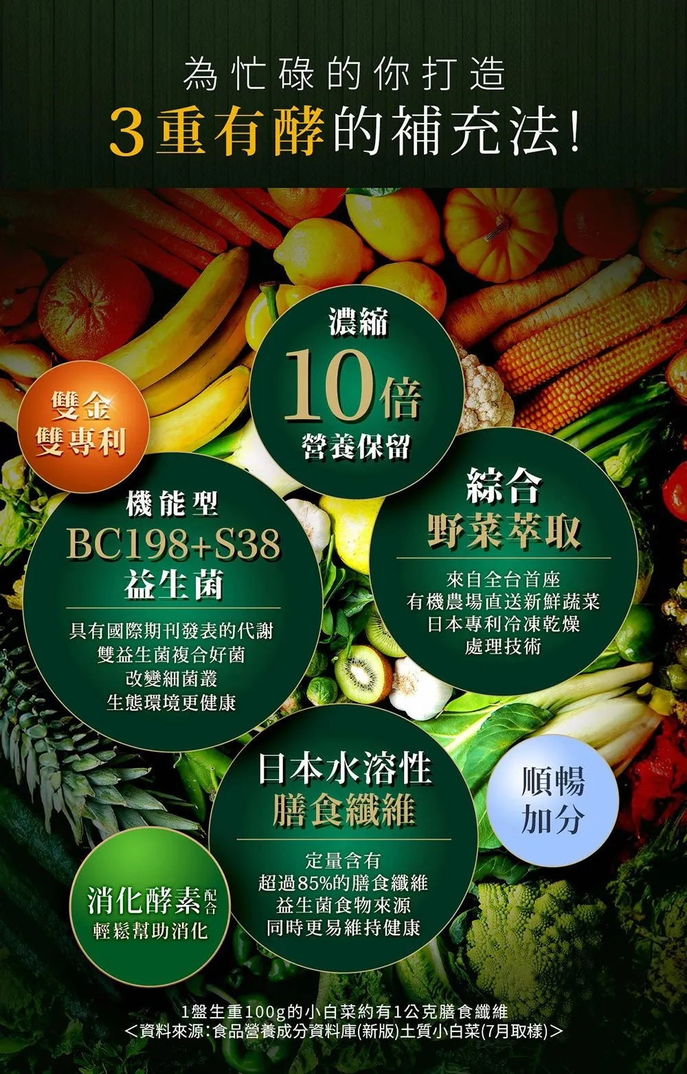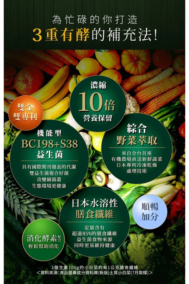 成分 : 水溶性膳食纖維+雙重好菌BC198+S38益生菌+雙蔬果酵素
