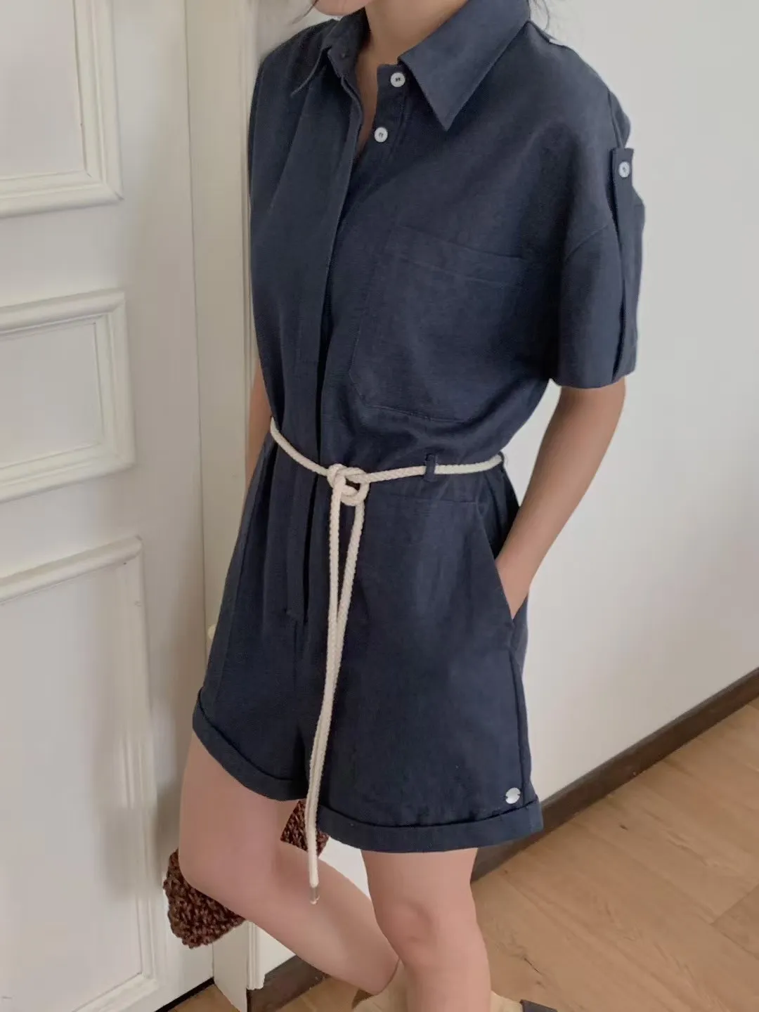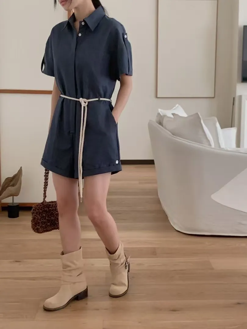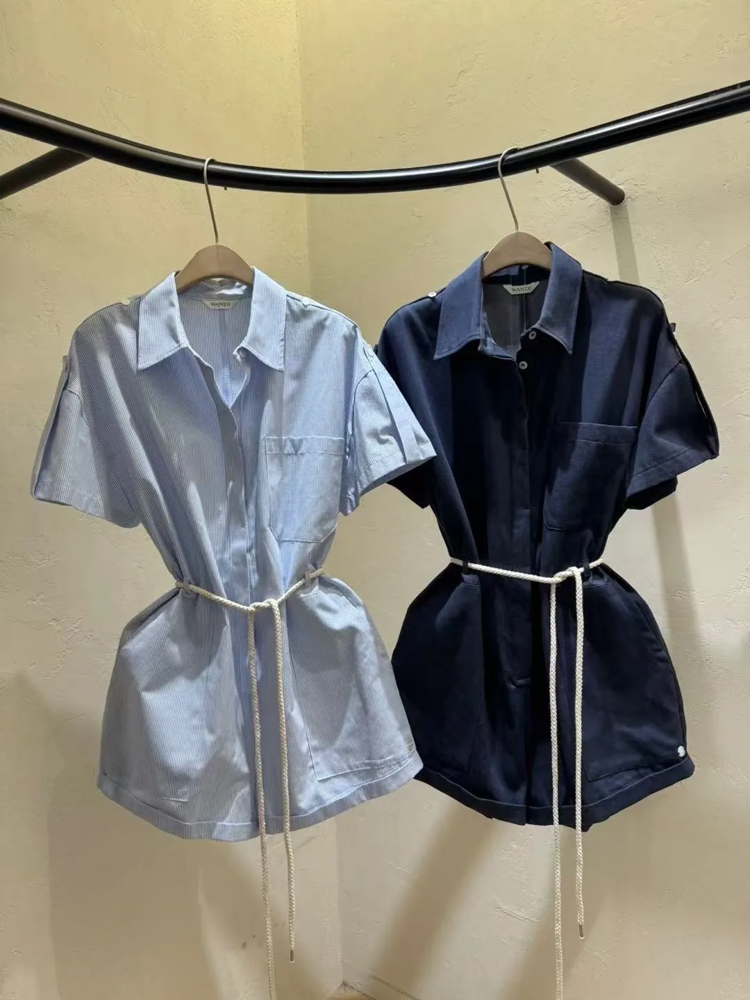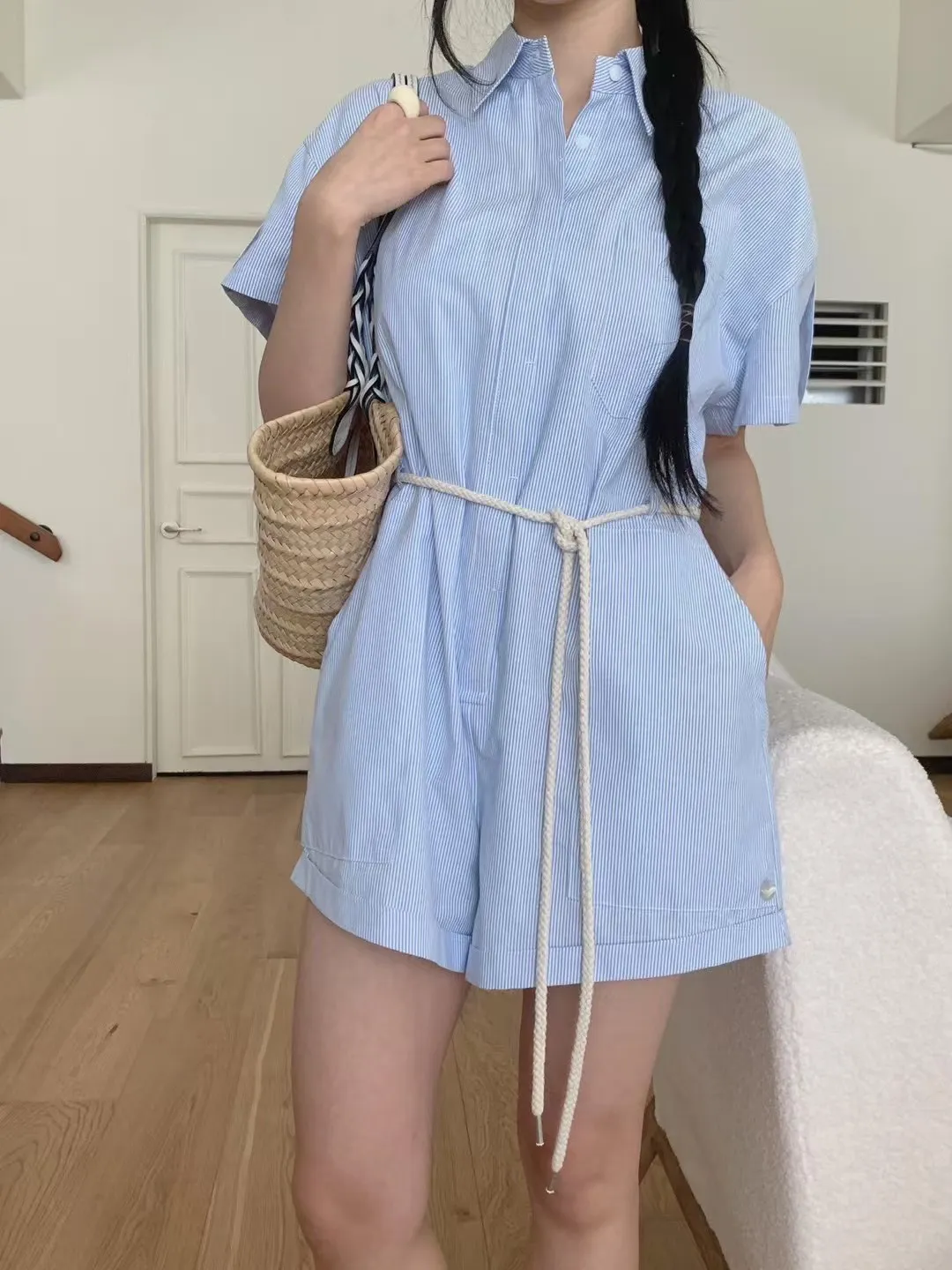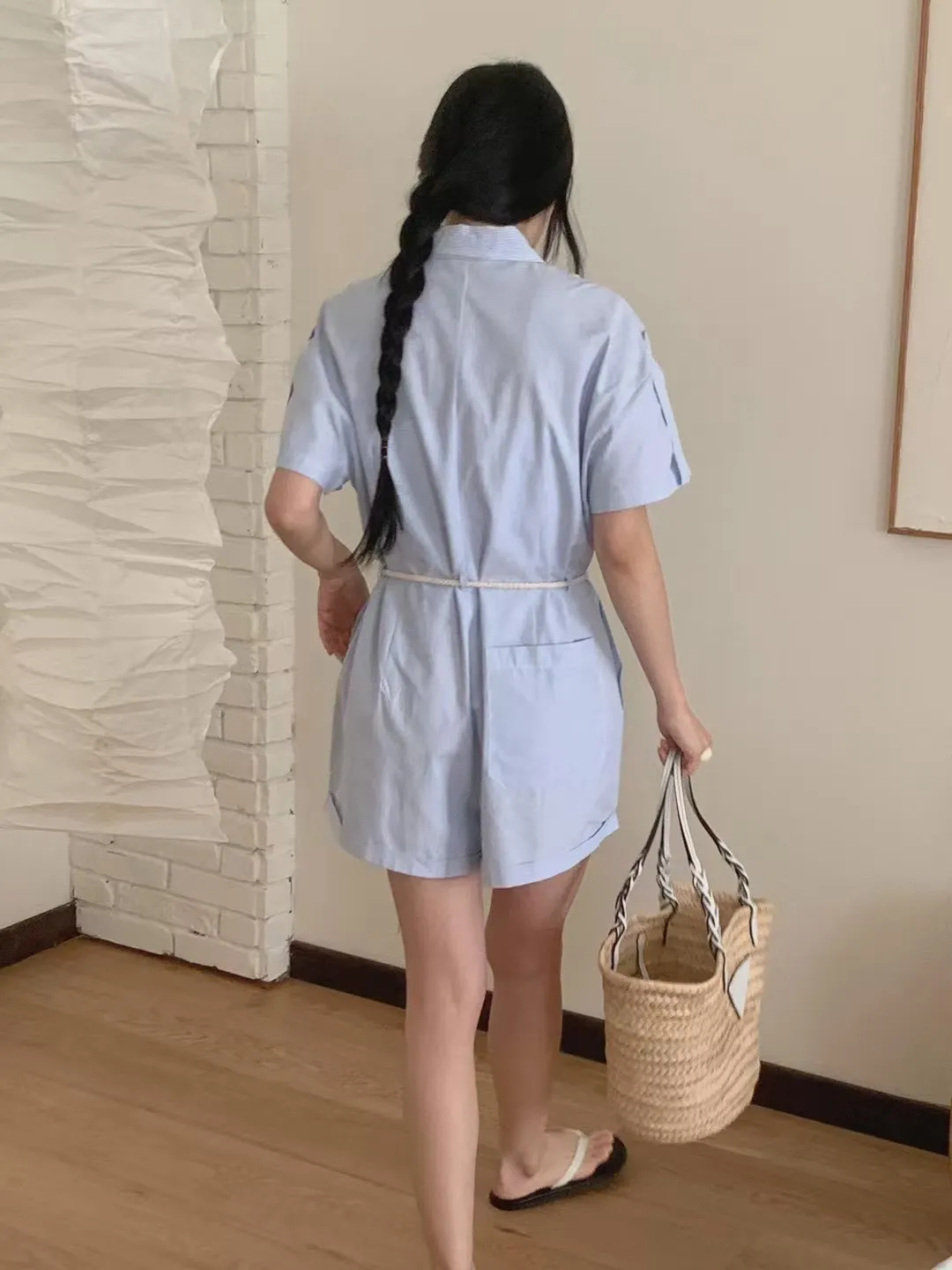 棉+聚酯 薄款面料 褲管反摺 排釦穿脫 有綁帶 淺藍是細條紋