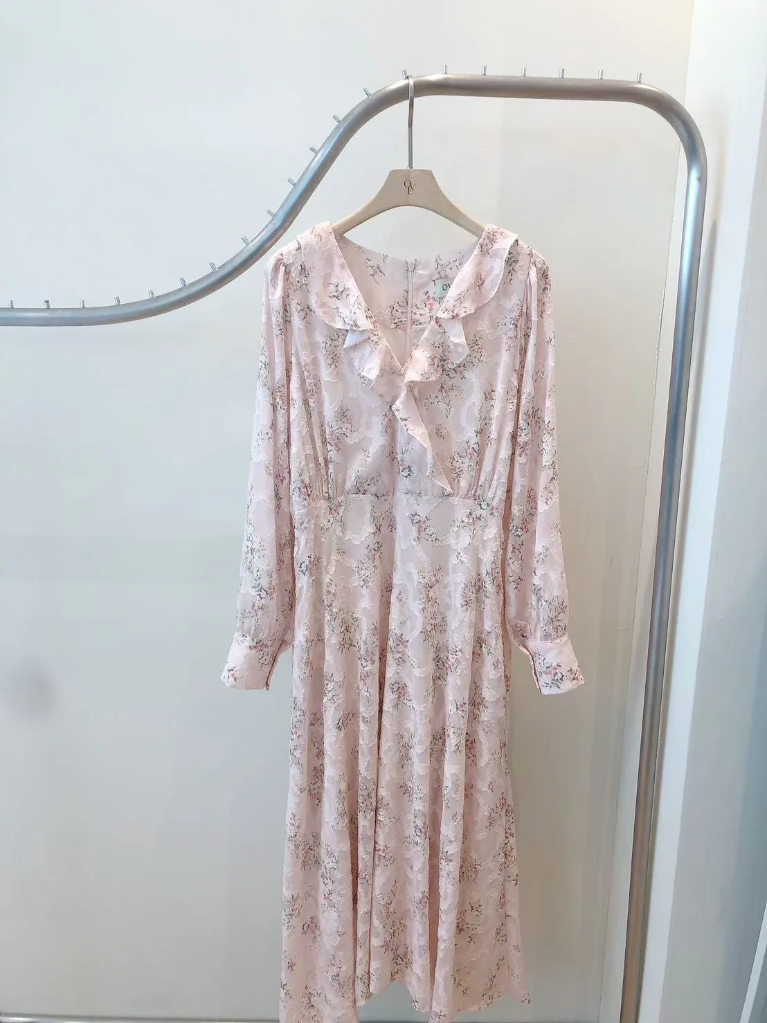雪紡 荷葉層次V領 立體花紋面料 後腰綁帶 袖口花朵釦 有內裡