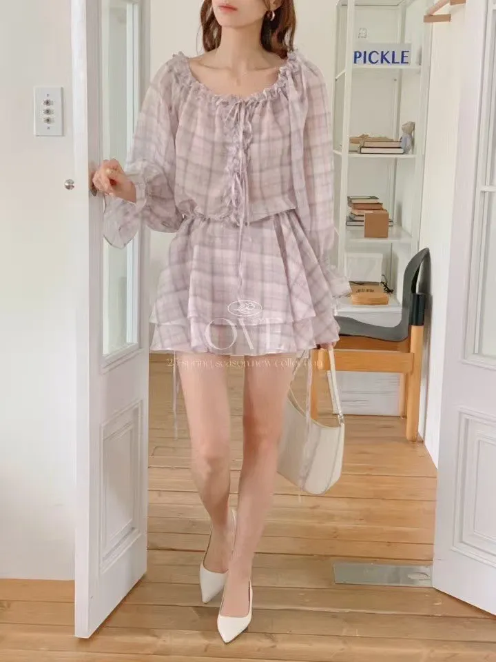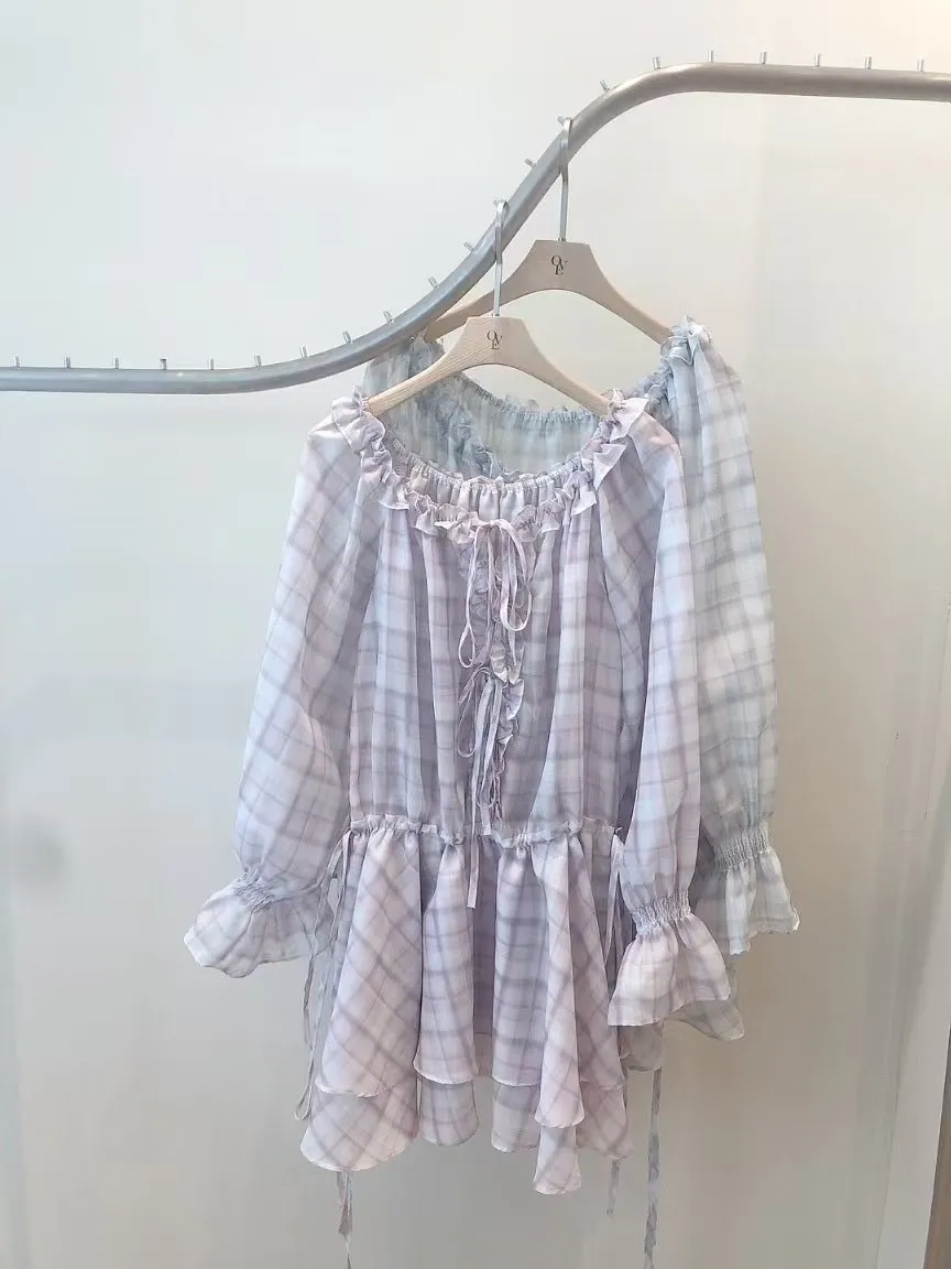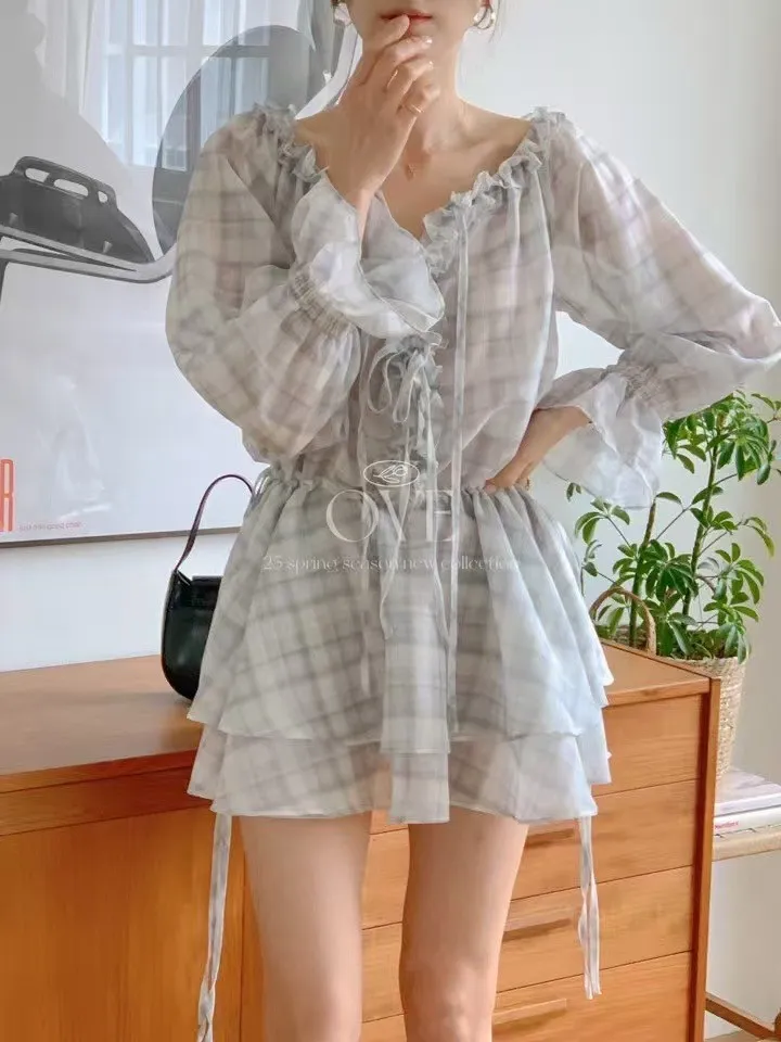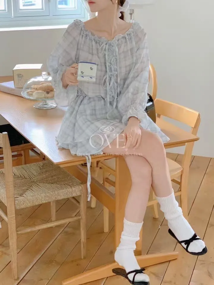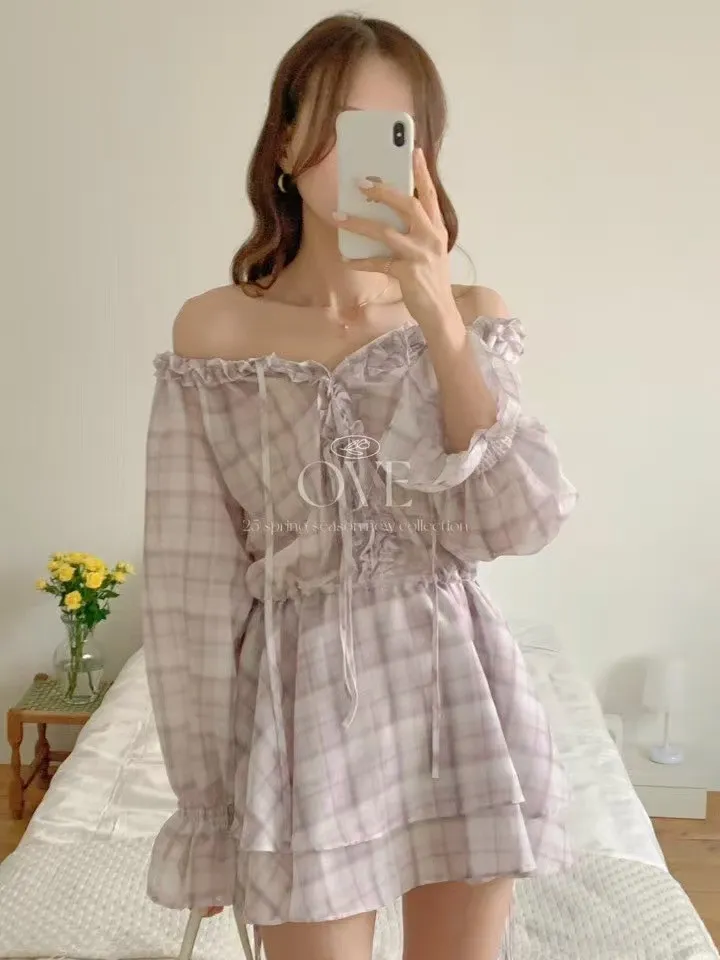 TW046日系浪漫格紋荷葉寬領洋裝 紫 灰 官網價$1470 線上價$1440