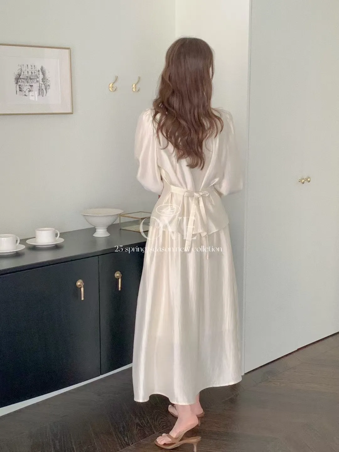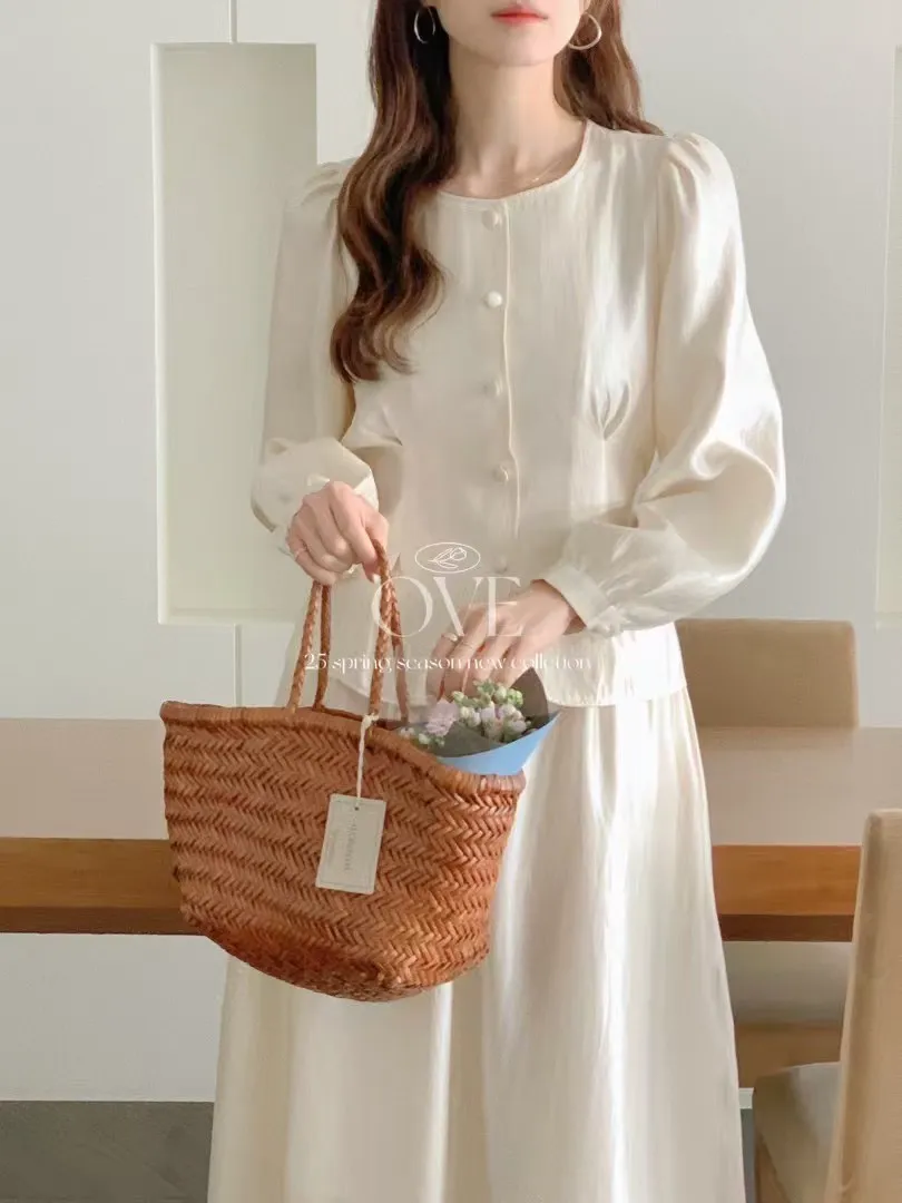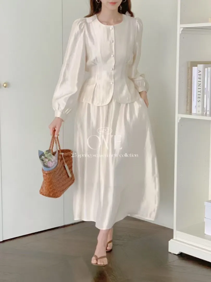 雪紡+人造絲 光澤感高級面料 腰身款上衣 腰鬆緊裙子