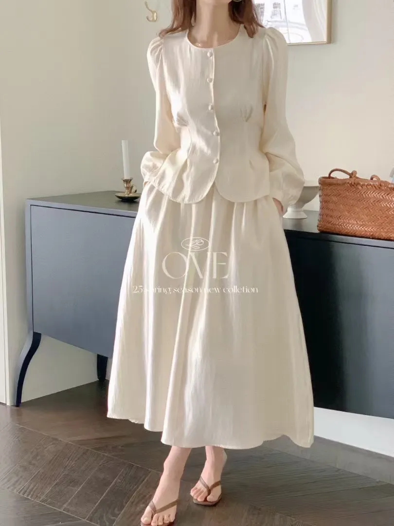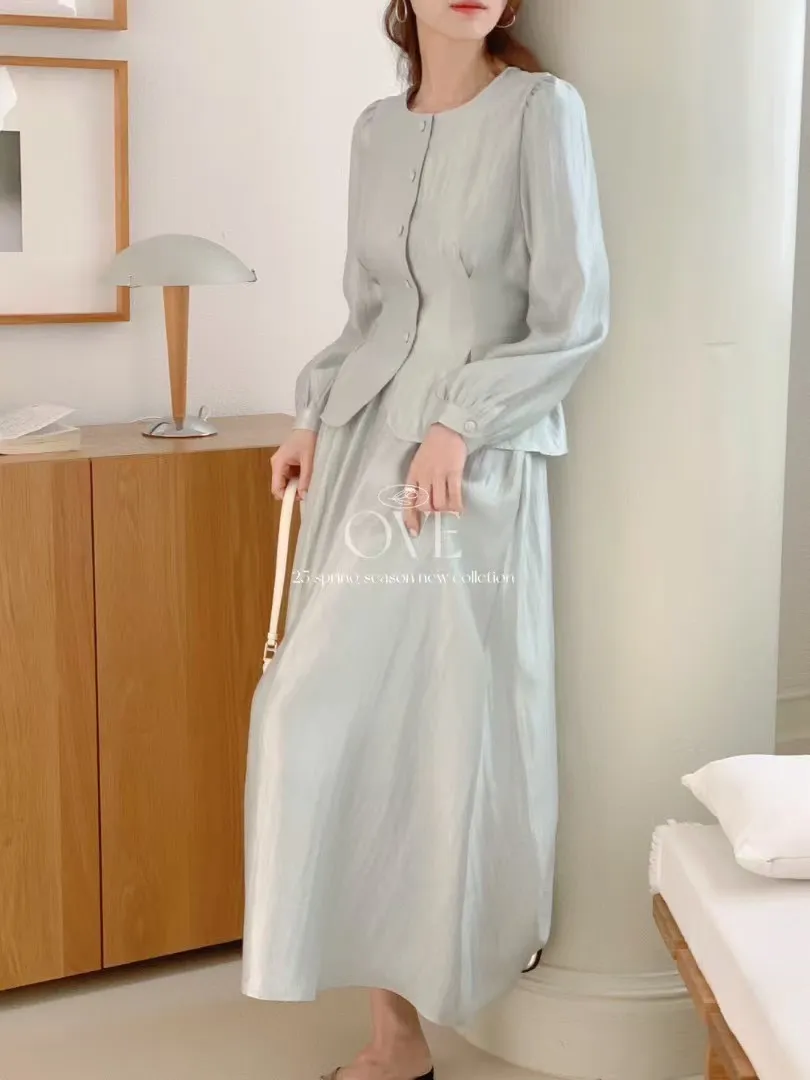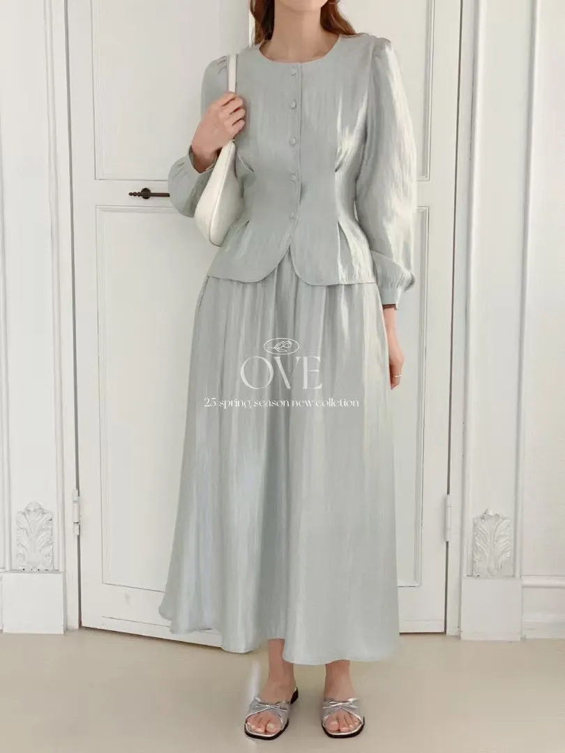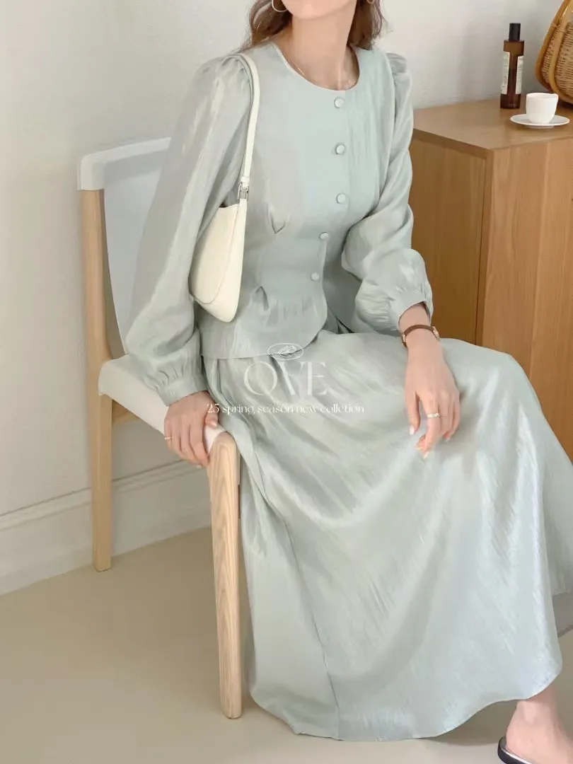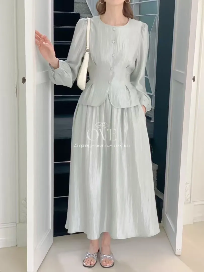 TW052光澤感套裝組(上衣+裙子) 米 綠 官網價$1980 線上價$1950