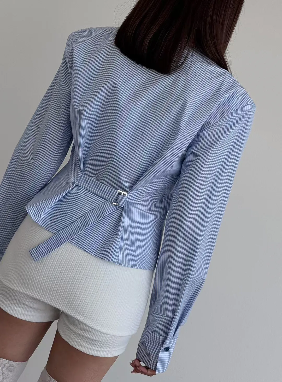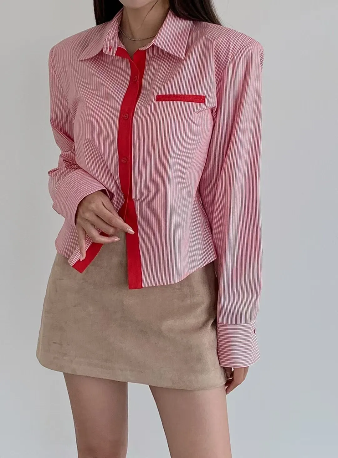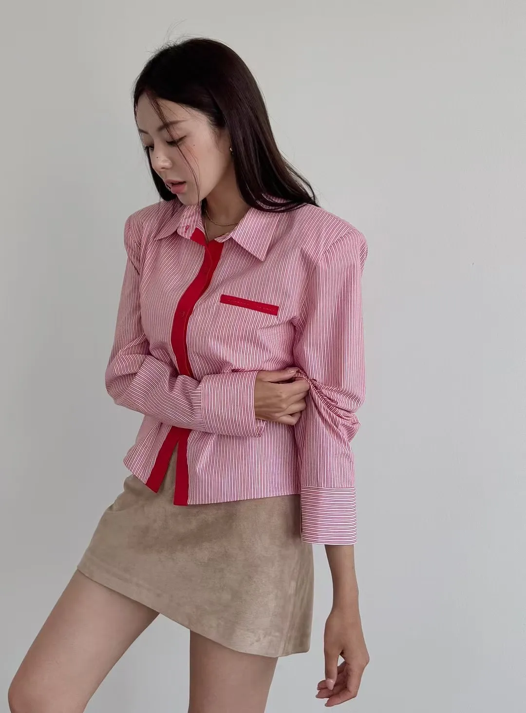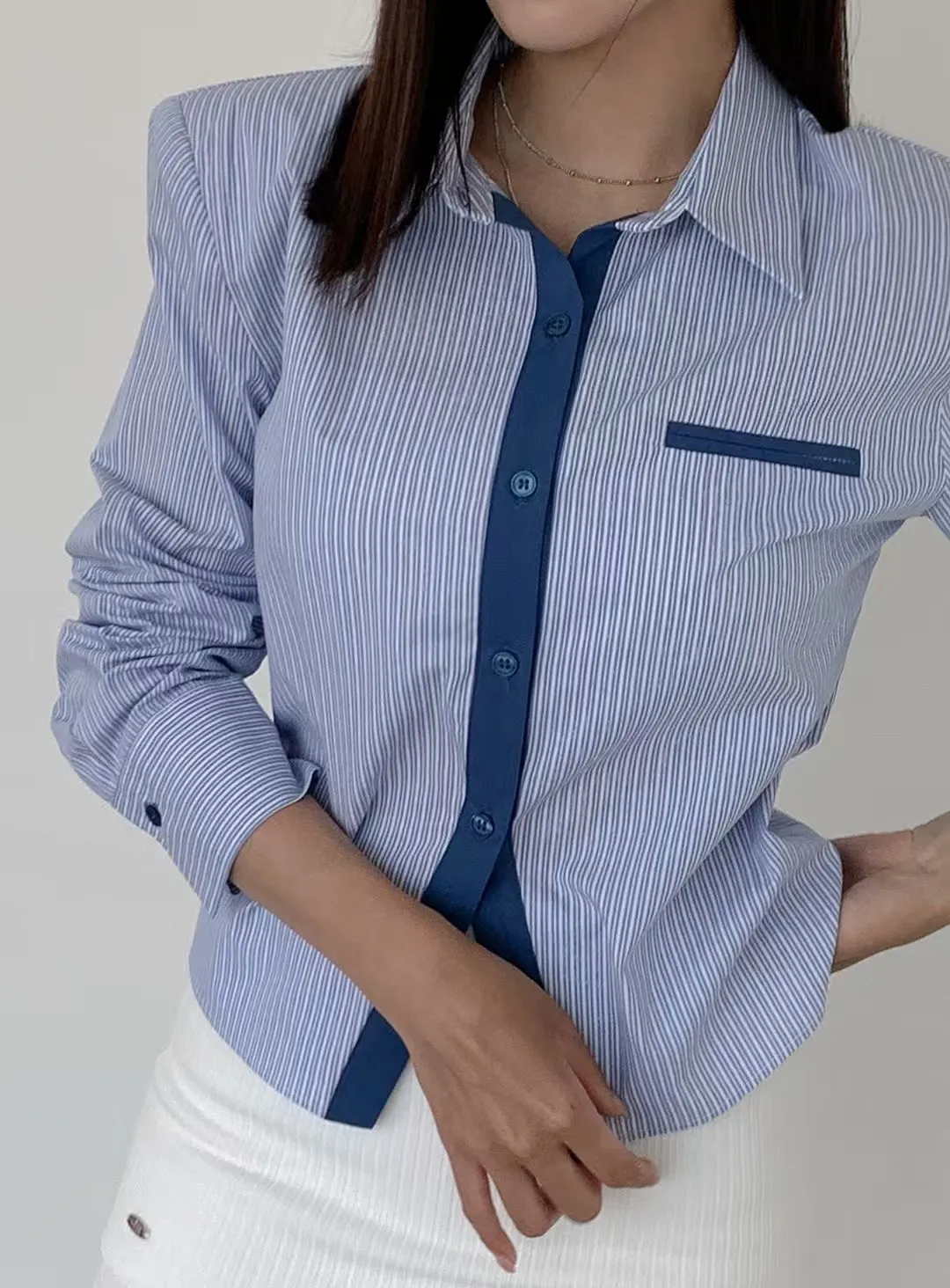 棉 有墊肩 胸前假口袋 跳色釦設計 細直條紋