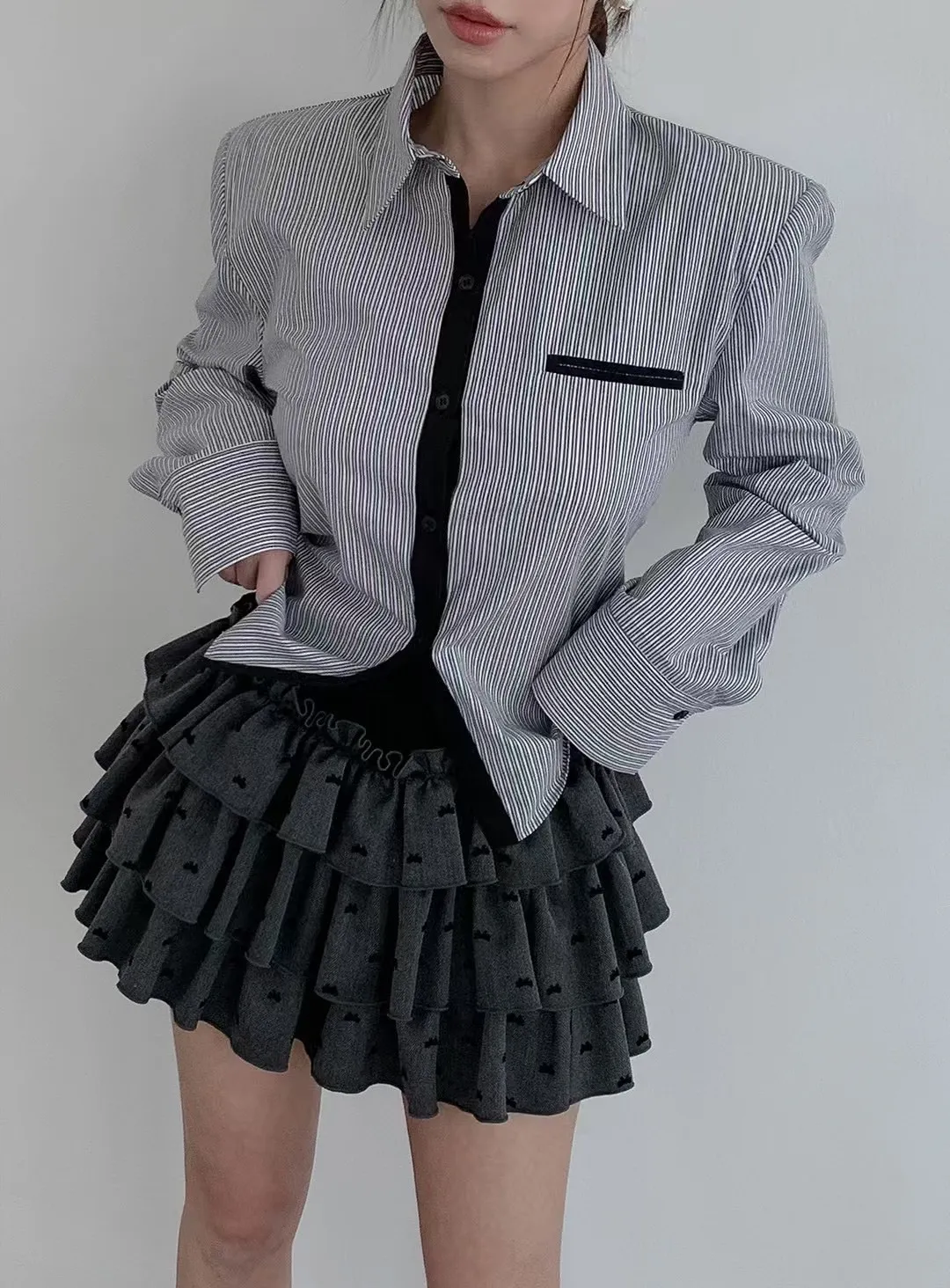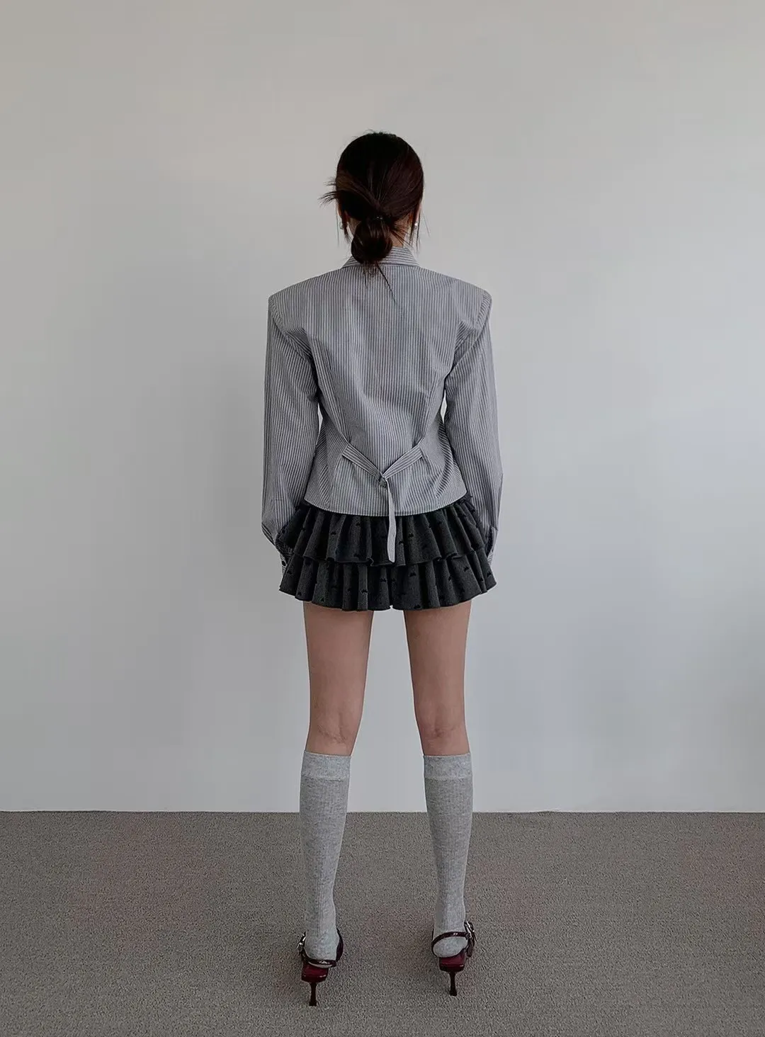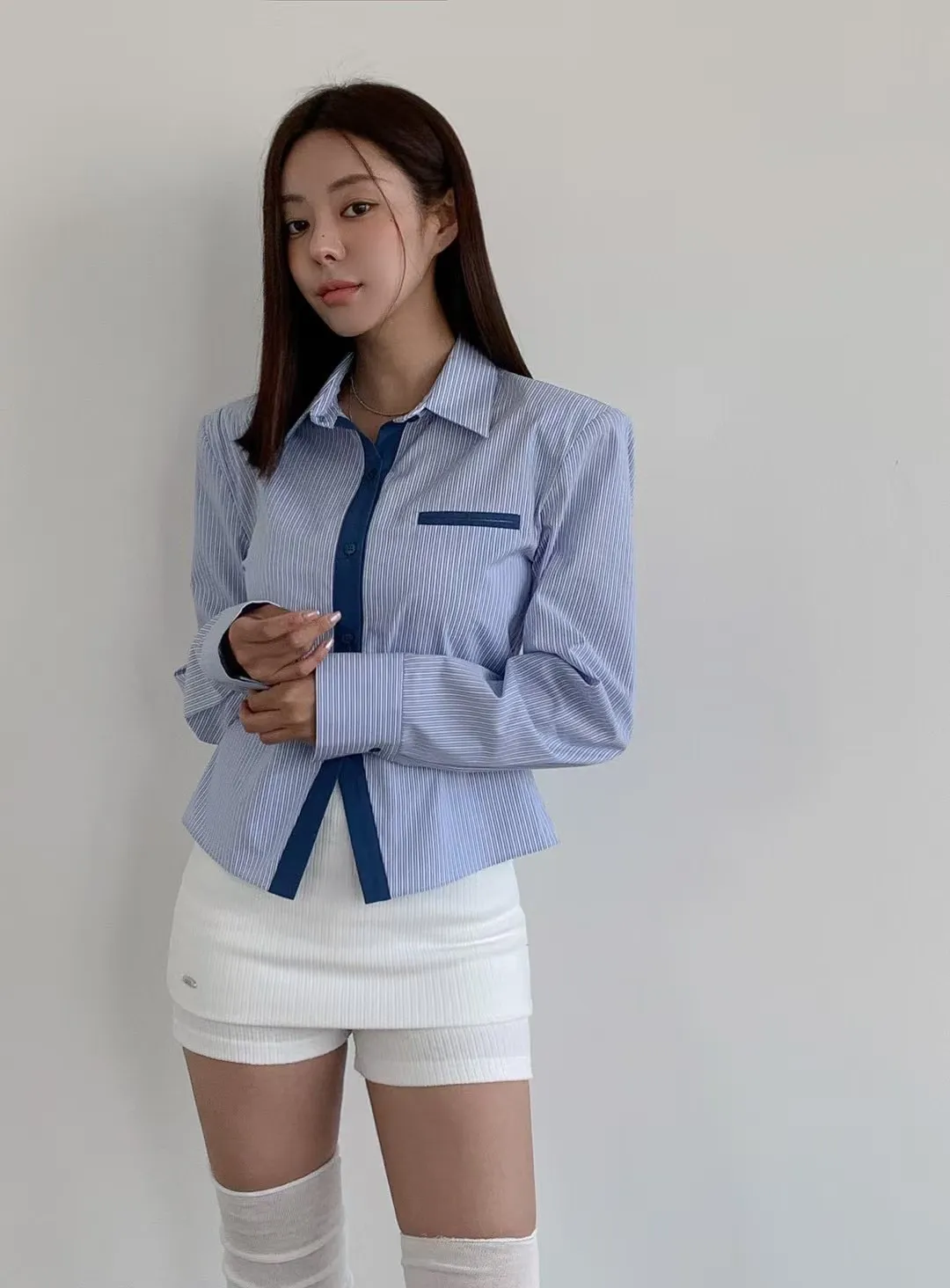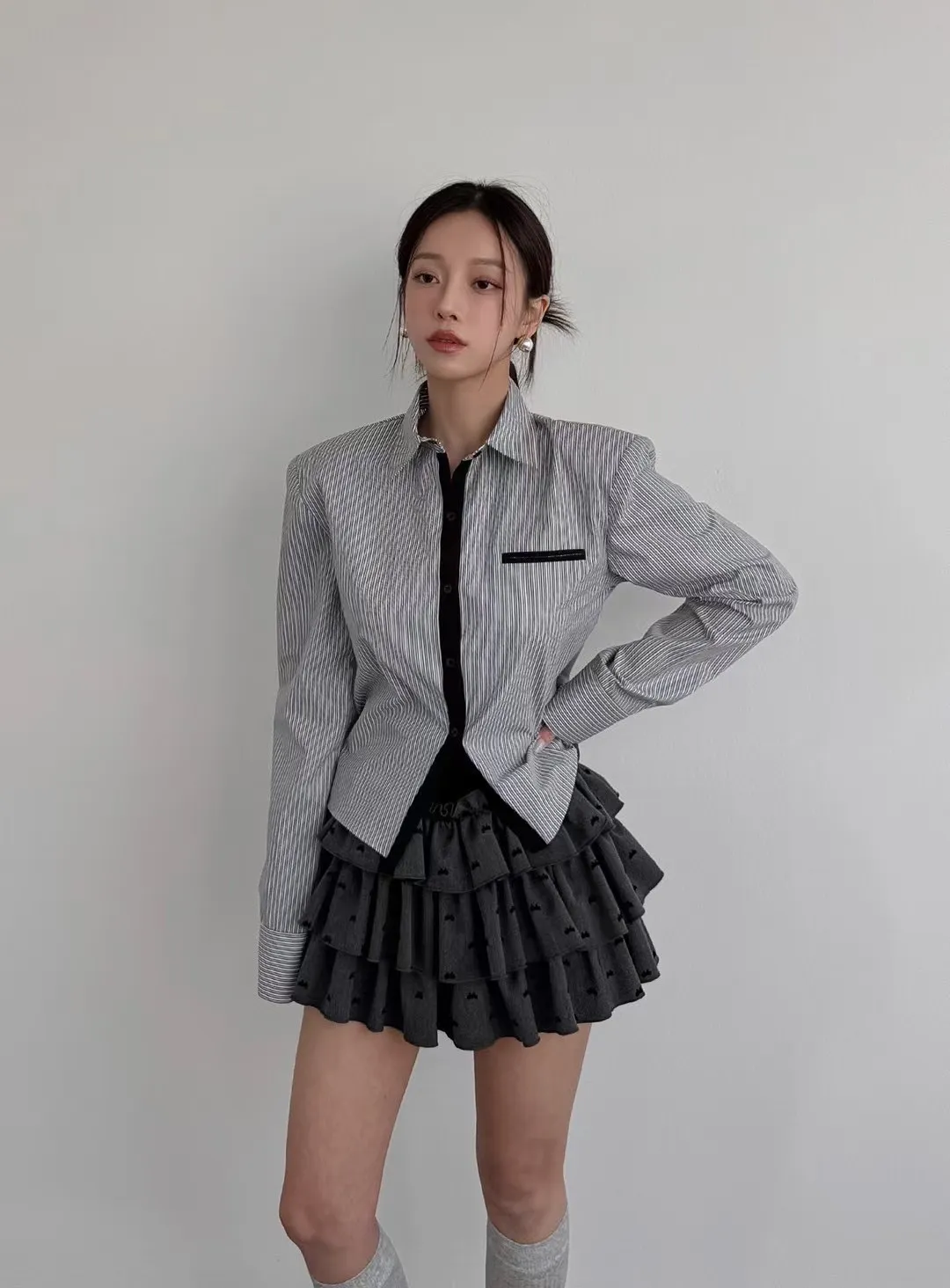 棉 有墊肩 胸前假口袋 跳色釦設計 細直條紋