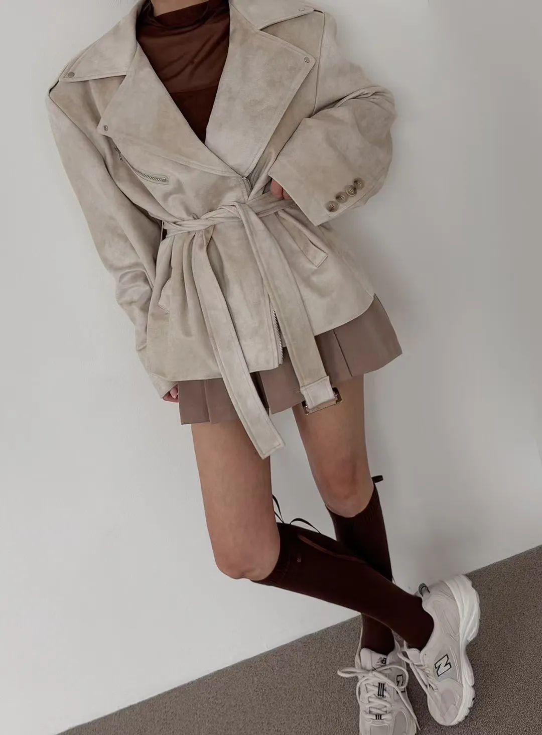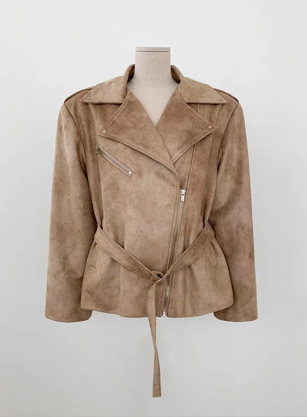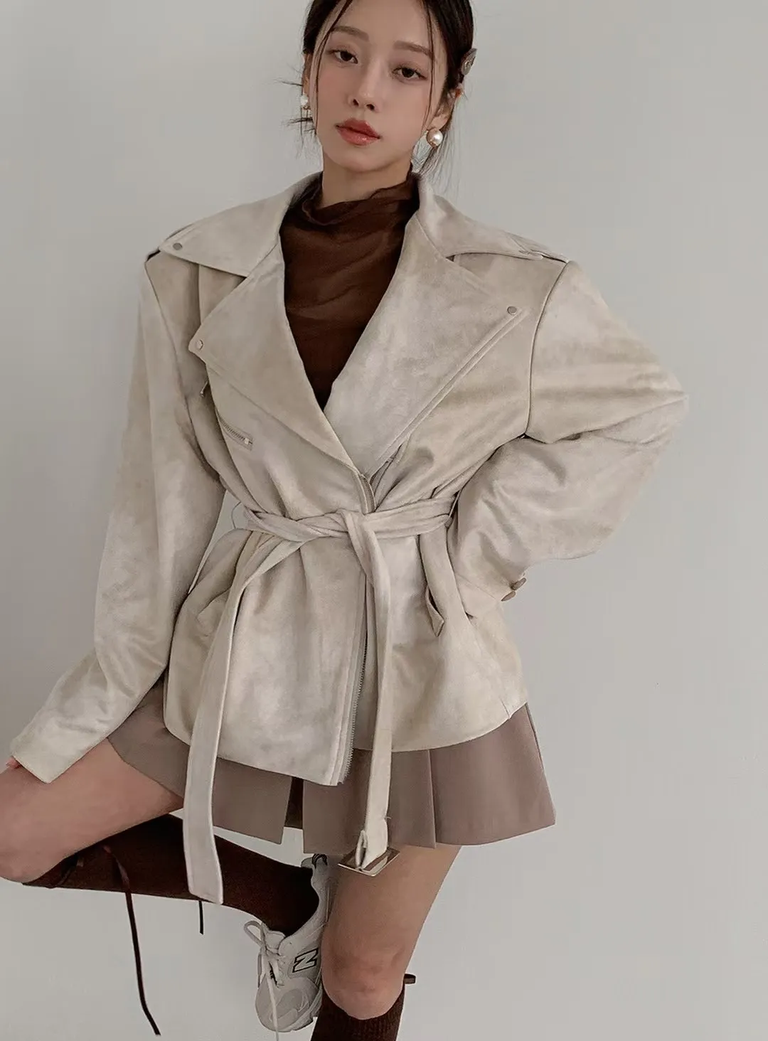 TW090潮流大翻領後腰綁帶麂皮外套 米 奶茶 官網價$2920 線上價$2890