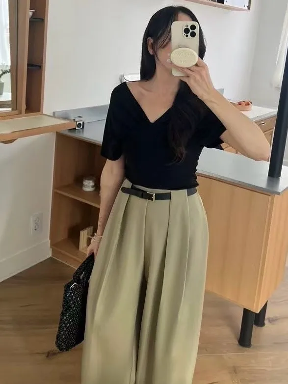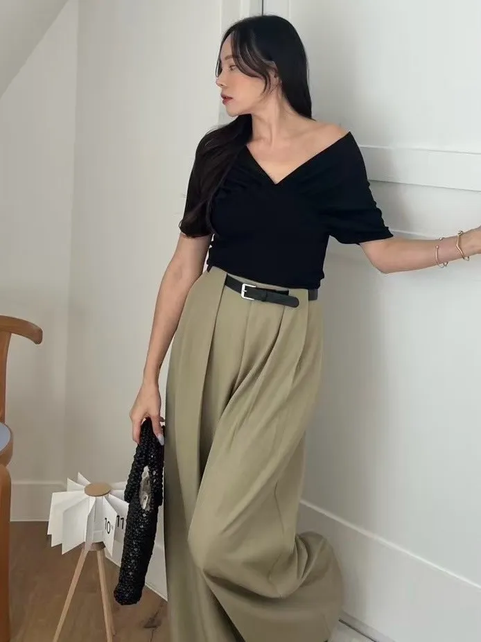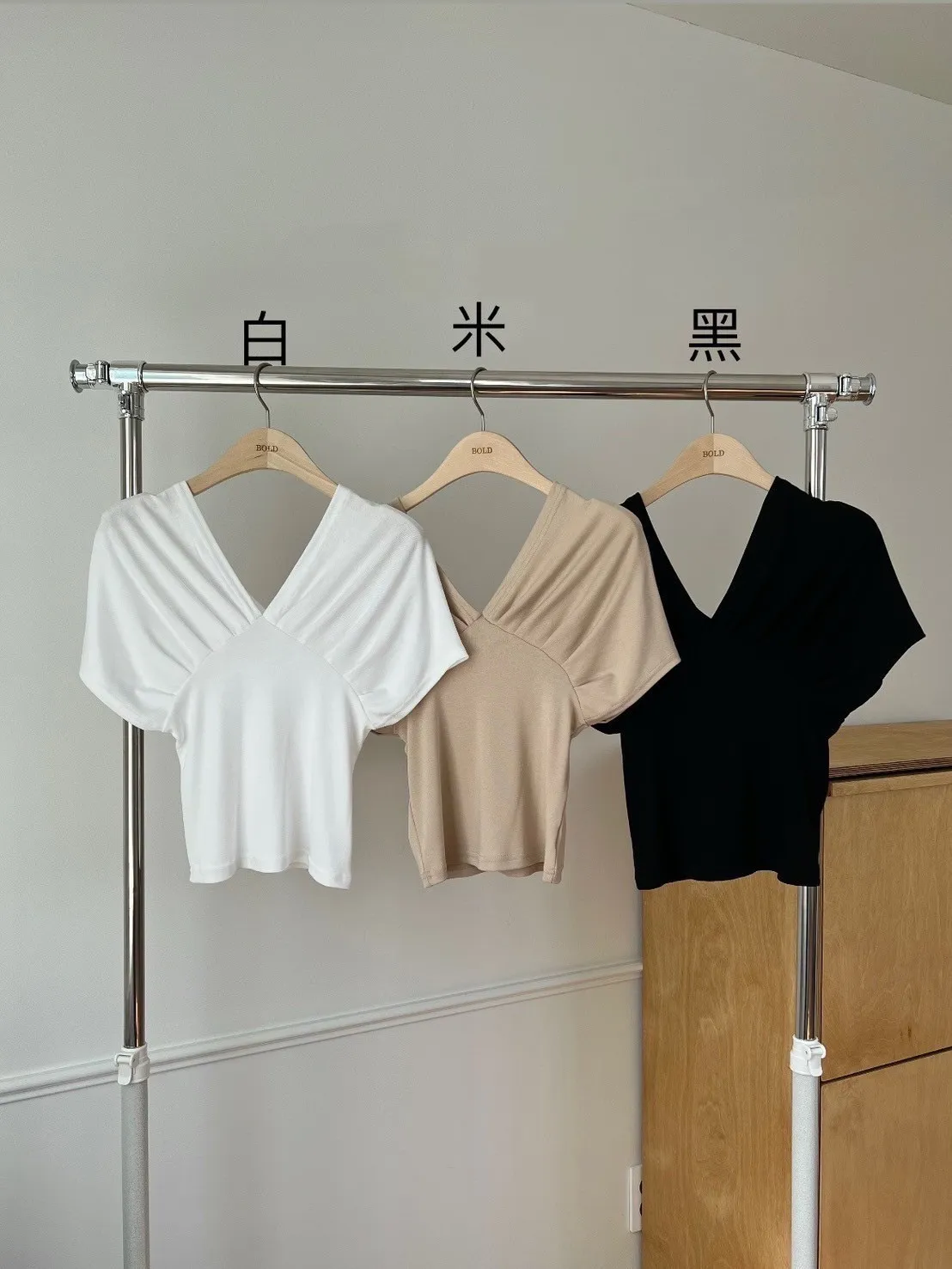 棉+彈力 莫代爾Q軟感 V領抓皺美肩設計 小露鎖骨微性感